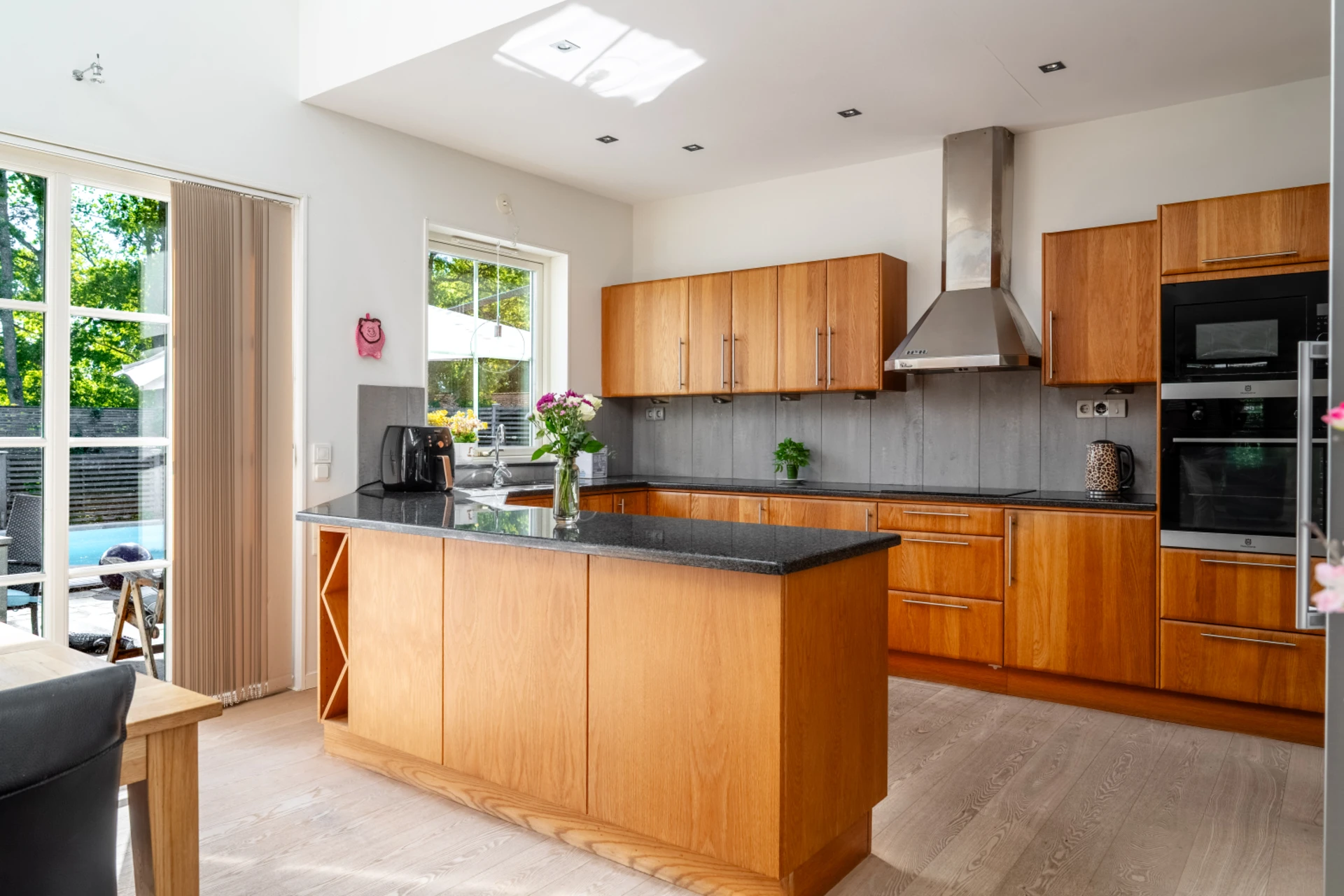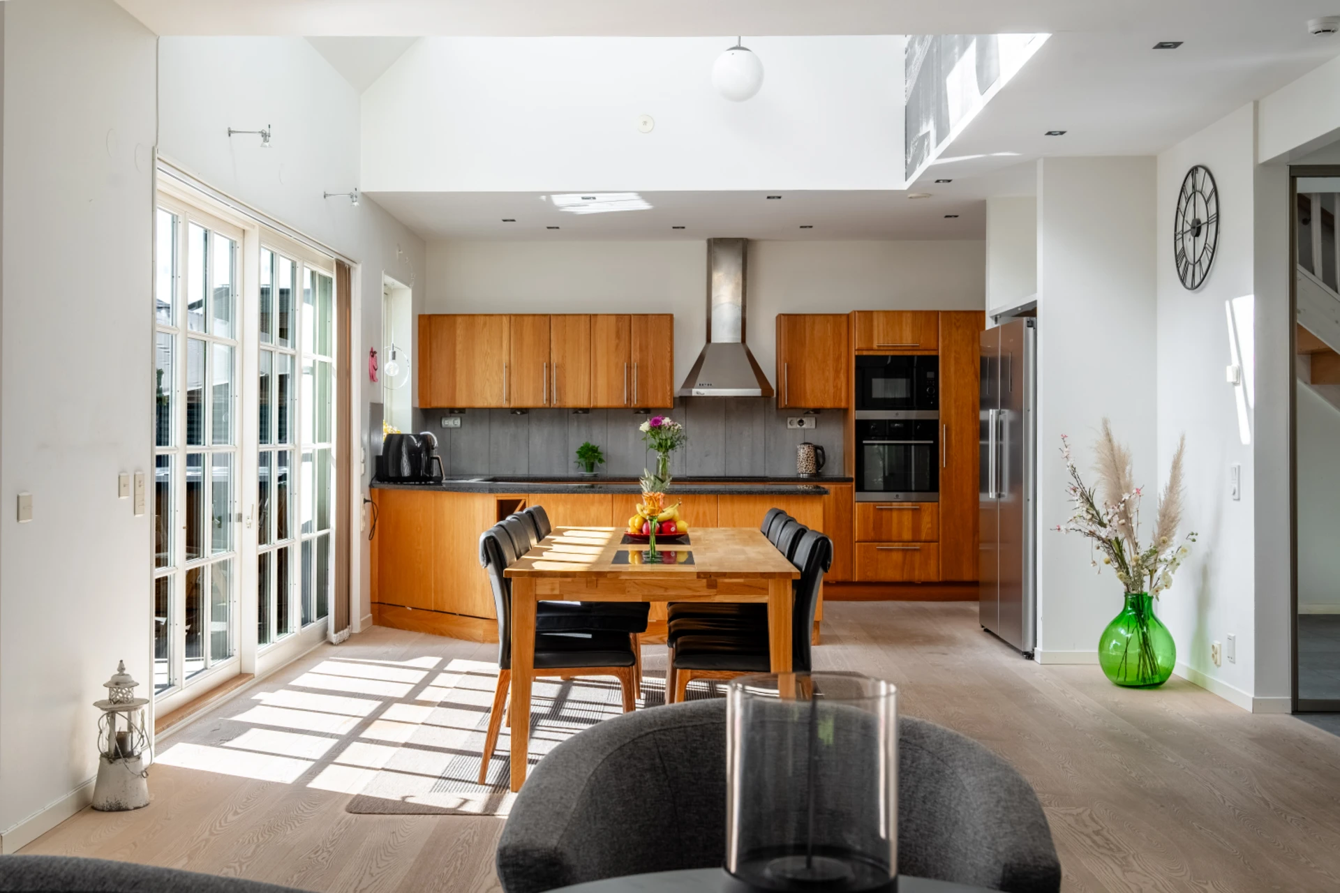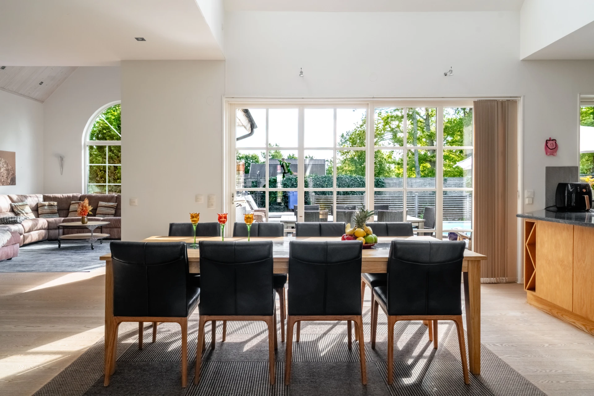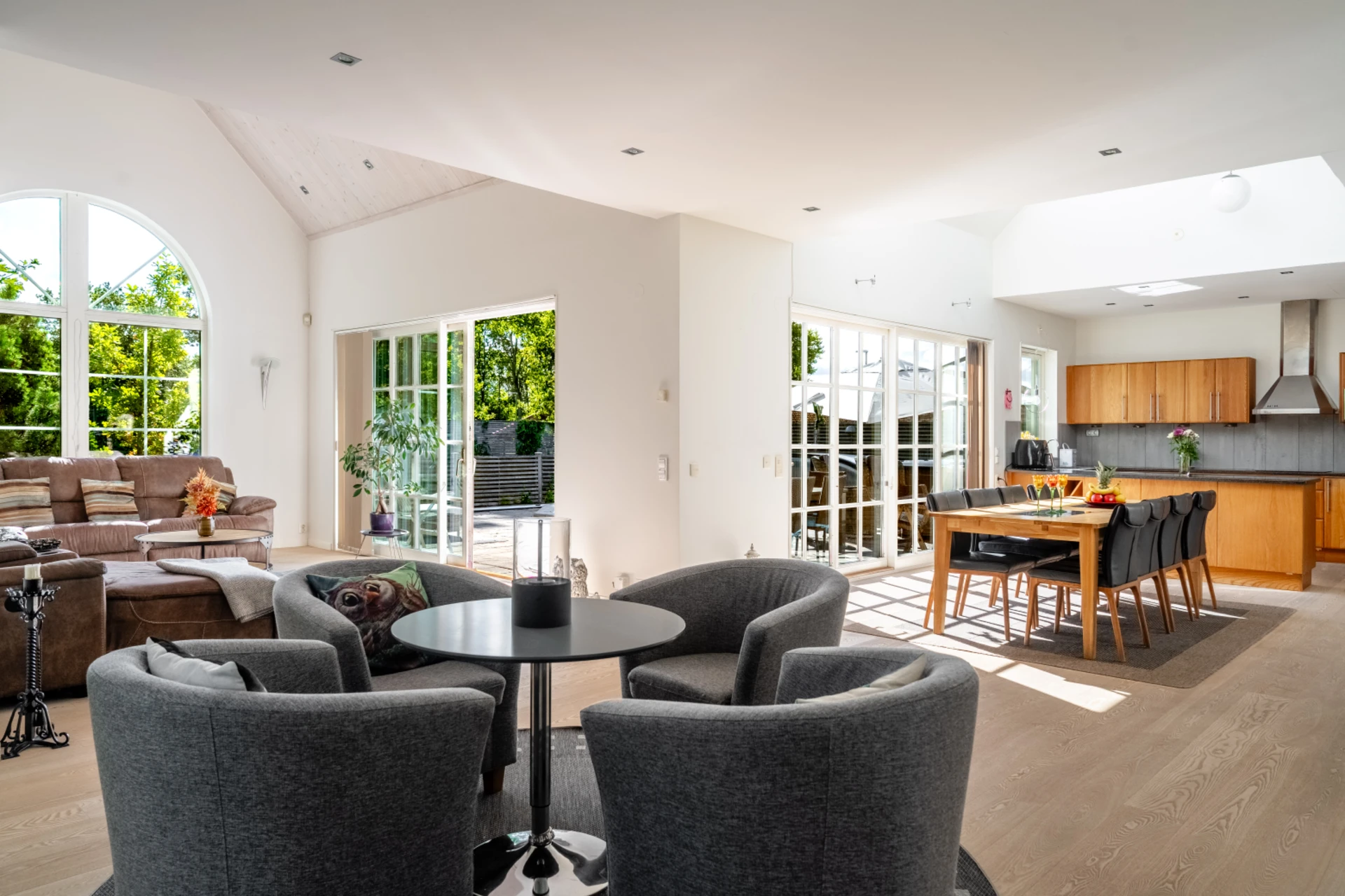 Ljust och luftigt tack vare stora fönsterpartier, skjutdörrar och öppet upp i nock. Här kombineras ett funktionellt kök med generösa arbetsytor och förvaring med en matplats för många gäster.