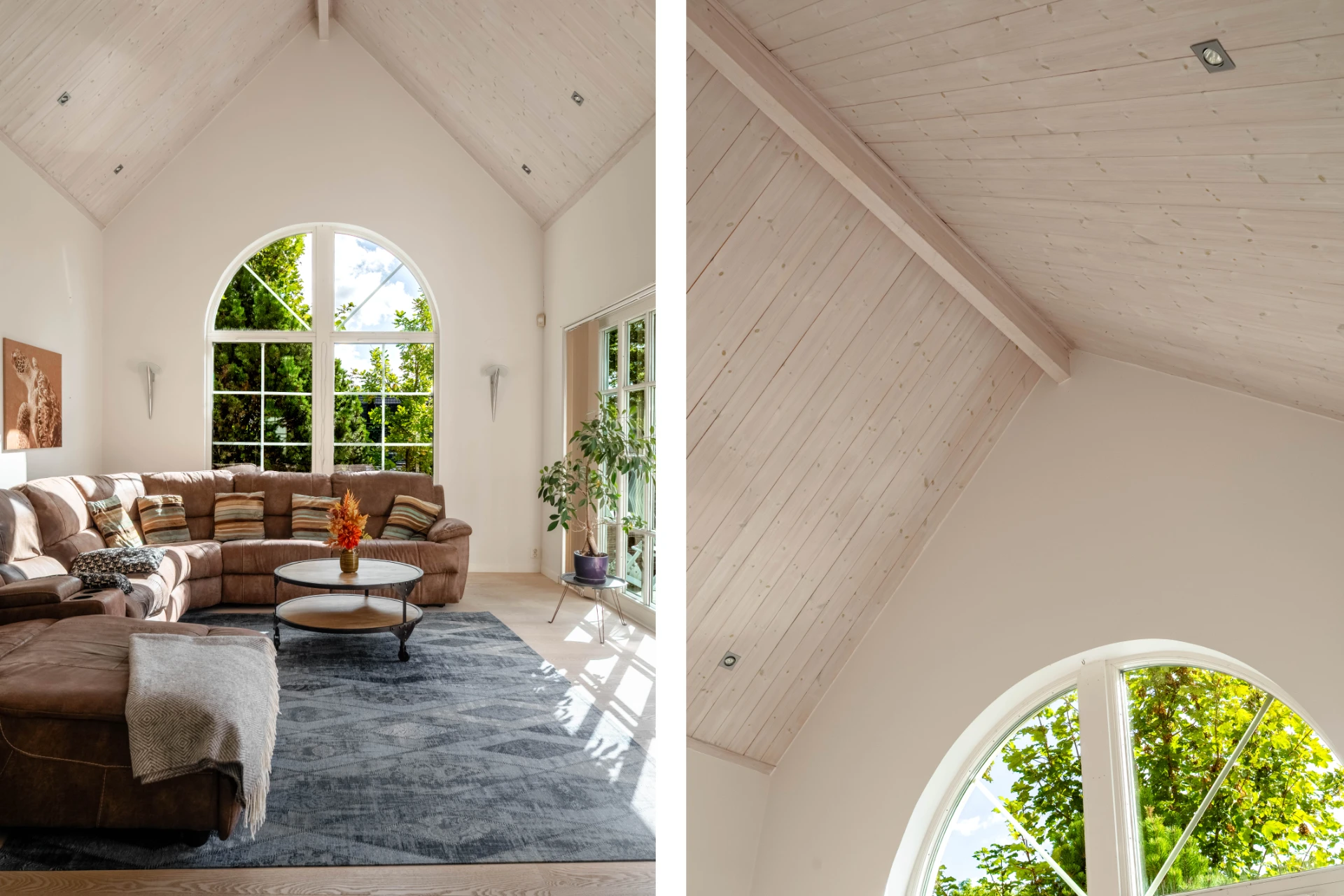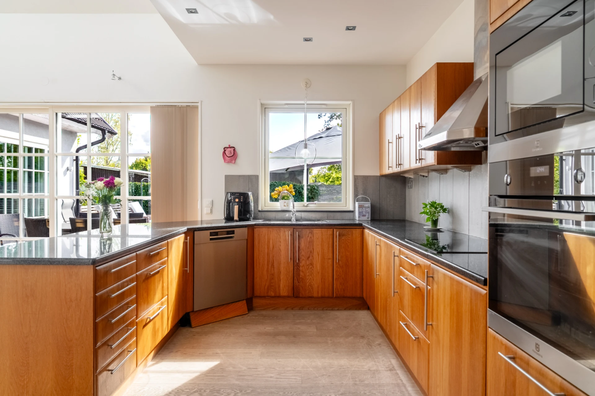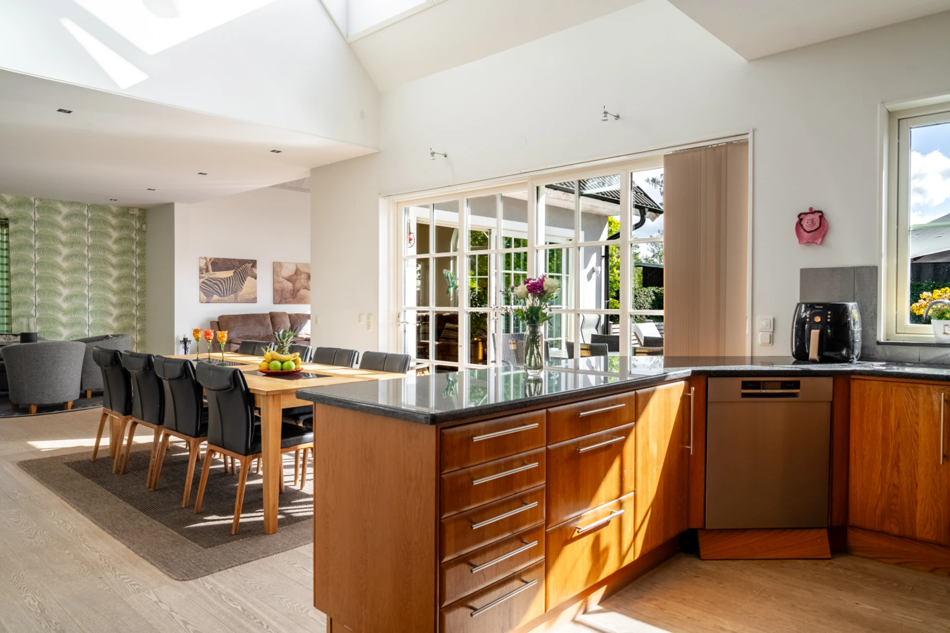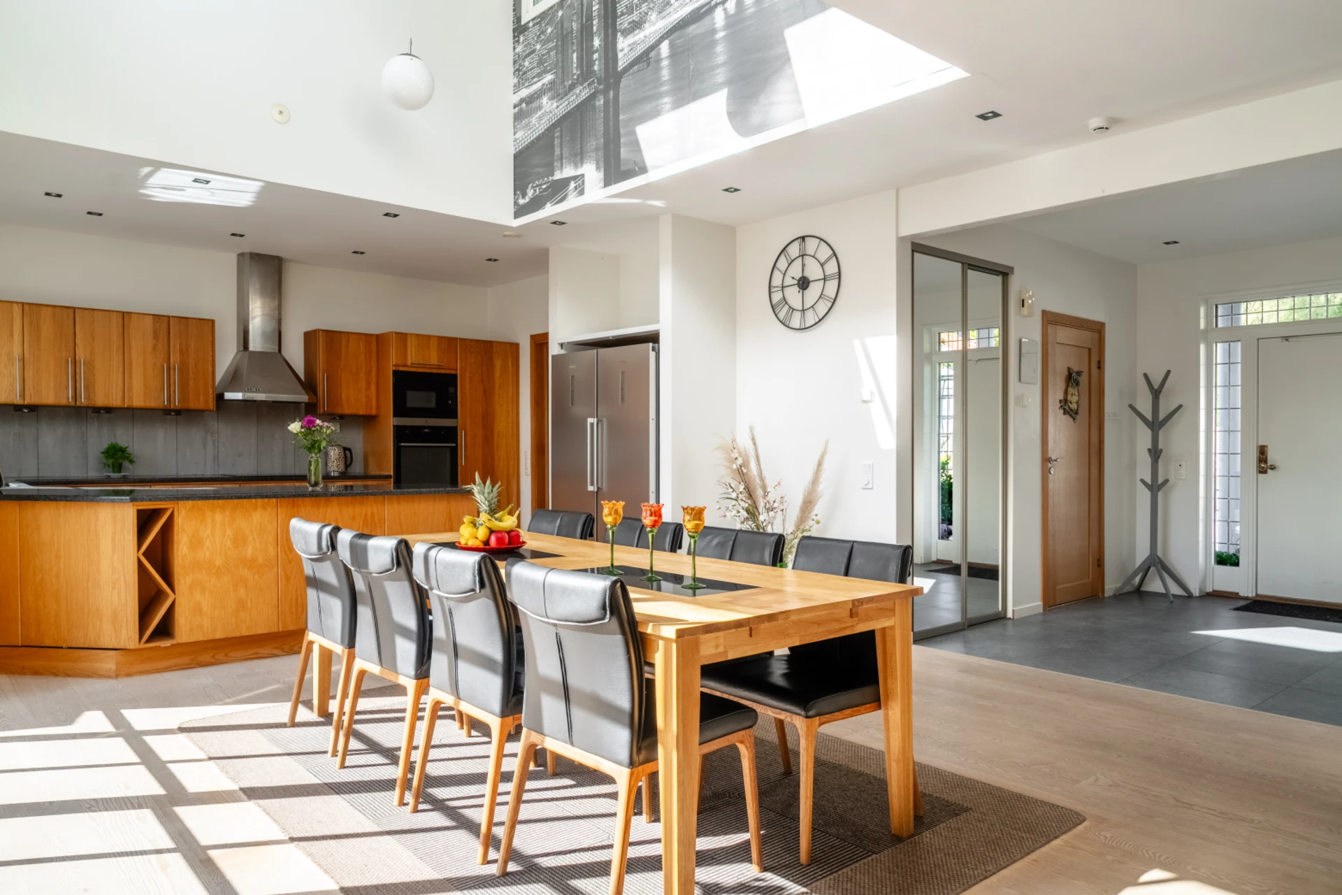 Ljust och luftigt tack vare stora fönsterpartier, skjutdörrar och öppet upp i nock. Här kombineras ett funktionellt kök med generösa arbetsytor och förvaring med en matplats för många gäster.