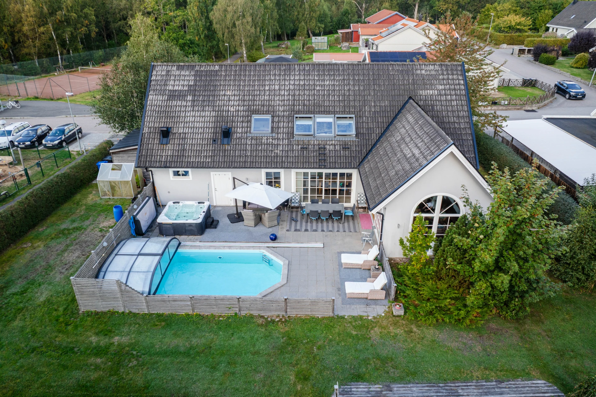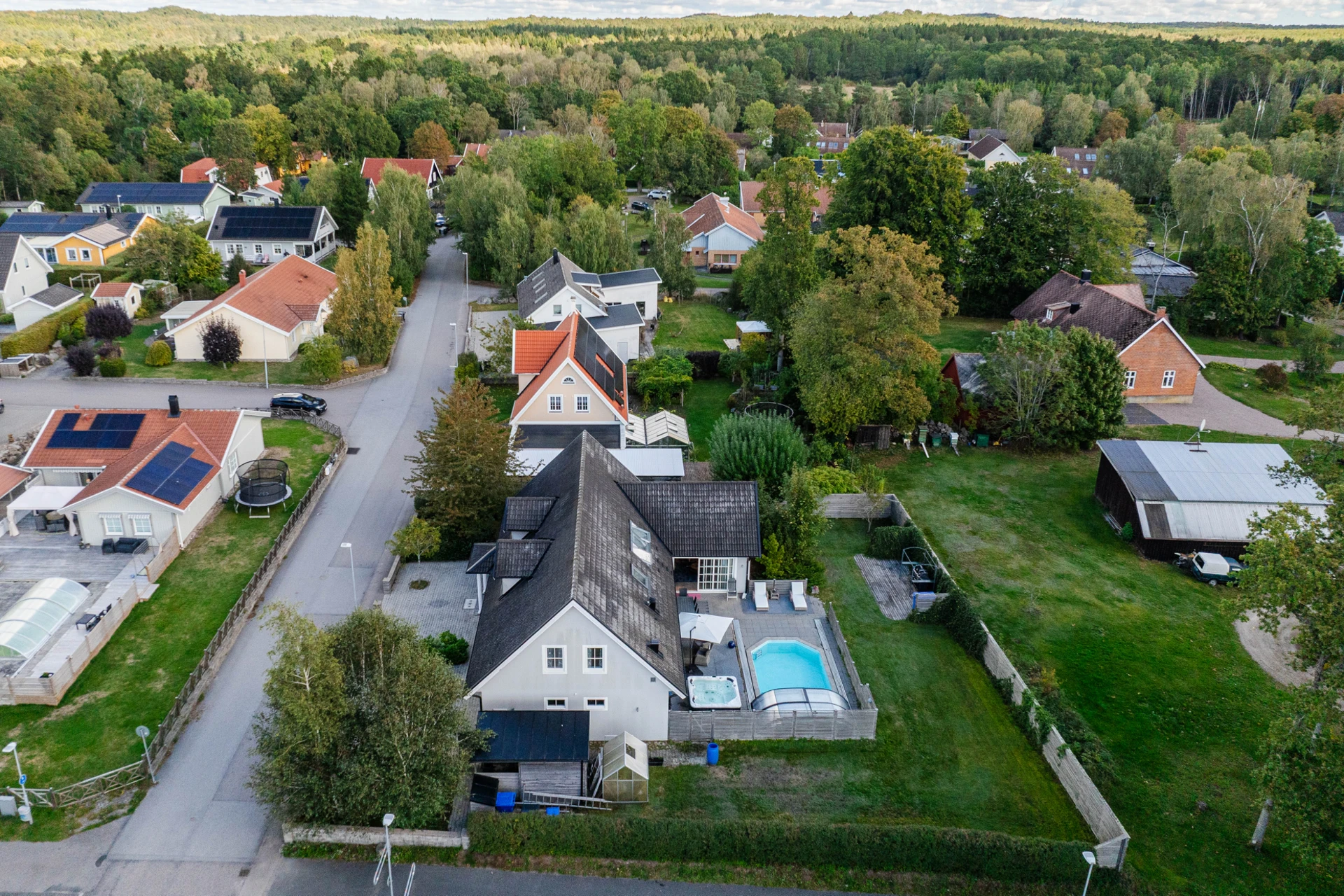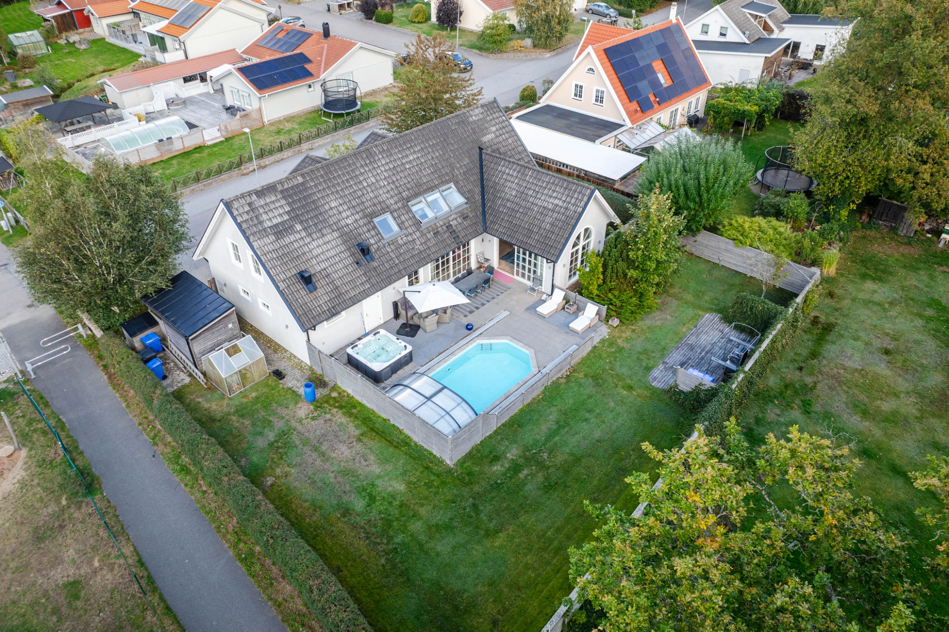 Trädgården är en plats för njutning året runt. Den stenlagda uteplatsen ramas in av grönska och rymmer både pool, spabad och ytor för solstolar och loungemöbler. Här finns utrymme för både odling, lek och vila samtidigt som närheten till gång- och cykelvägar gör området extra barnvänligt.