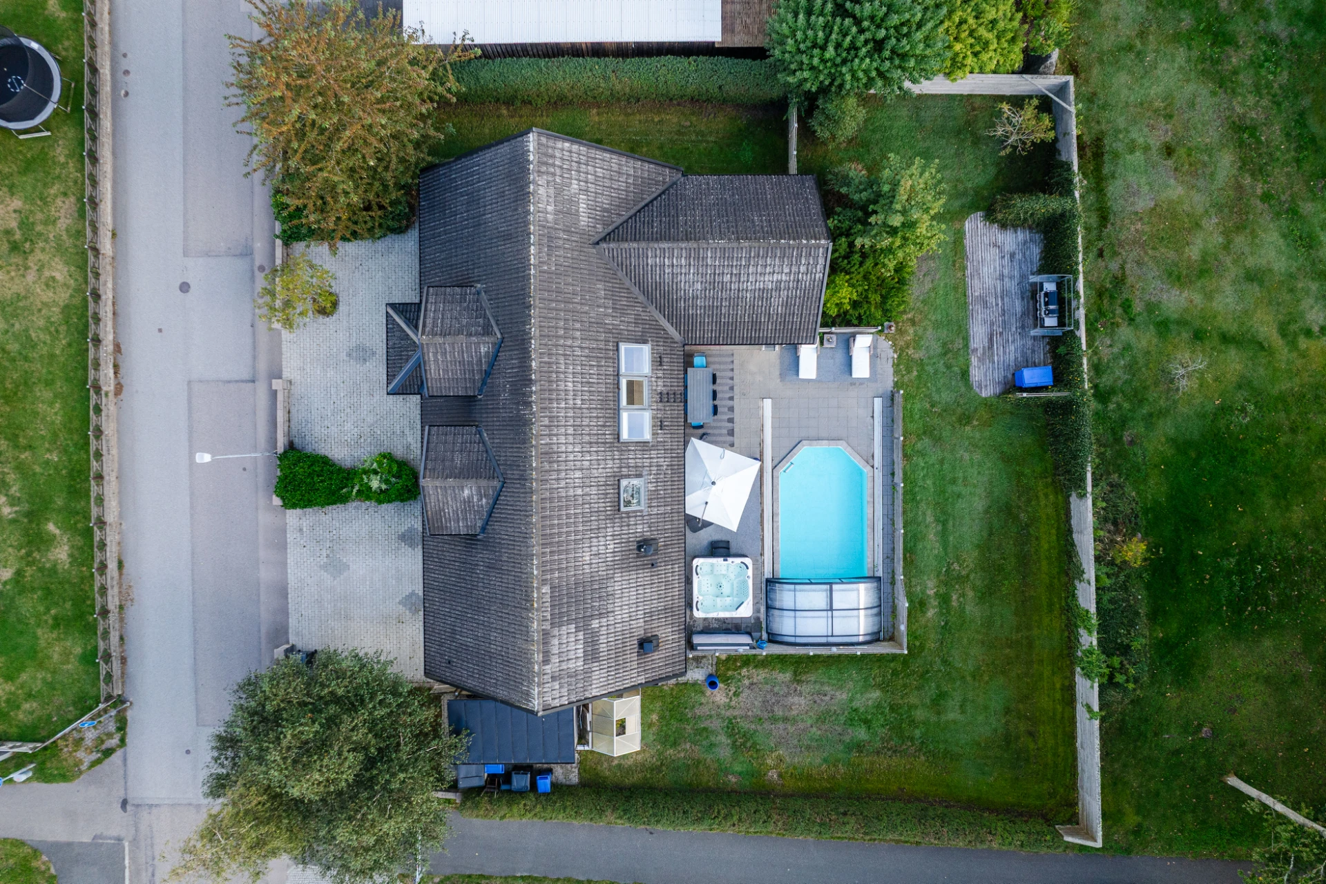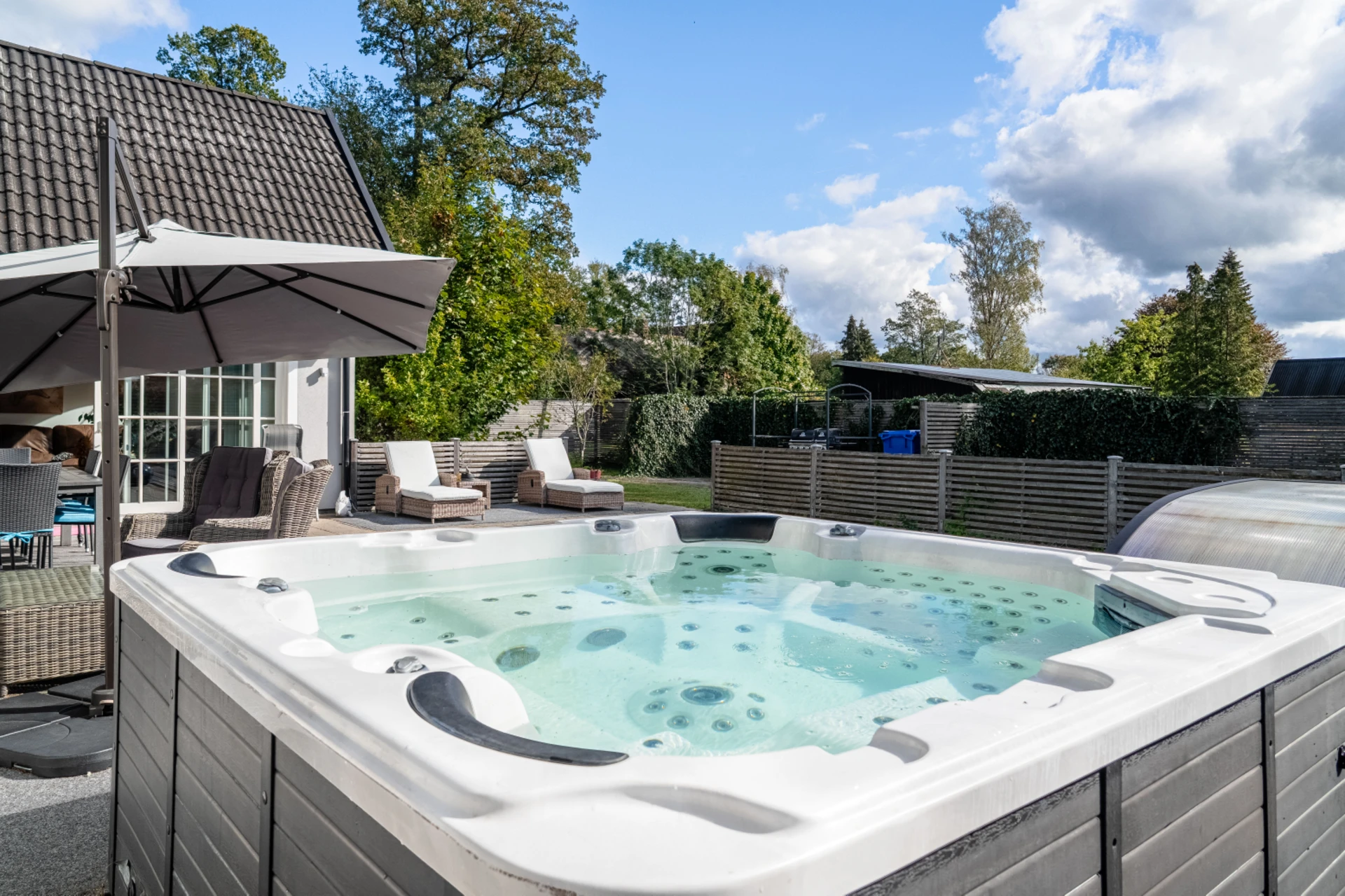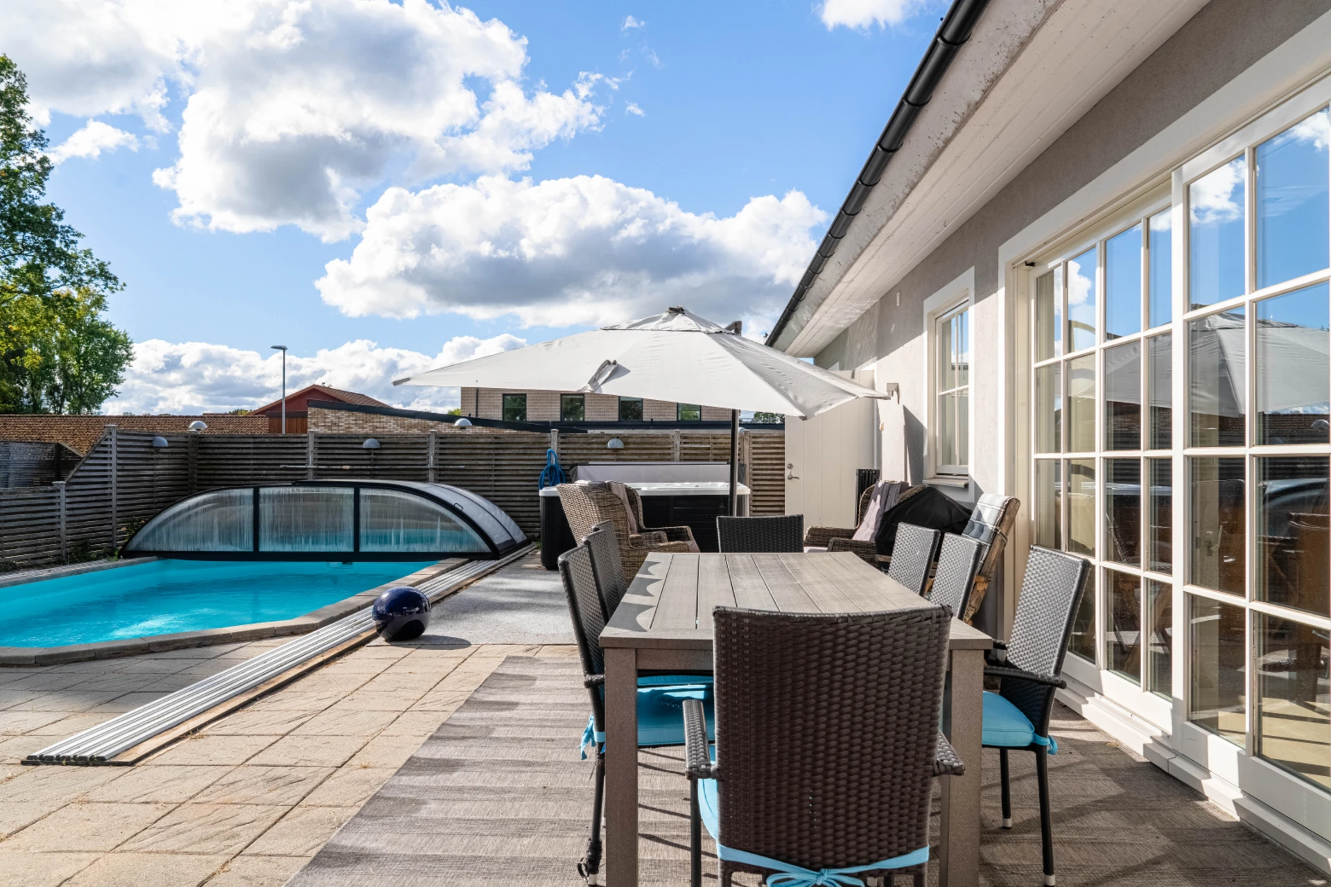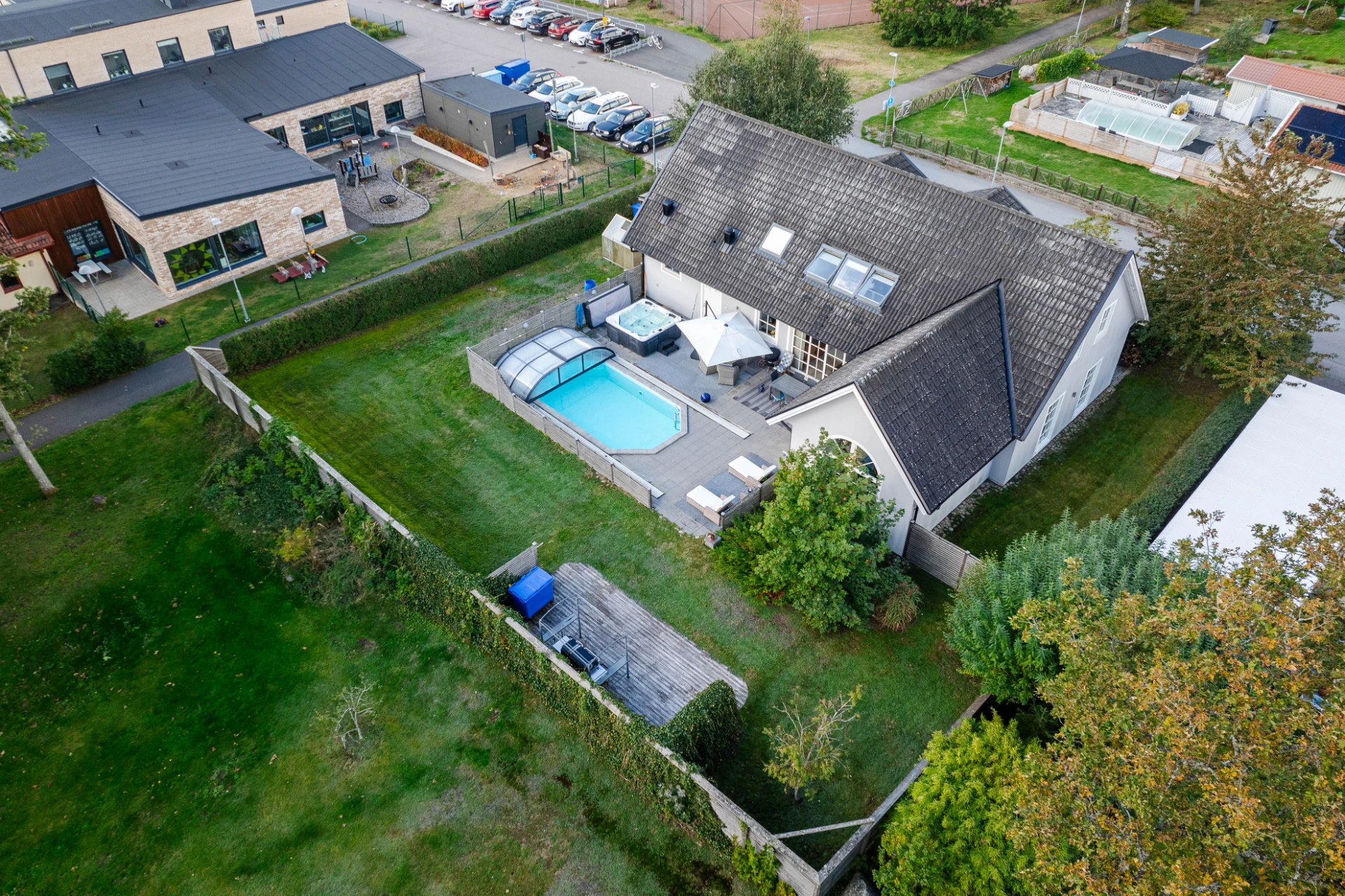 Trädgården är en plats för njutning året runt. Den stenlagda uteplatsen ramas in av grönska och rymmer både pool, spabad och ytor för solstolar och loungemöbler. Här finns utrymme för både odling, lek och vila samtidigt som närheten till gång- och cykelvägar gör området extra barnvänligt.