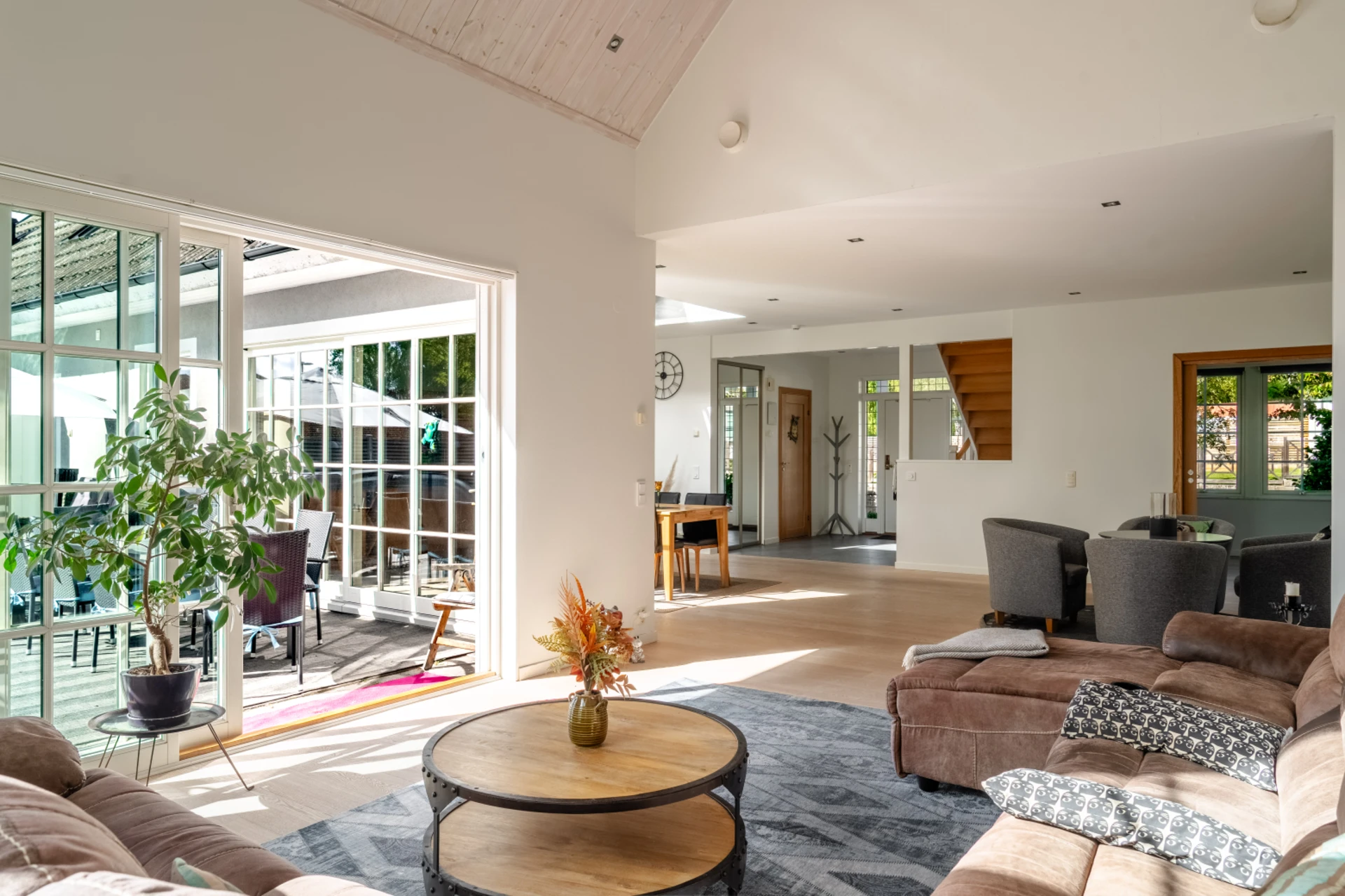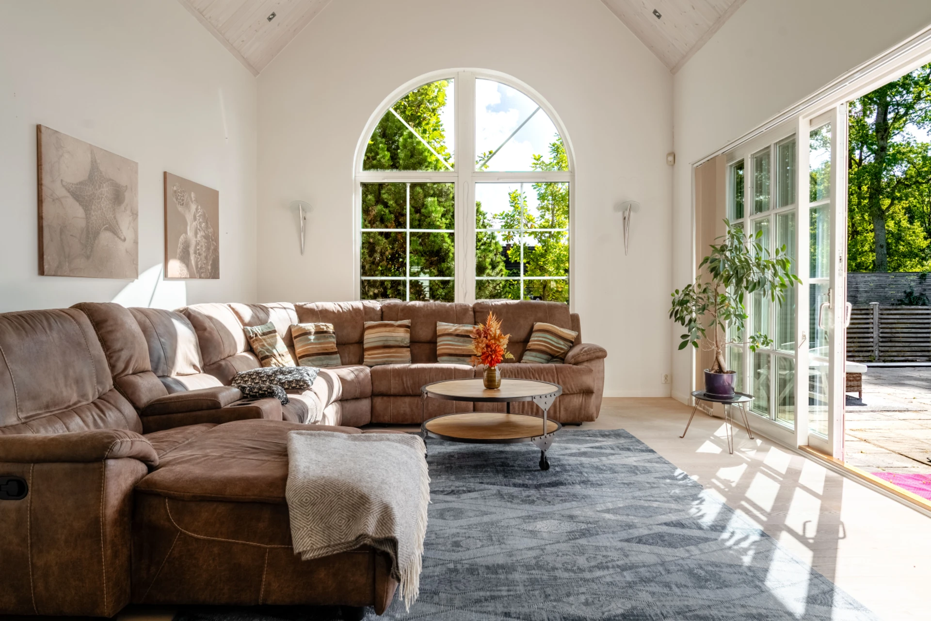 Generöst allrum i anslutning till kök med stora fönsterpartier mot trädgården.