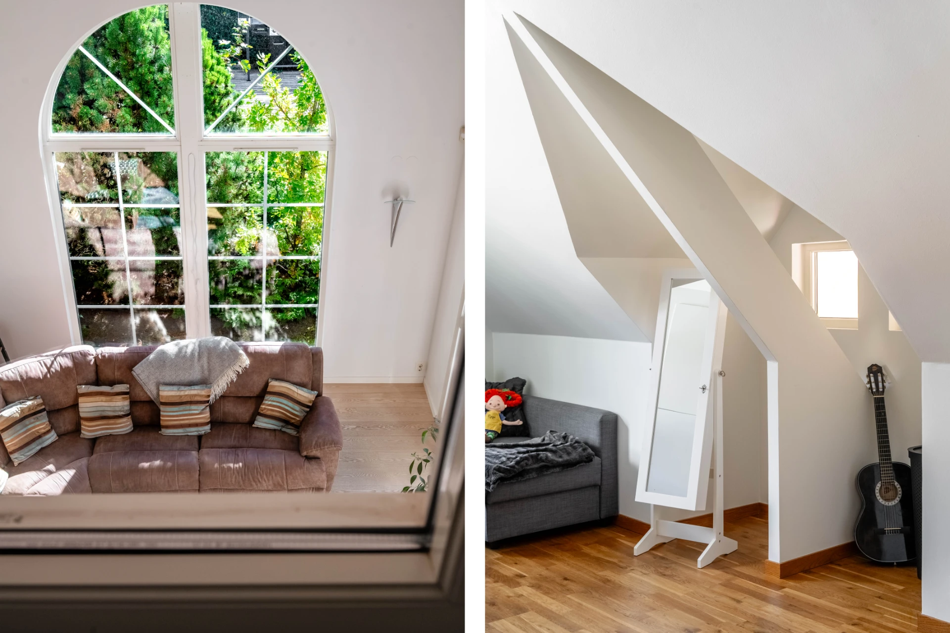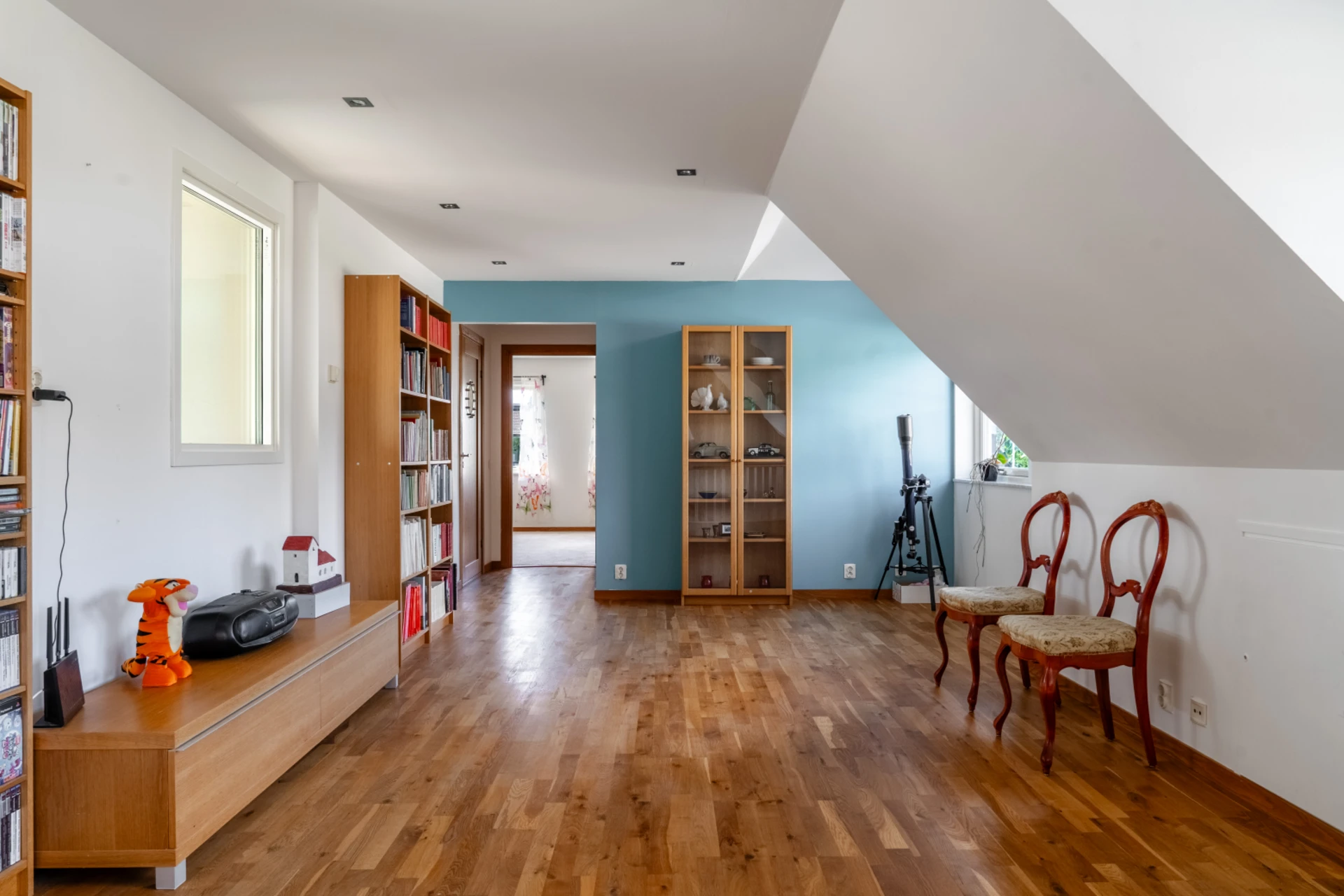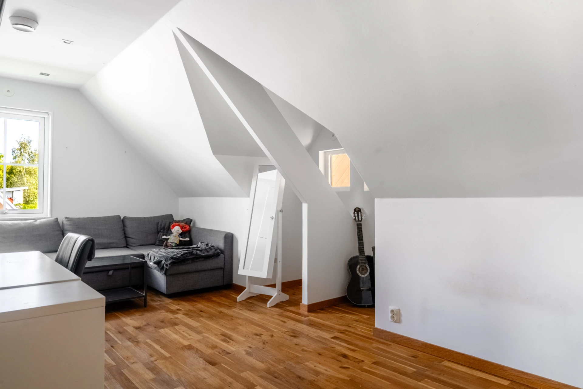 Vitt charmigt rum med snedtak, perfekt som barnrum eller tonårsrum.