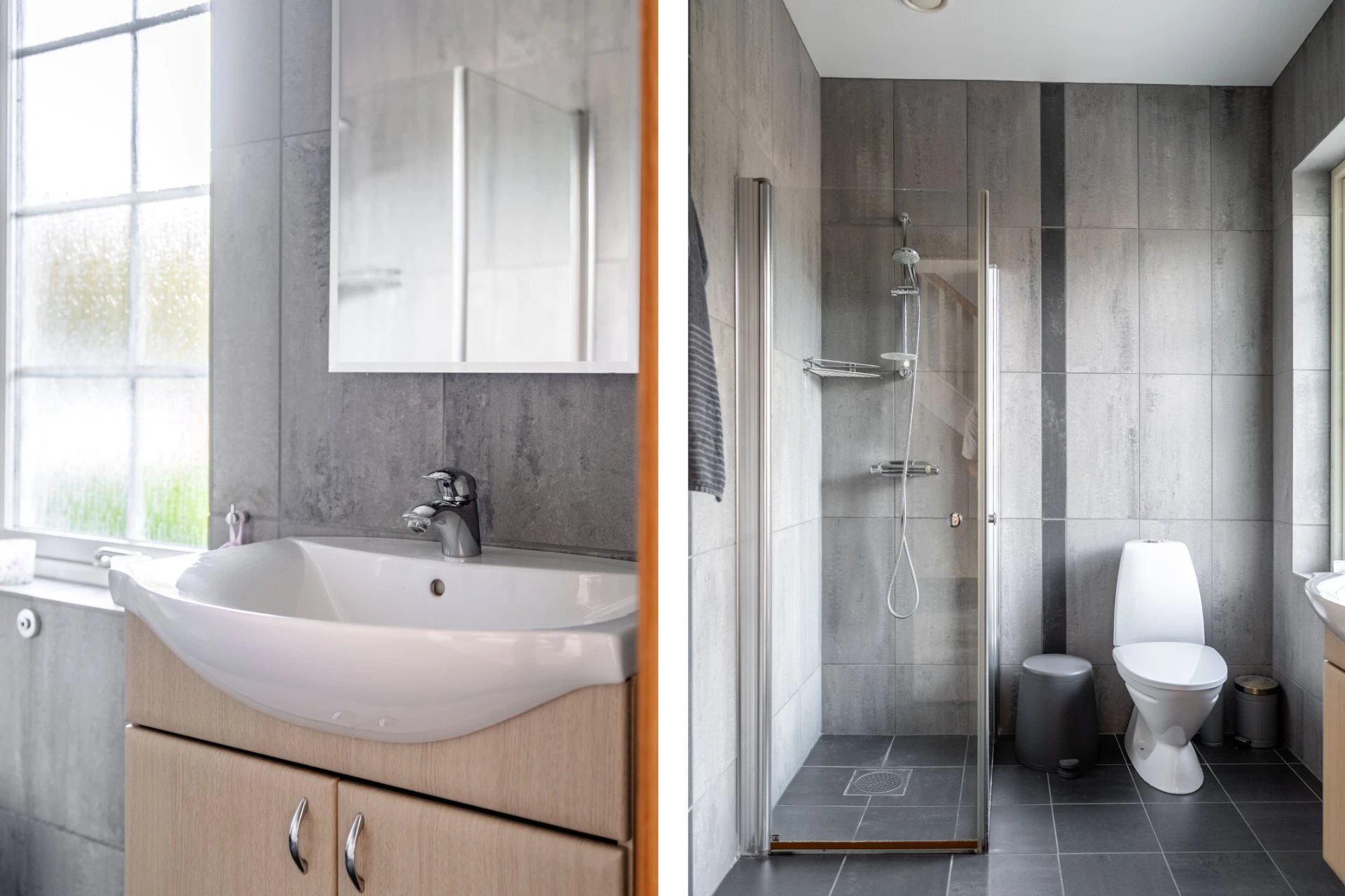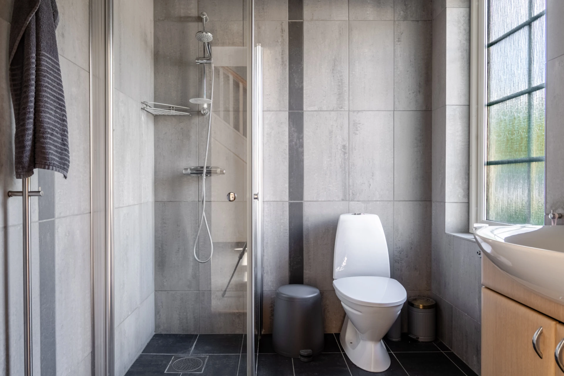 Smidigt placerat duschrum vid entrén. Utrustat med wc, handfat med kommod, dusch och handdukstork.