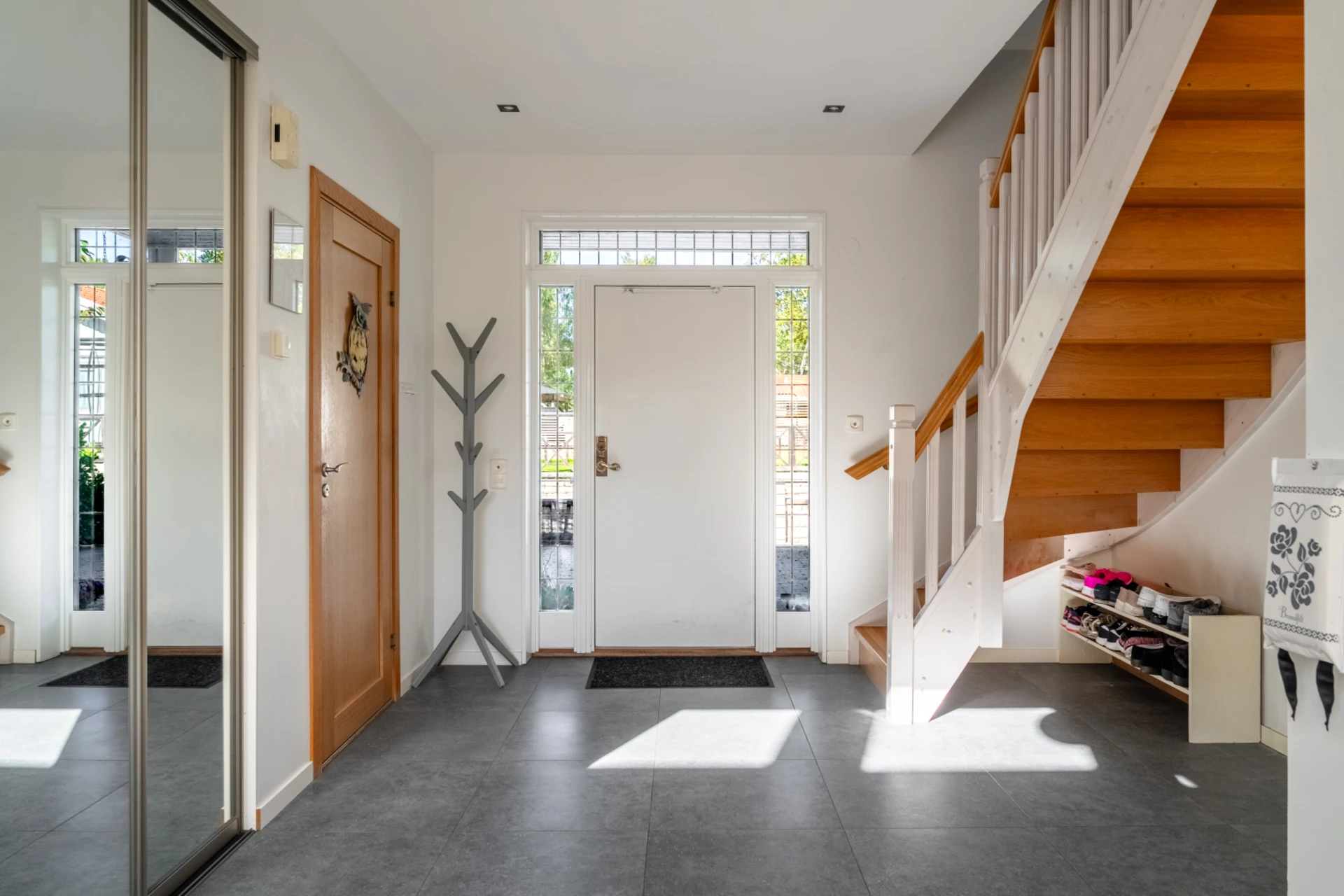 Välkomnande hall med gott om plats för avhängning. Härifrån nås både duschrum, trappan till ovanvåningen och hemmets sociala ytor.