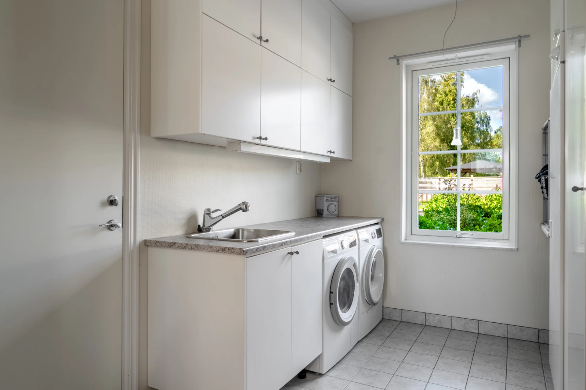 Praktisk klädvårdsavdelning med groventré, tvättmaskin, torktumlare, skåpsförvaring och fönster som ger naturligt ljus.