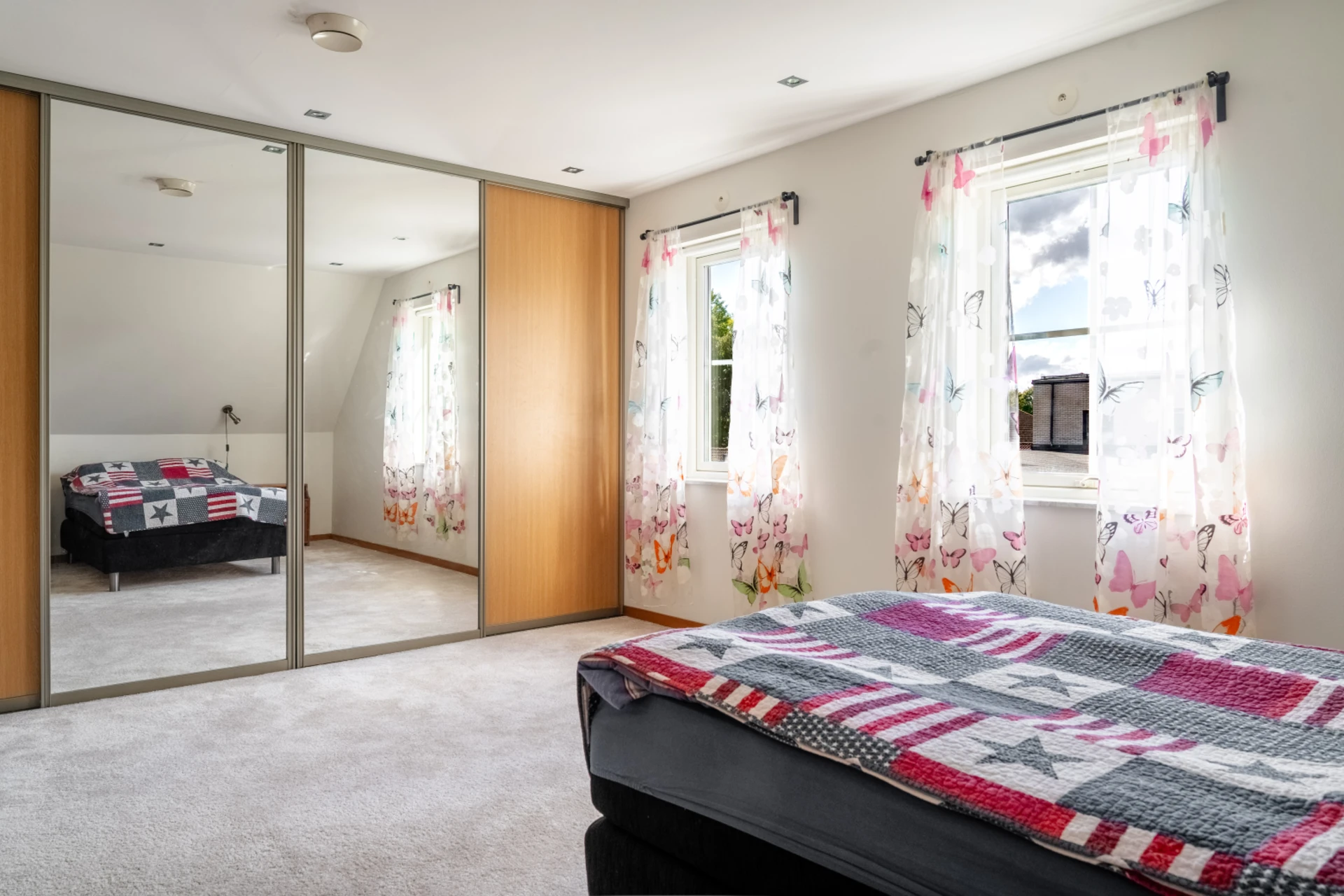 Stort sovrum med skjutdörrsgarderober längs väggen och plats för dubbelsäng. Ligger i anslutning till klädkammare för ytterligare förvaring.