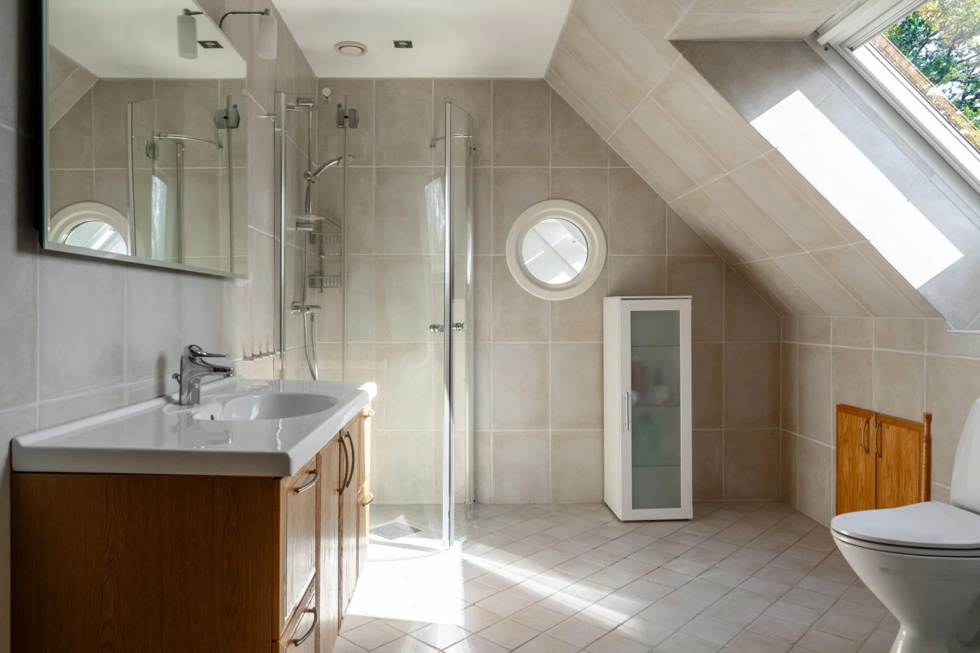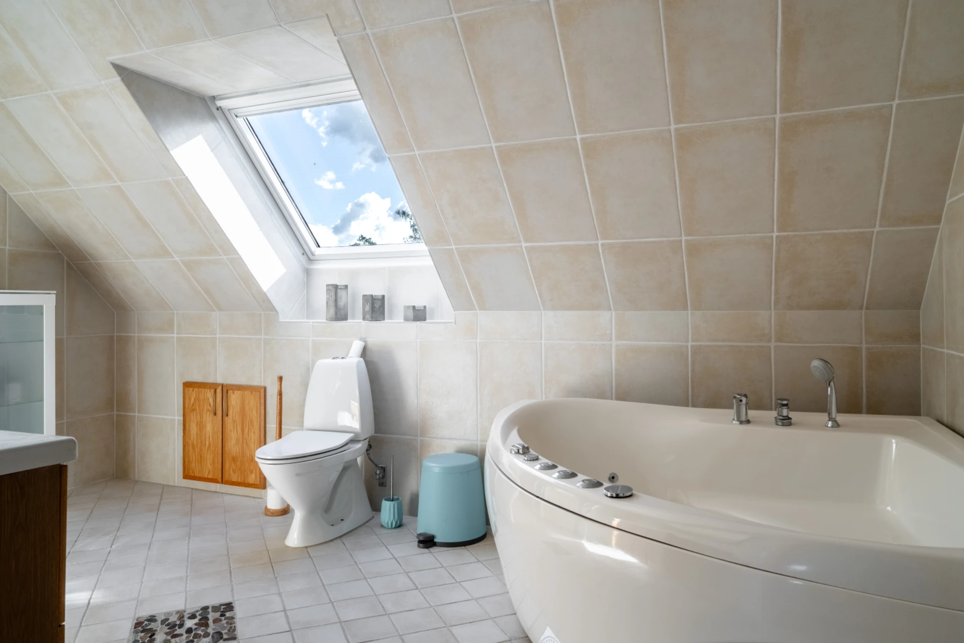Helkaklat bad rum med takfönster som släpper in naturligt ljus. Utrustat med wc, handfat med kommod, dusch och hörnbadkar.