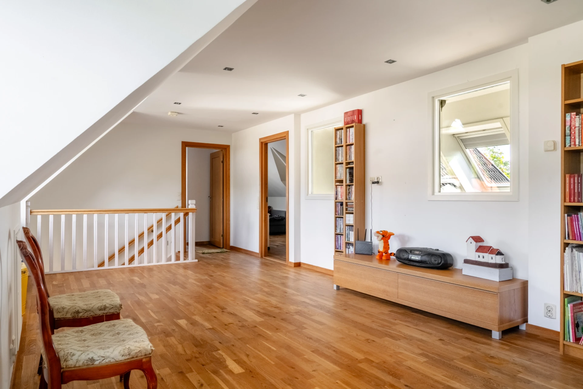 På ovanvåningen samlas familjen i ett rymligt allrum, perfekt som tv-rum eller barnens egen avdelning. Tre sovrum i olika storlekar erbjuder gott om plats för både barn och gäster. Här finns också ett stort badrum med takfönster och hörnbadkar som inbjuder till avkoppling efter en lång dag.