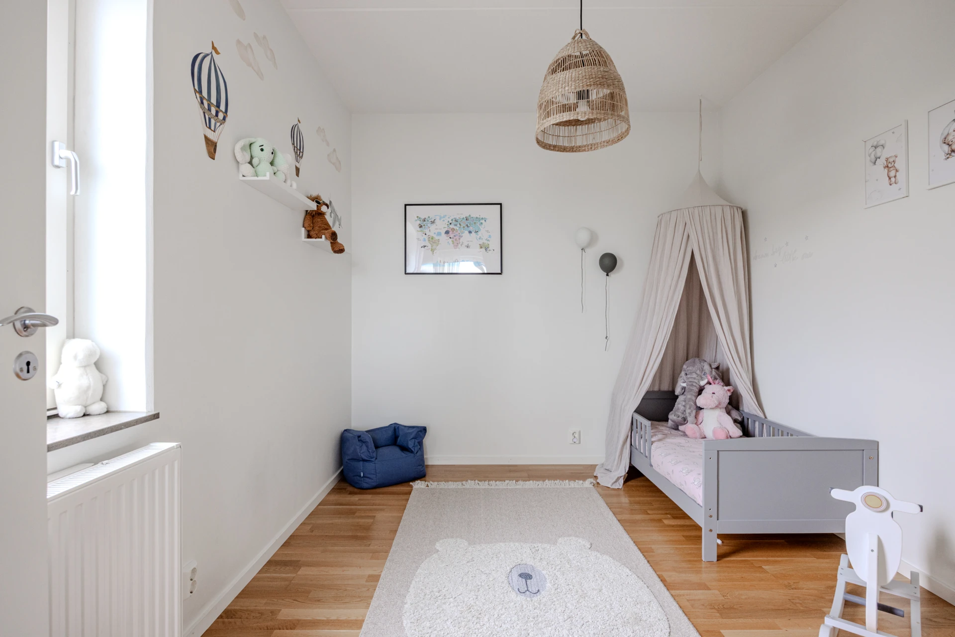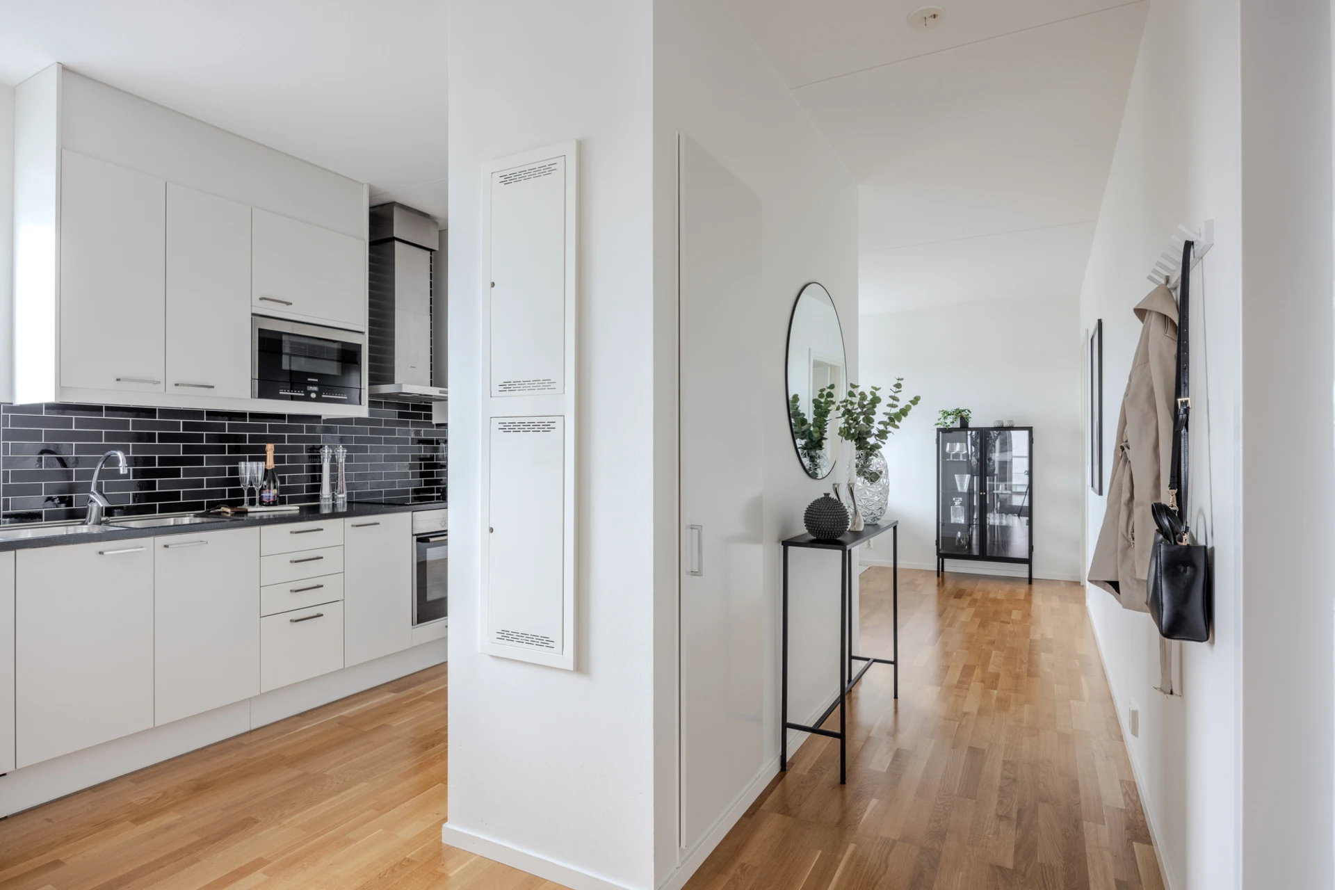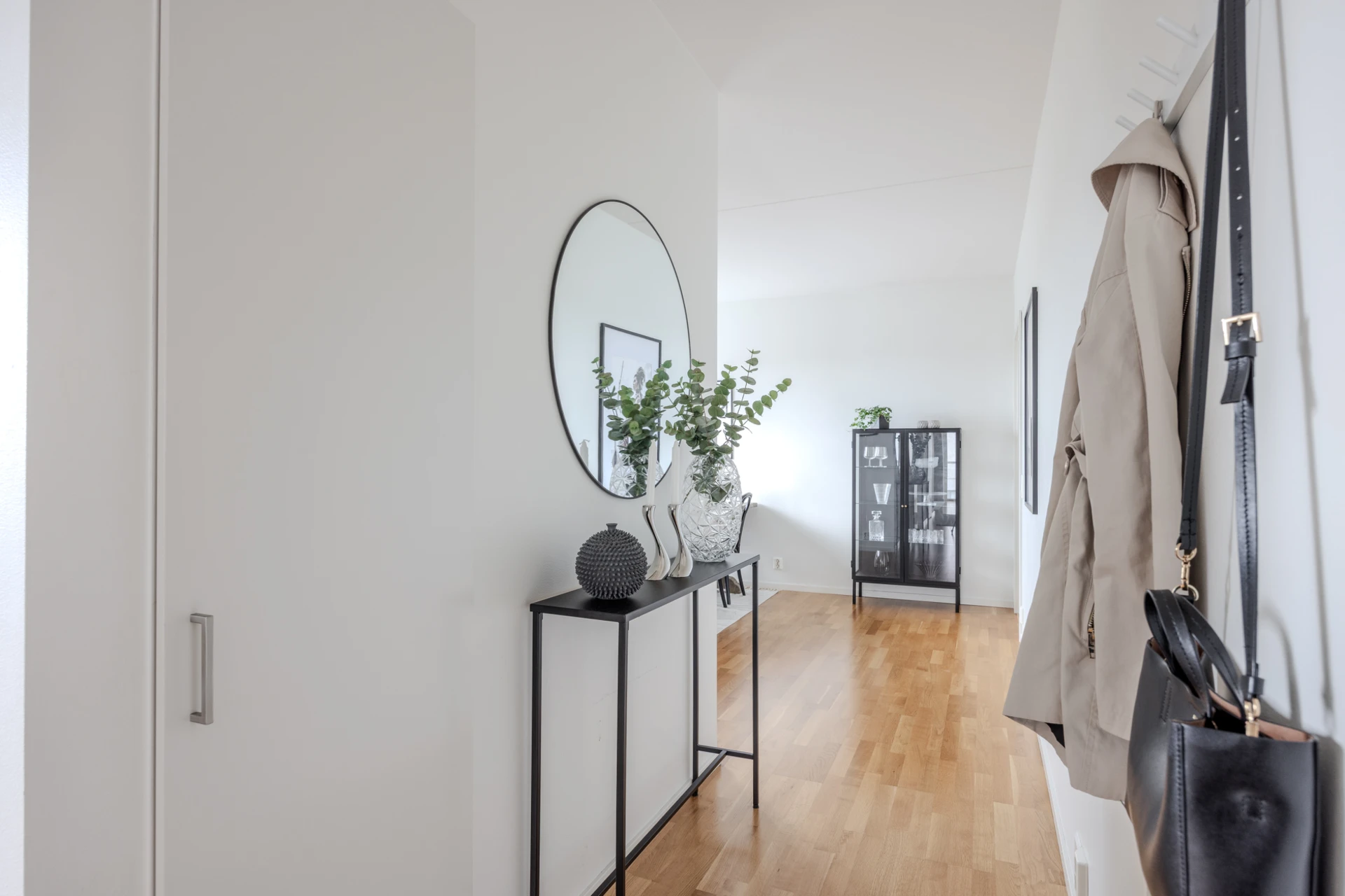 Ekparkett och vitmålade väggar. Plats för avhängning och förvaringsmöjligheter i en garderob.
