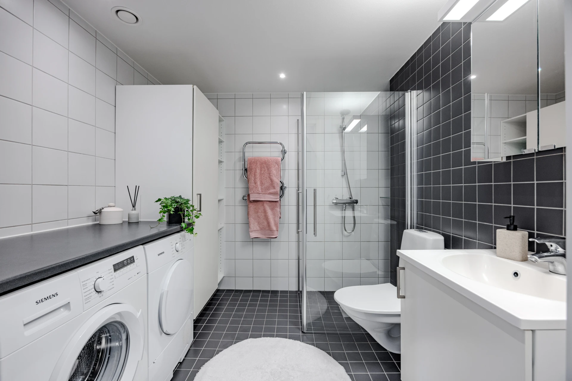 Antracitgrått klinkergolv med golvvärme och helkaklade väggar i vitt. Utrustningen består av WC, handfat med kommod, spegelskåp med belysning, dusch med vikbara glasdörrar, handdukstork samt tvättmaskin och torktumlare (Siemens) med en bänkskiva ovan. Förvaringsmöjligheter i högskåp samt öppna hyllplan.