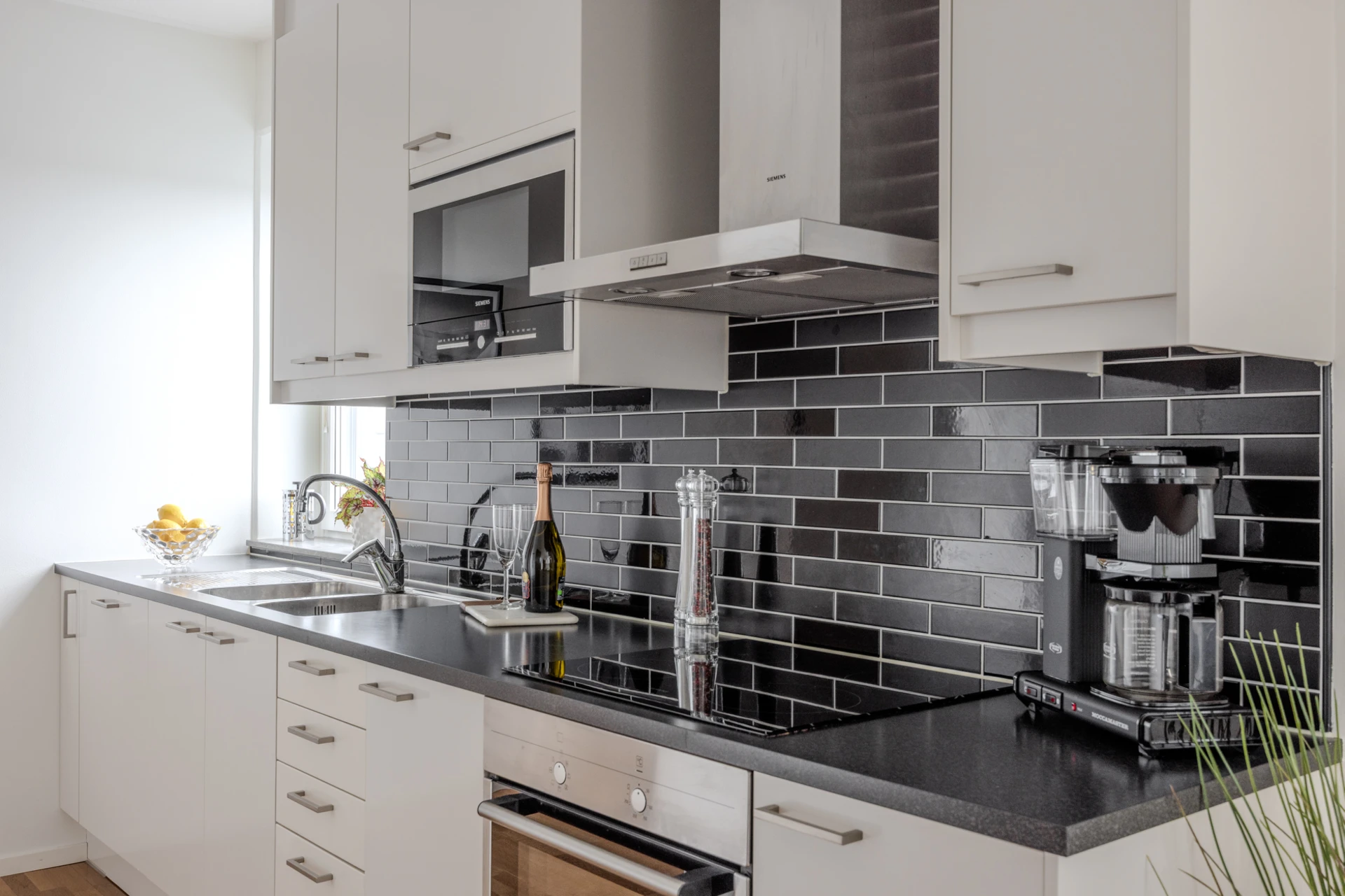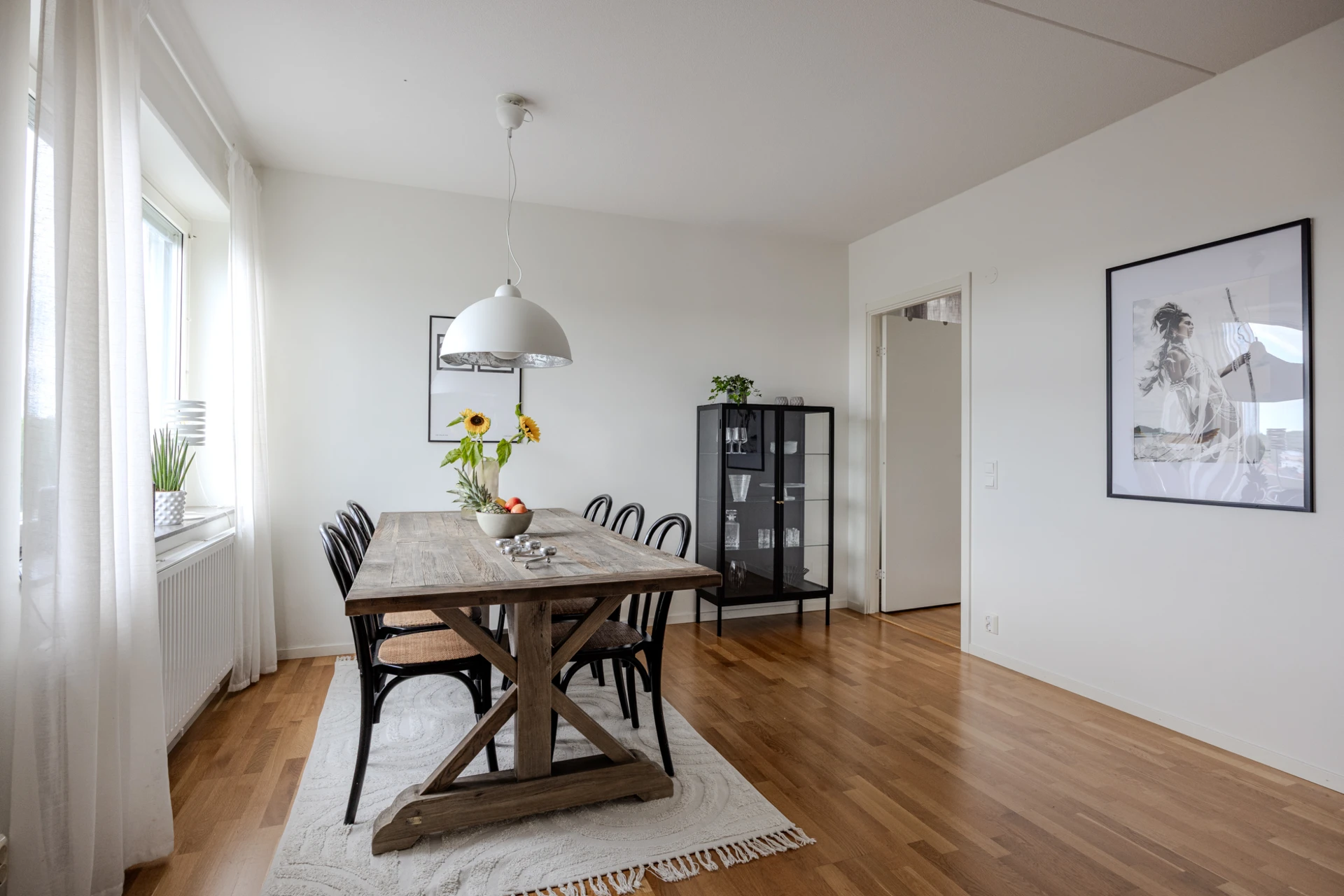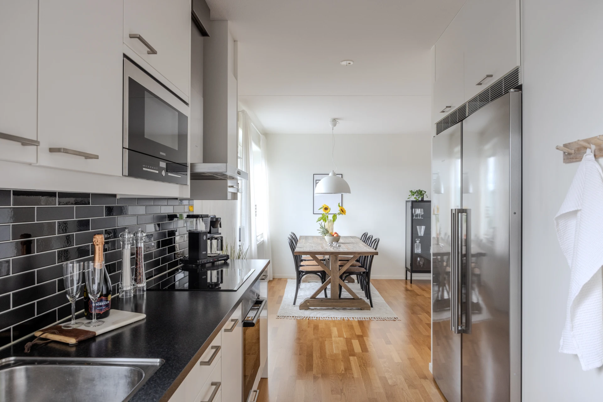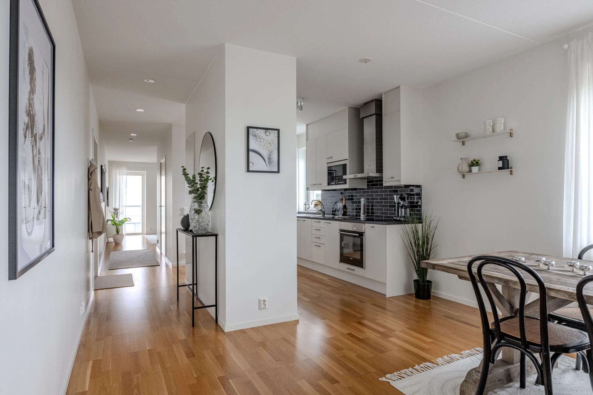 Ekparkett och vitmålade väggar. Köksinredning i vitt och ovan bänkskivan i mörk laminat sitter svart liggande kakel. Den maskinella utrustningen består av spis med induktionshäll, fläkt, inbyggd diskmaskin, mikrovågsugn samt kyl och frys i fullhöjd. Samtliga vitvaror är från Siemens i rostfritt stål. Bra ljusinsläpp från fönster vid köksbänken. Plats för ett matsalsbord för cirka 6 personer.