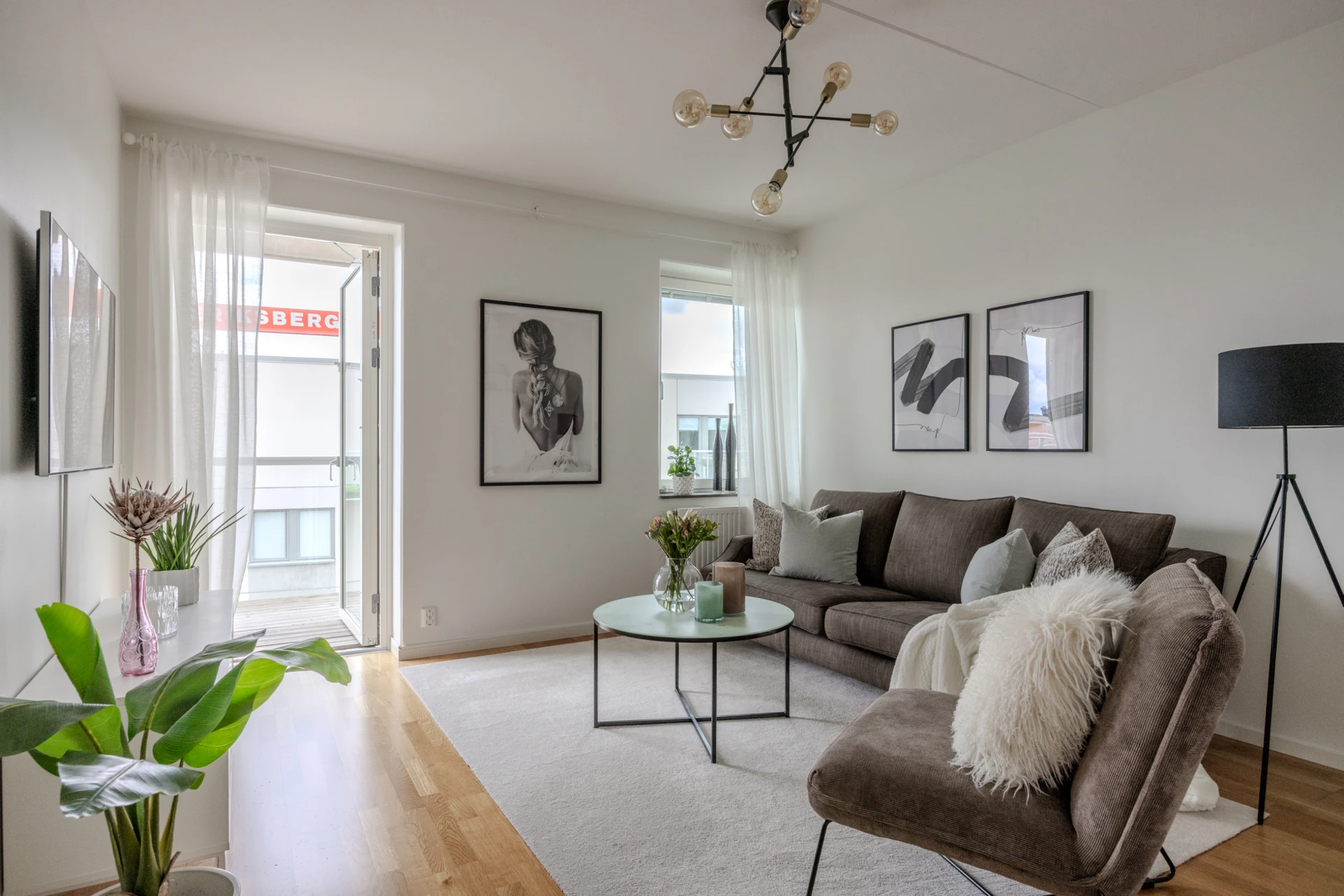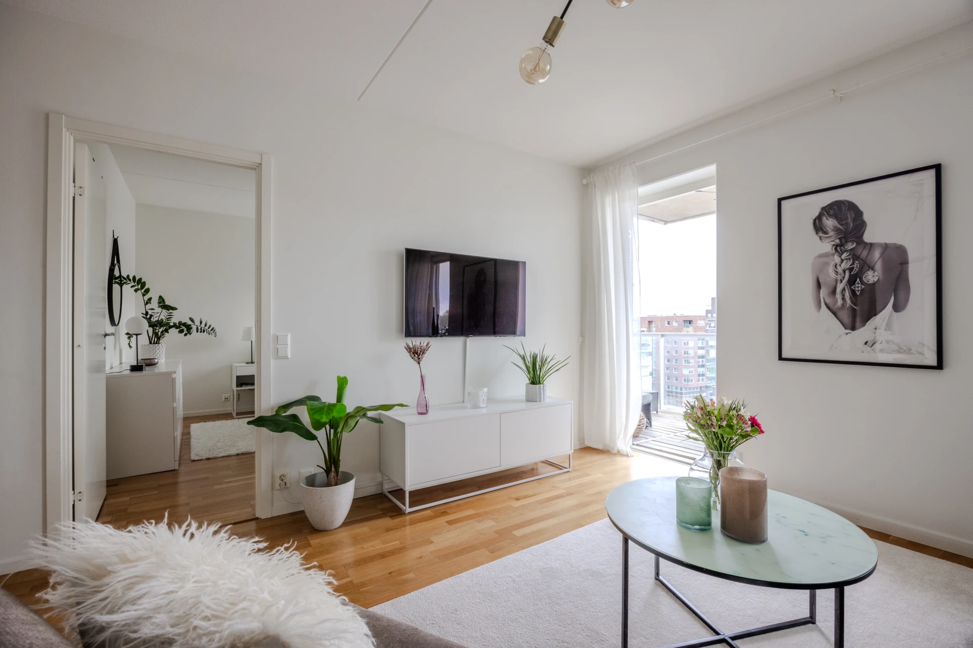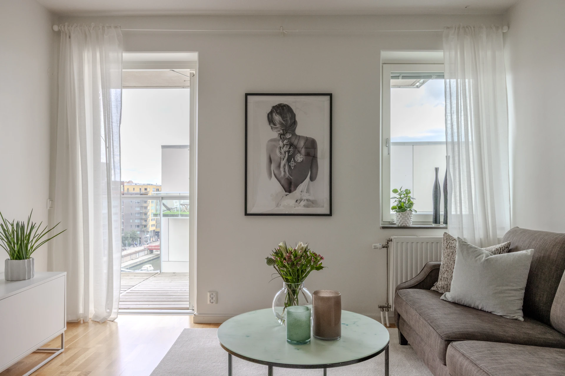 Ekparkett och vitmålade väggar. Plats för soffgrupp med tillhörande möblemang samt TV-möbel. Härifrån når ni lägenhetens generösa balkong i söderläge med utsikt över hamninloppet och bockkranen.