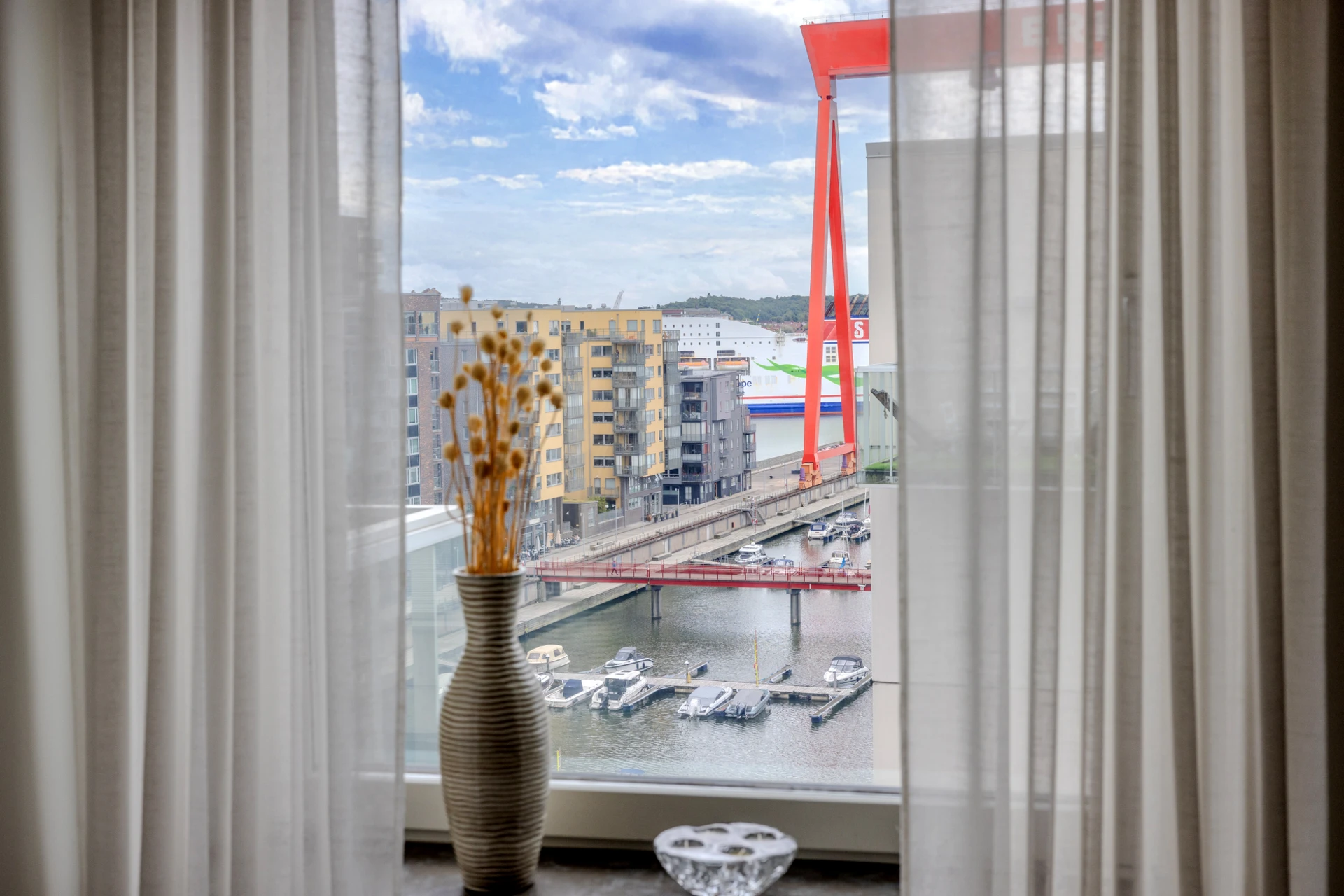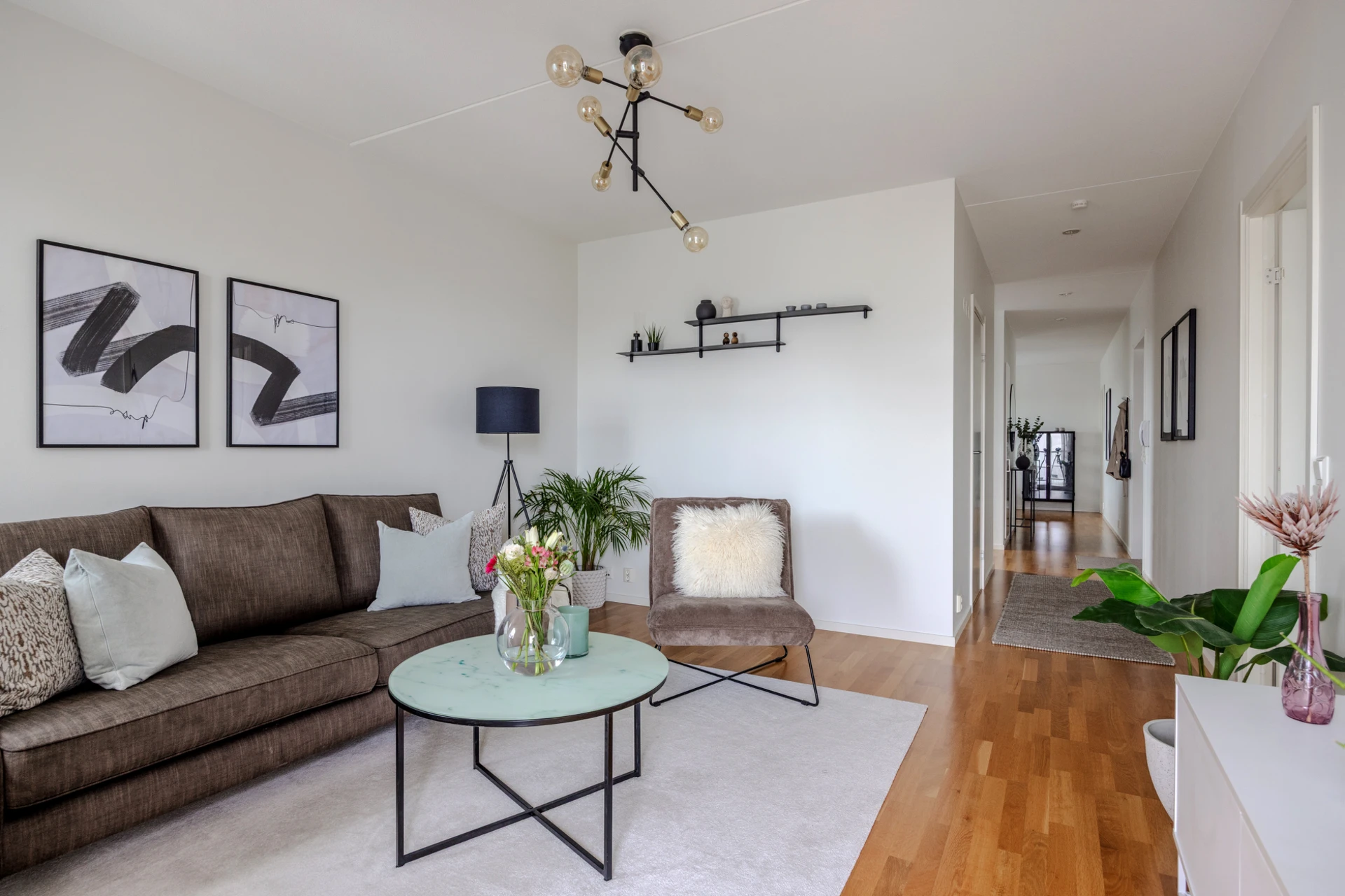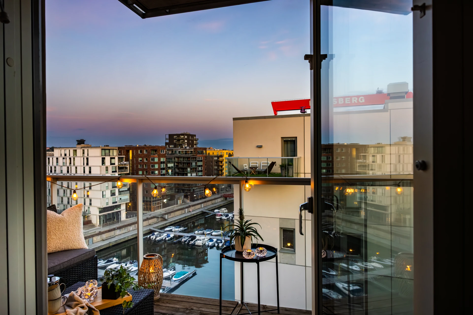 Ekparkett och vitmålade väggar. Plats för soffgrupp med tillhörande möblemang samt TV-möbel. Härifrån når ni lägenhetens generösa balkong i söderläge med utsikt över hamninloppet och bockkranen.