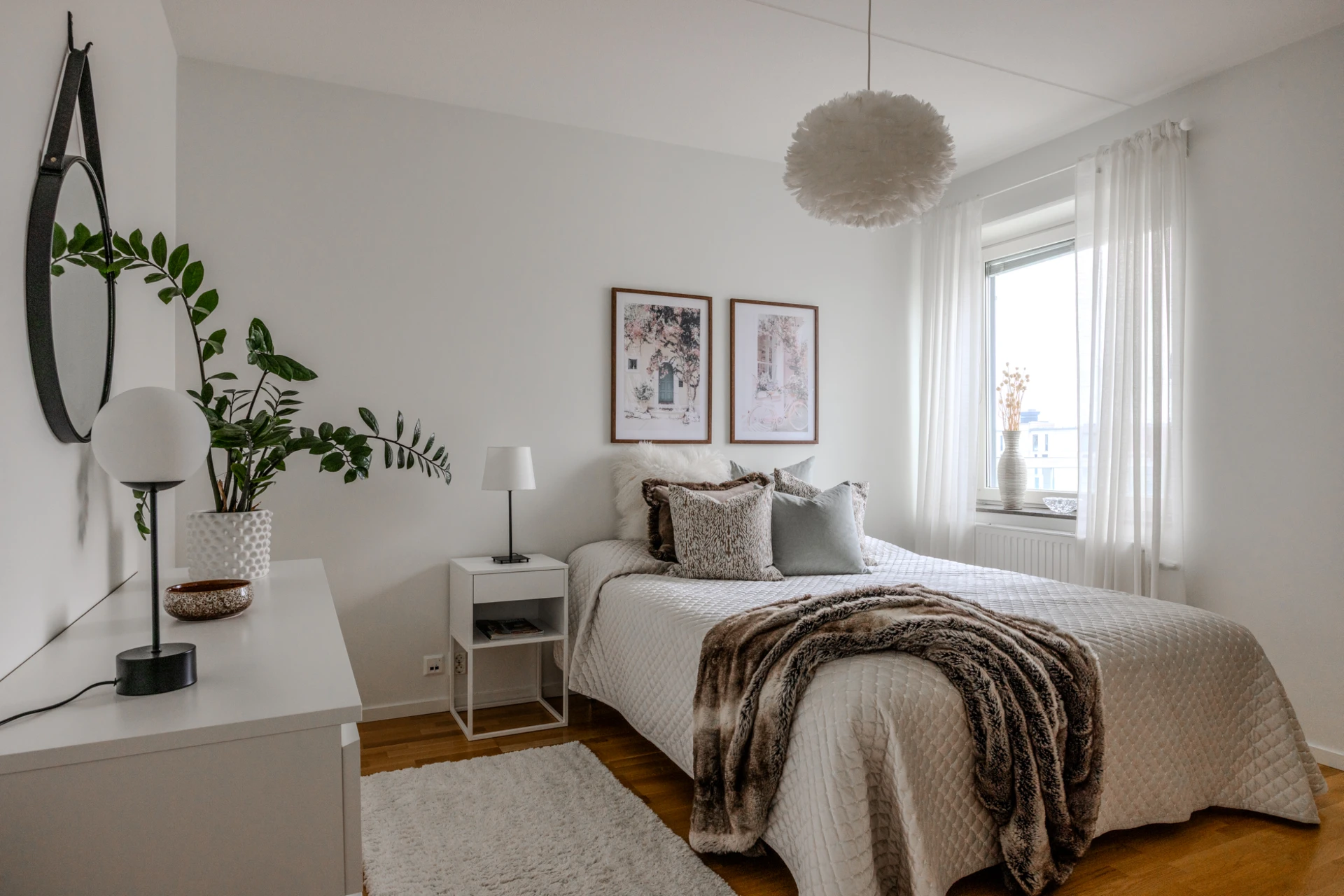 Ekparkett och vitmålade väggar. Plats för säng, skrivbord eller önskvärt möblemang. Förvaringsmöjligheter i två garderober.