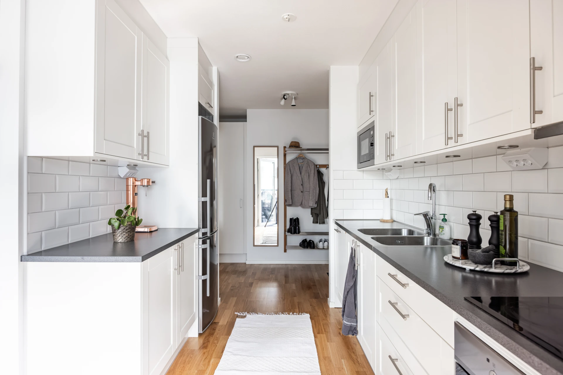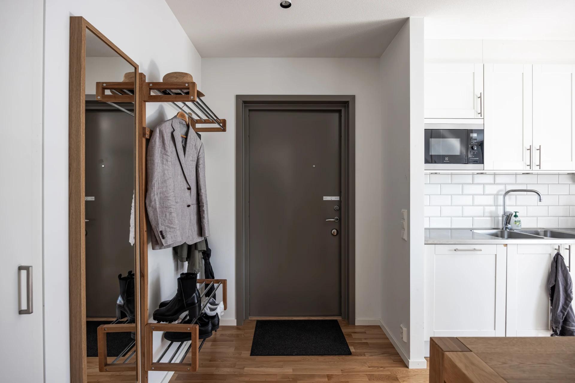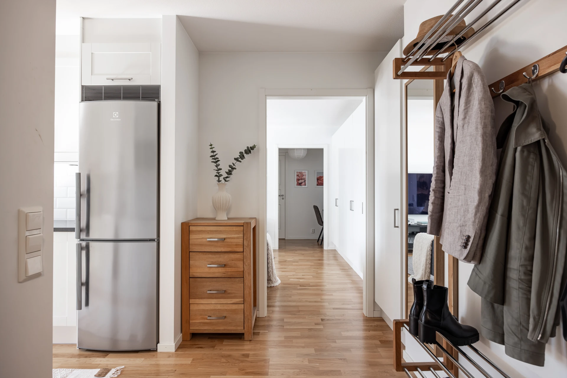 Parkettgolv och vitmålade väggar. Här finns plats för avhängning och förvaring i en inbyggd garderob.
