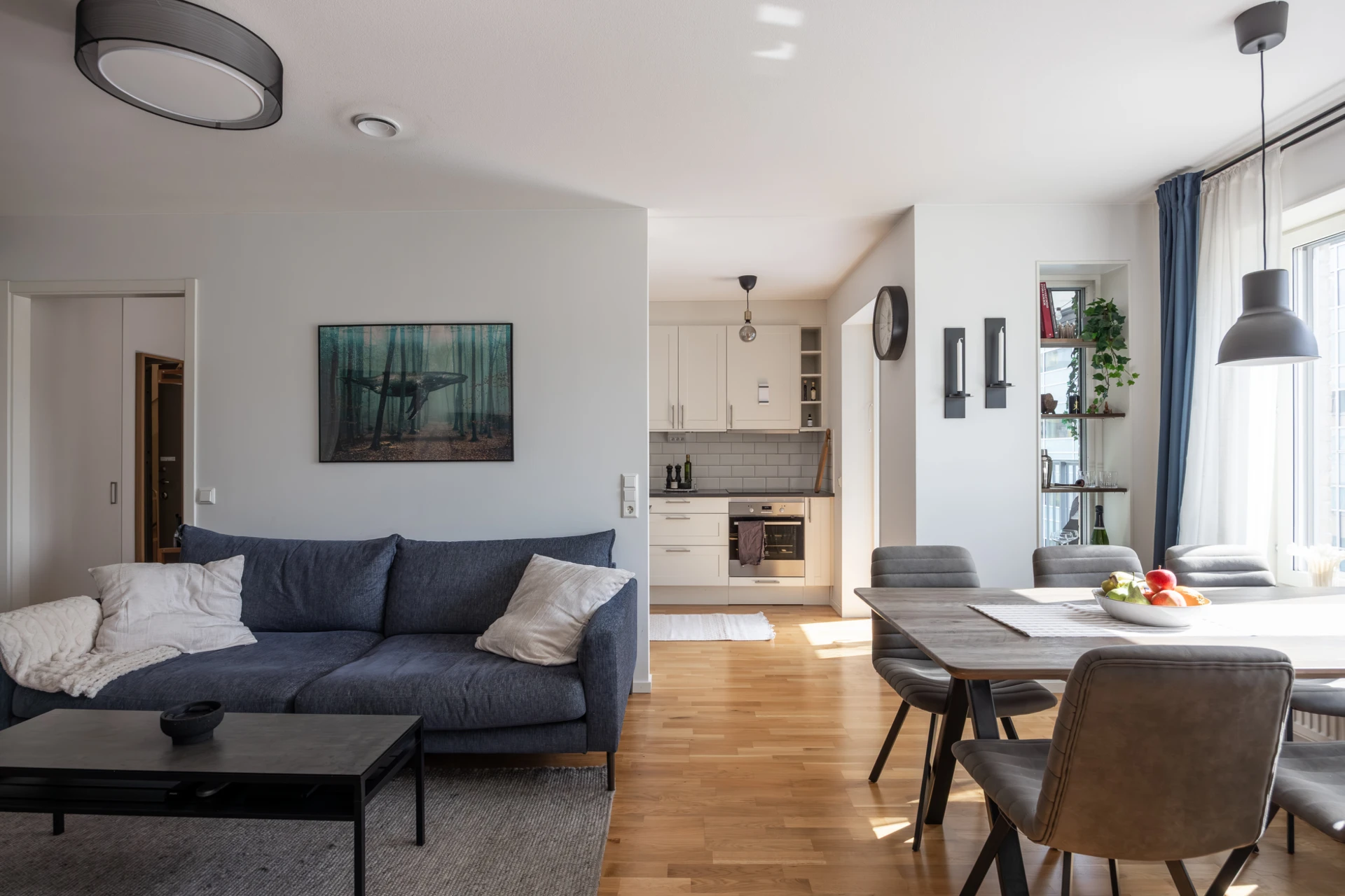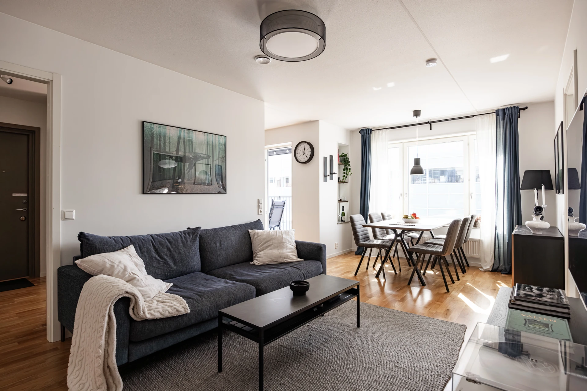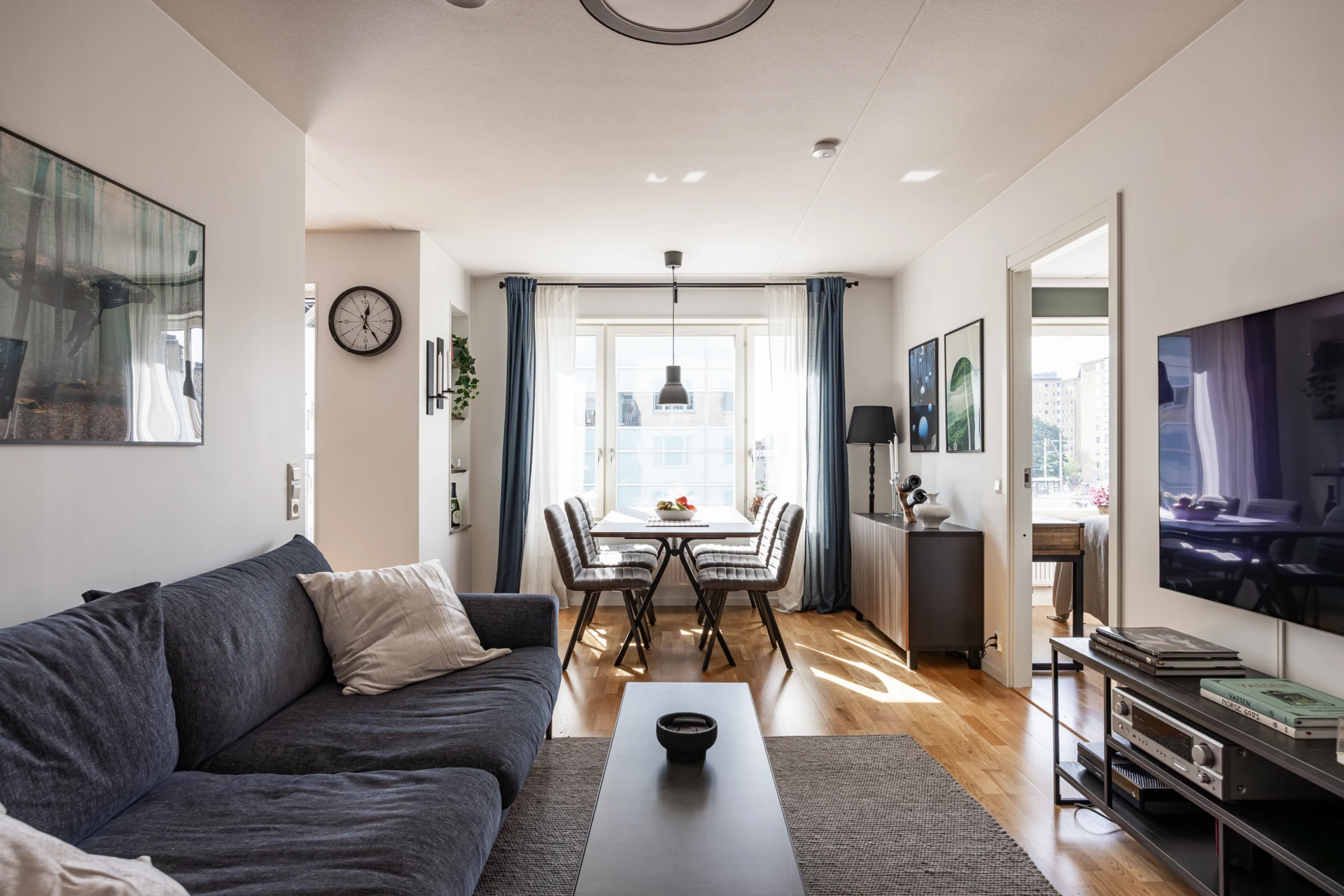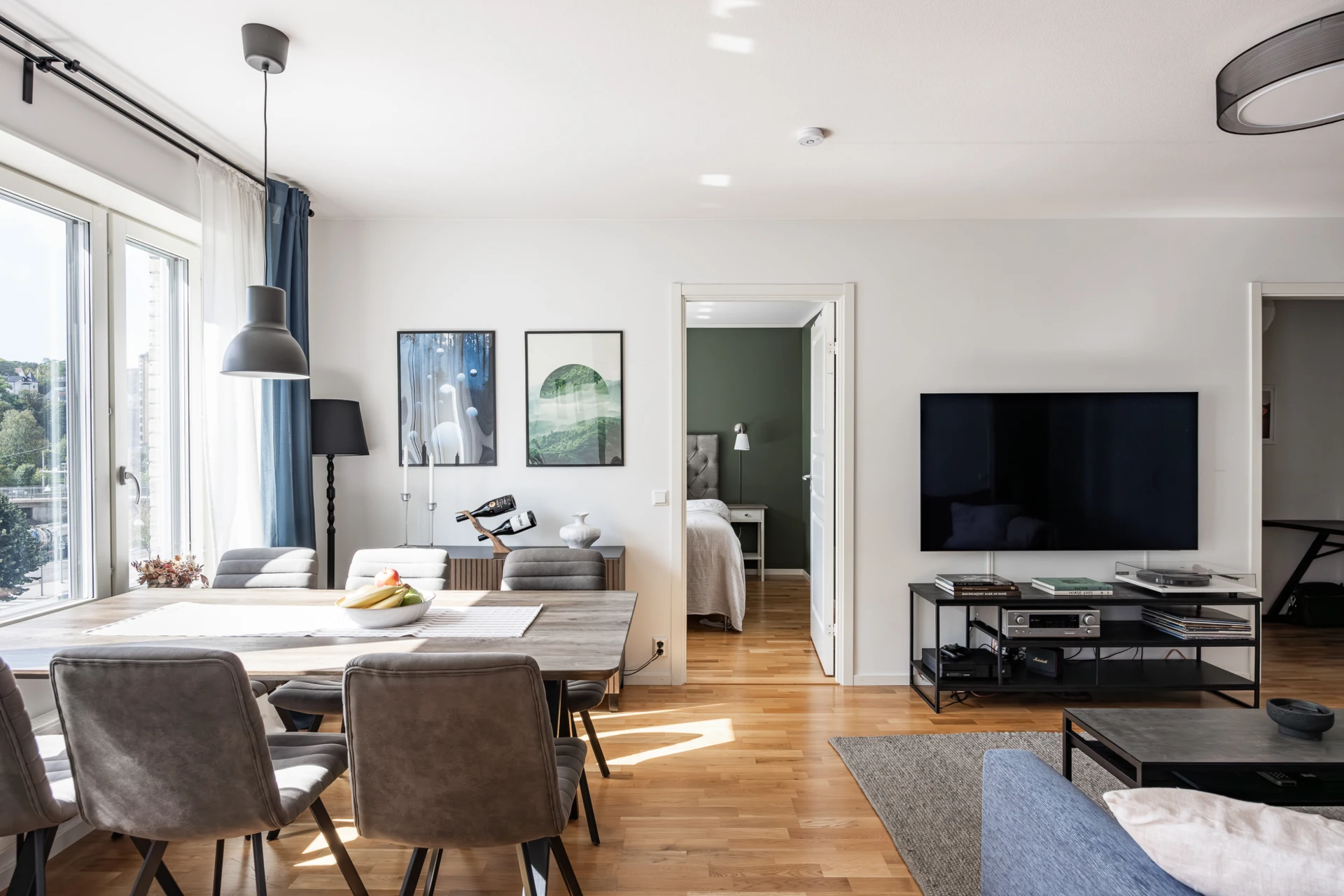 Parkettgolv och vitmålade väggar med fönsterbänkar i natursten. Här finns plats för soffgrupp med tillhörande möblemang samt matsalsbord. Förvaring i fem garderober.