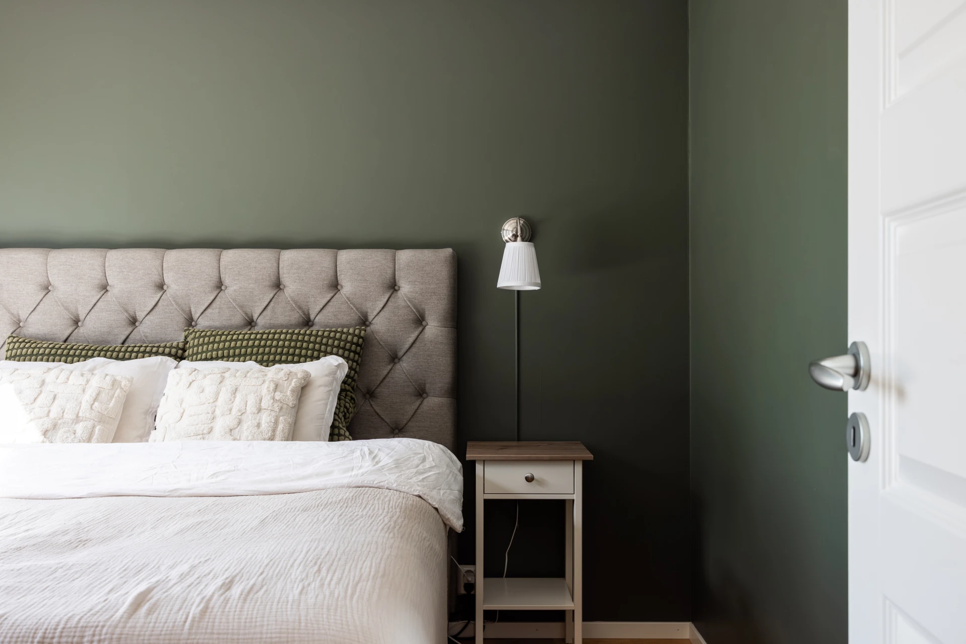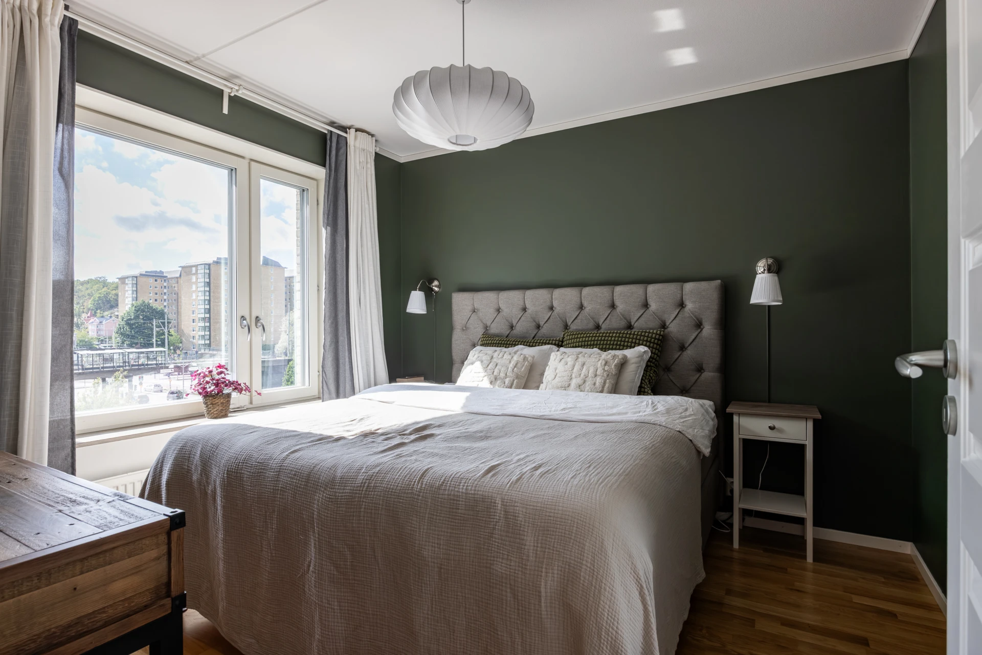 Parkettgolv och grönmålade väggar. Här finns plats för dubbelsäng med tillhörande möblemang. Förvaring i en skjutdörrsgarderob.
