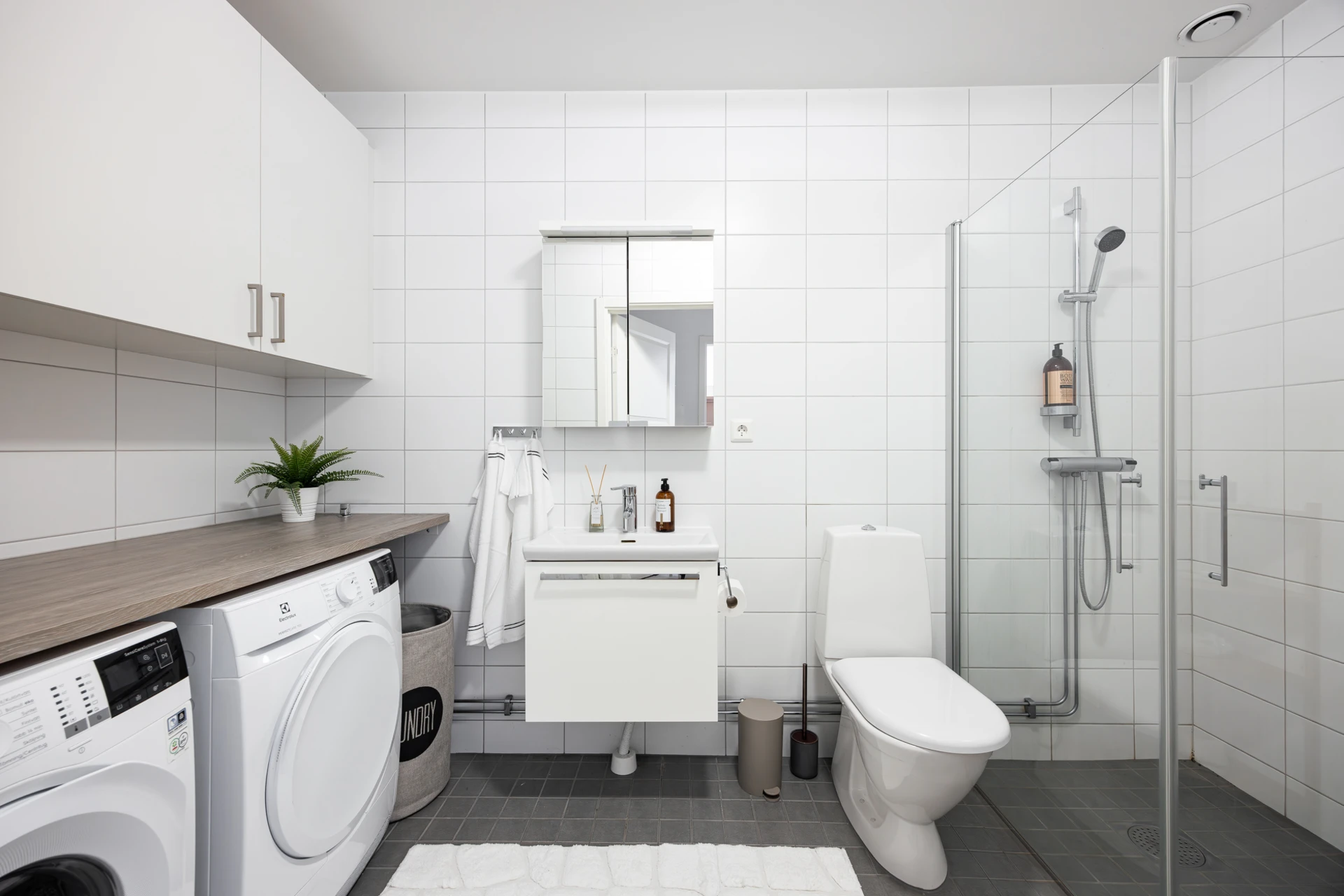 Grått klinkergolv och vita helkaklade väggar. Badrummet är utrustat med WC, handfat med kommod, spegelskåp, dusch med glasvägg, tvättmaskin och torktumlare. Förvaring i väggskåp.