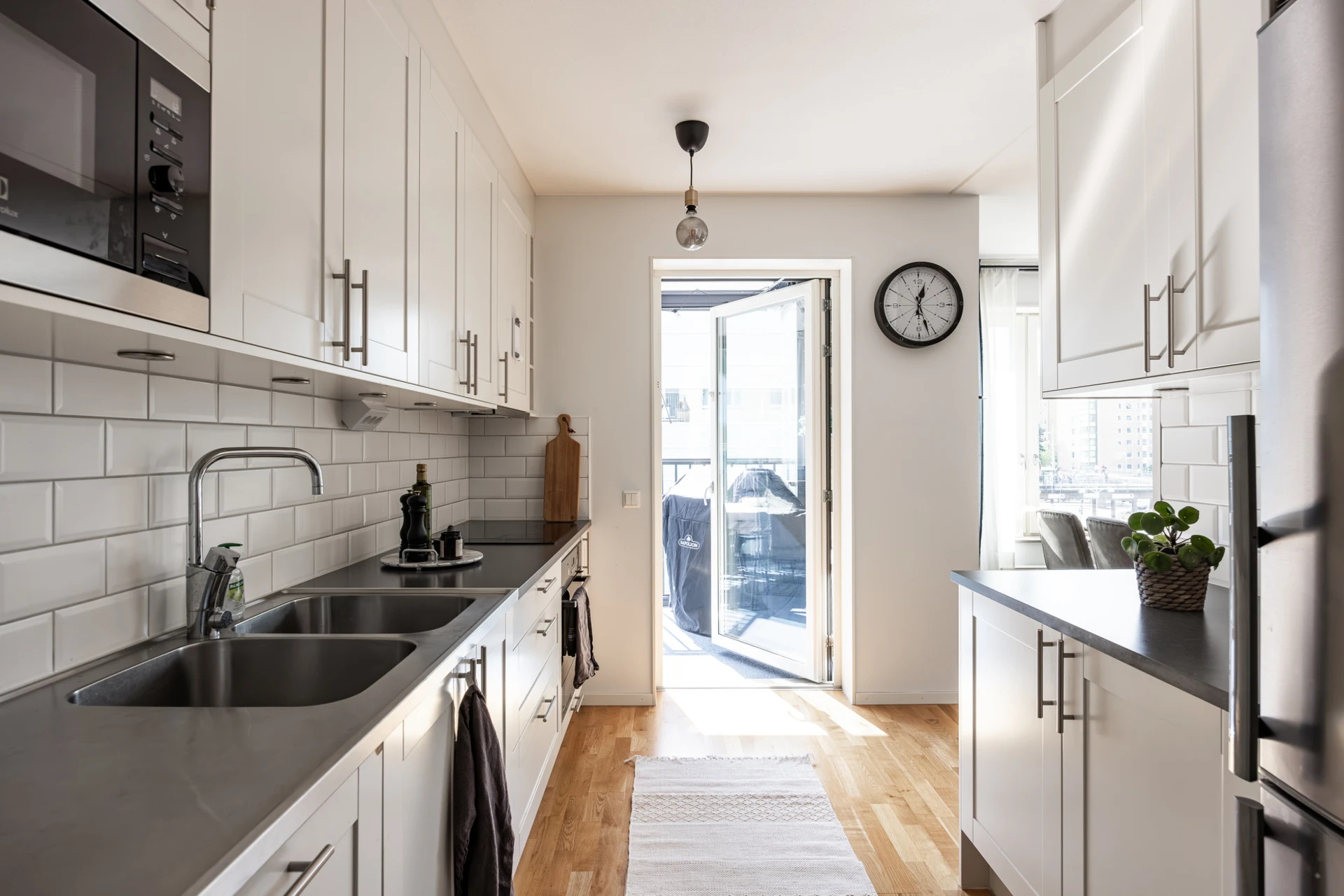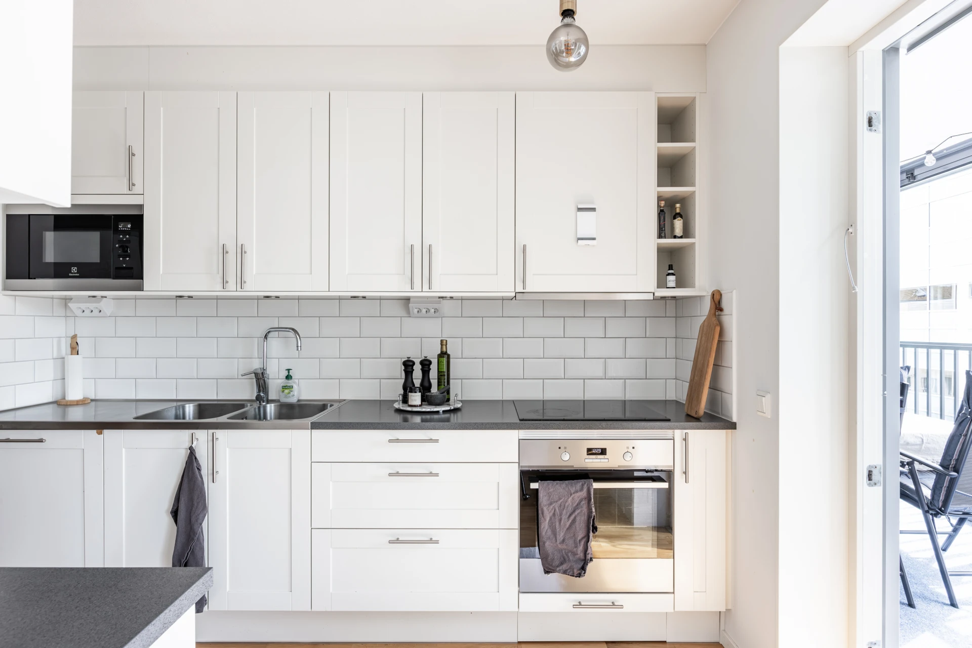 Parkettgolv och vitmålade väggar. Köksinredning i vitt från Marbodal och ovan bänkskivan i grått laminat sitter vitt kakel. Köket är utrustat med inbyggd kyl/frys, induktionshäll, ugn, köksfläkt, mikrovågsugn samt integrerad diskmaskin. Matplats för ca 6 personer. Belysning ( downlights ) under väggskåp samt fönsterbänk i natursten. Från köket når ni bostadens inglasade balkong i söderläge med plats för utemöbler.
