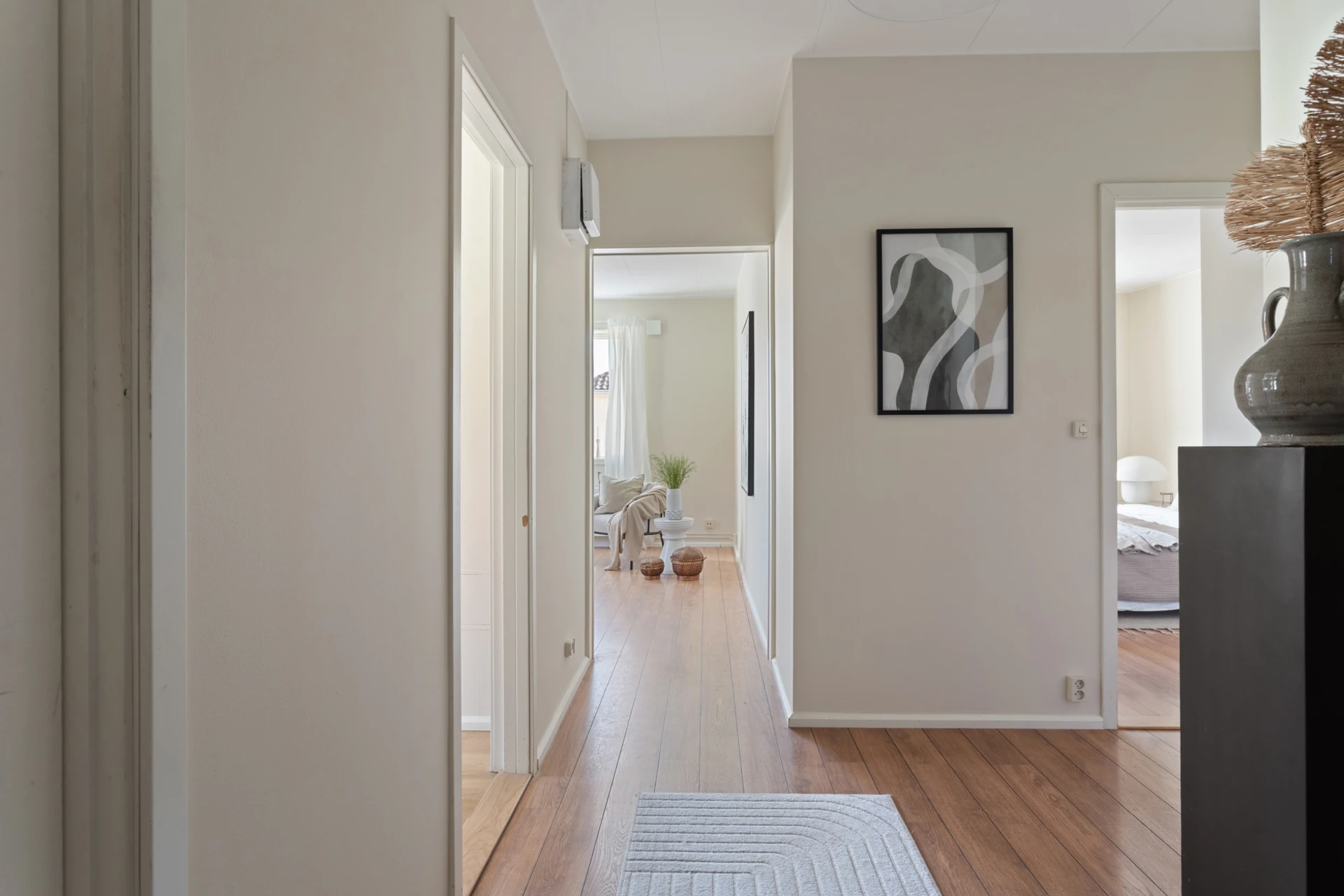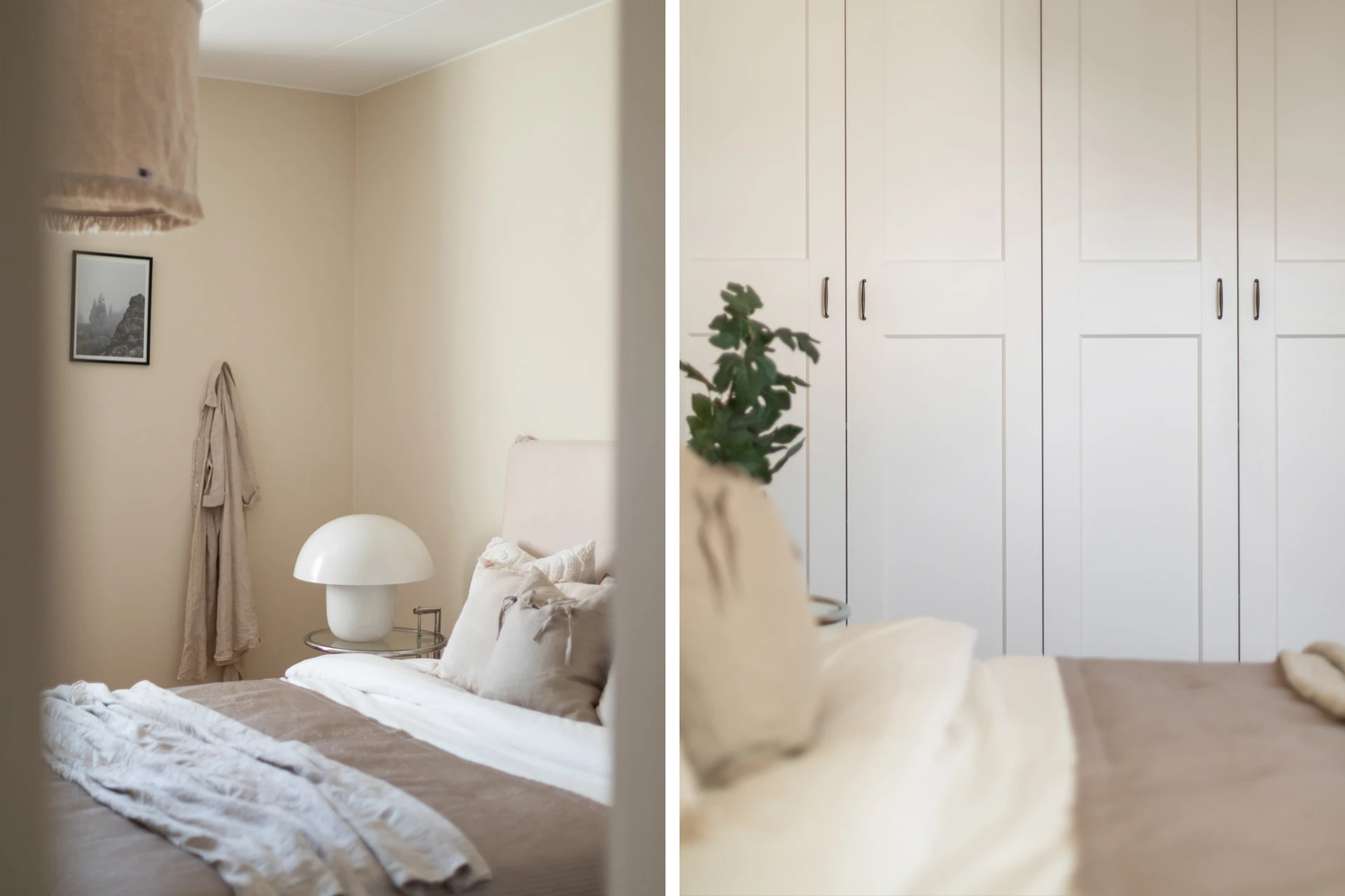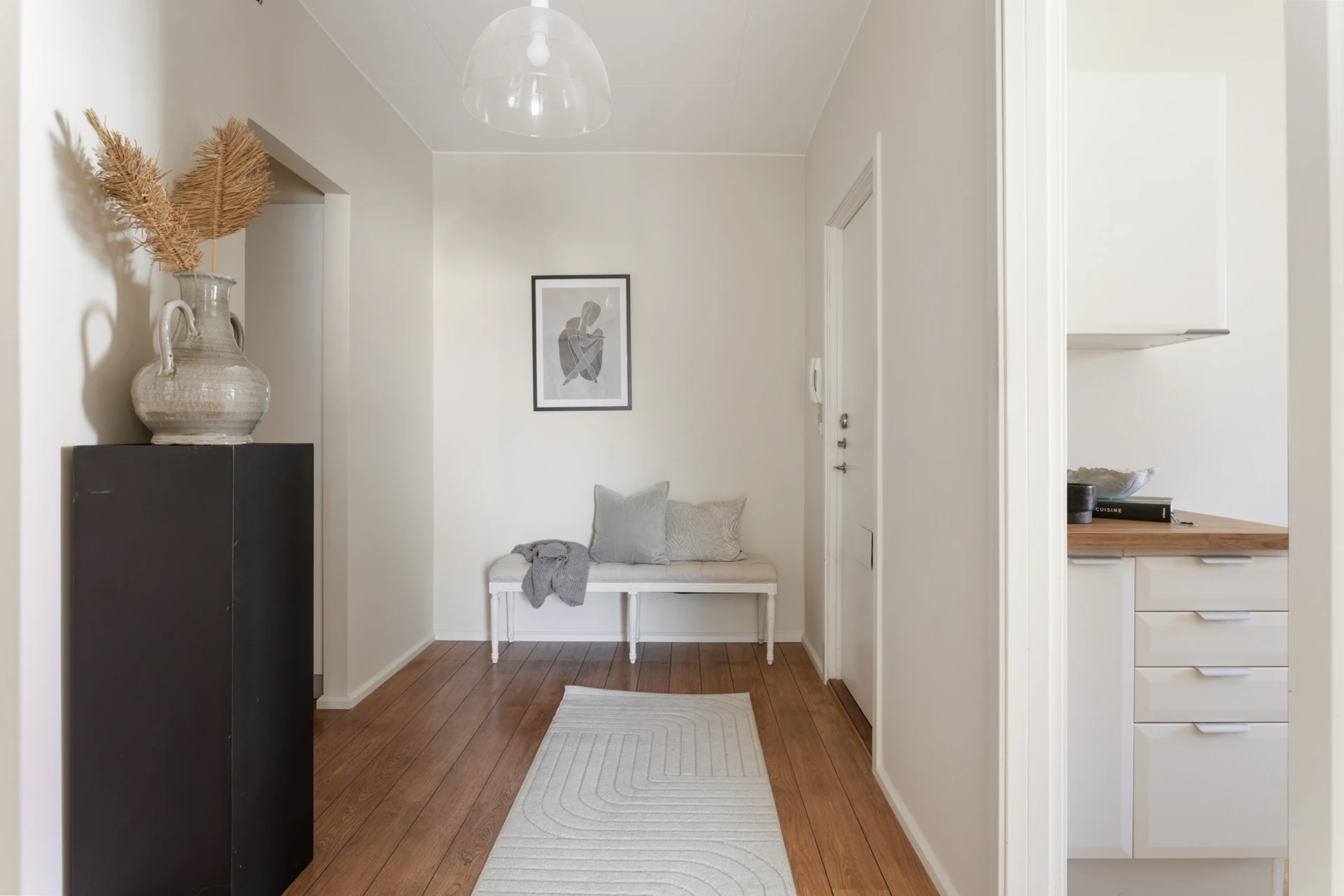 Laminatgolv och beige väggar. Här finns plats för avhängning och förvaring i tre garderober.