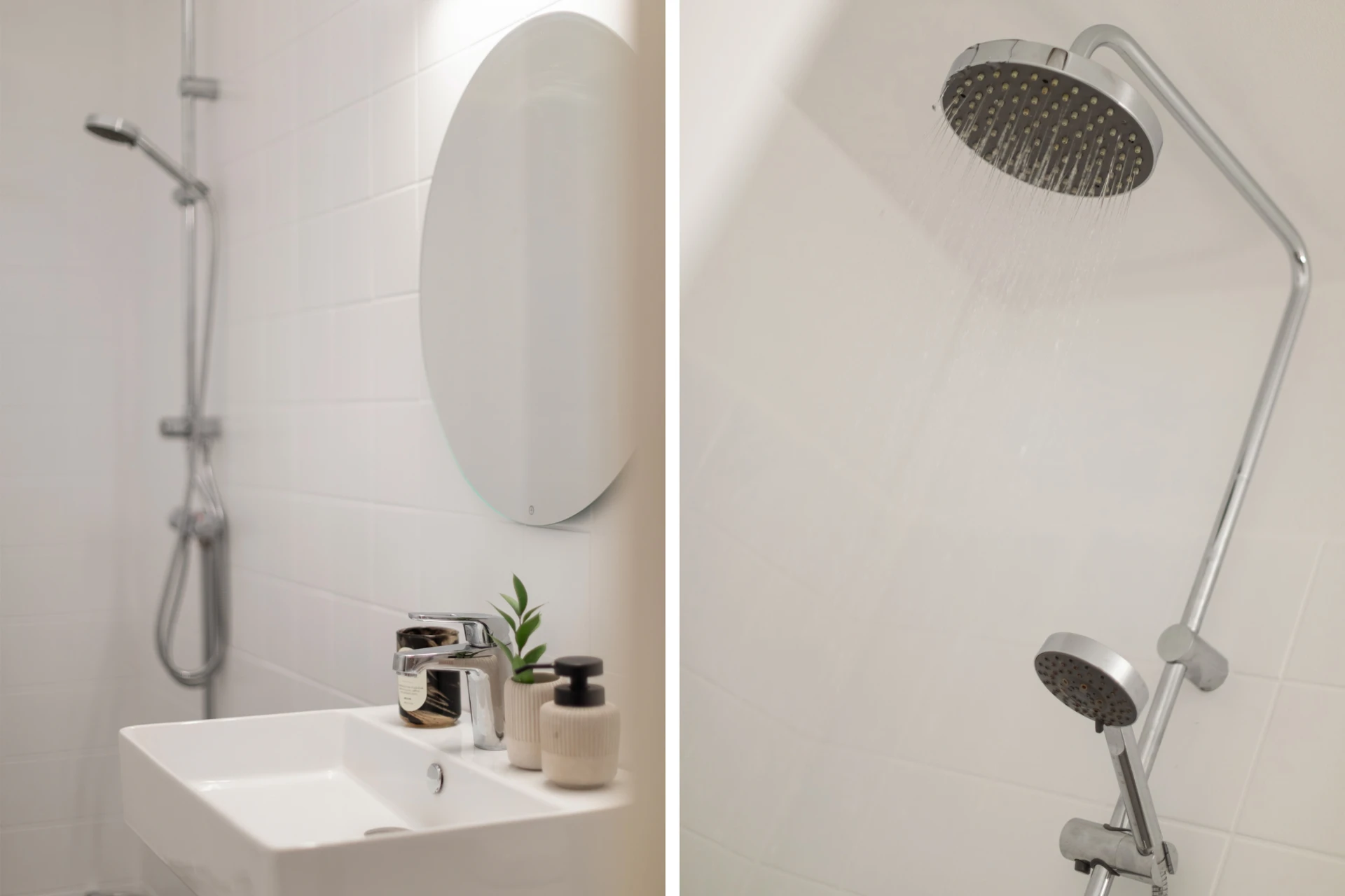 Våtrumsmatta och helkaklade väggar. Badrummet är utrustat med WC, handfat, spegel och dusch.