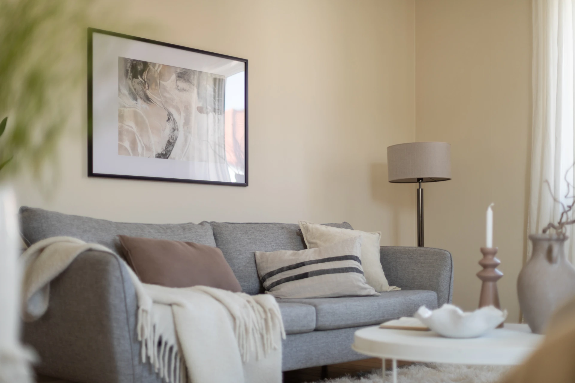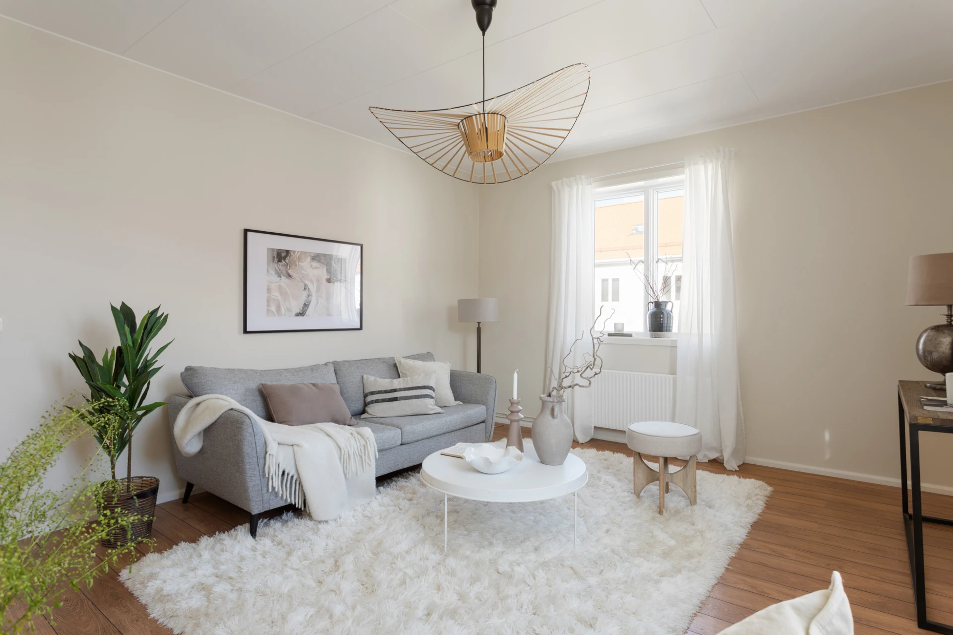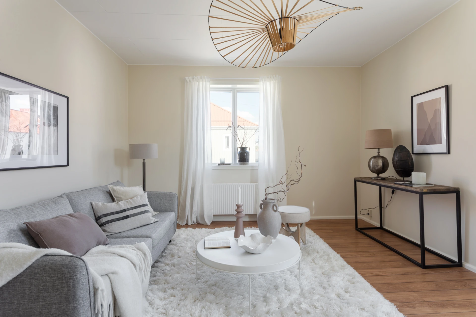 Laminatgolv och beige väggar. Här finns plats för soffa med tillhörande möblemang.