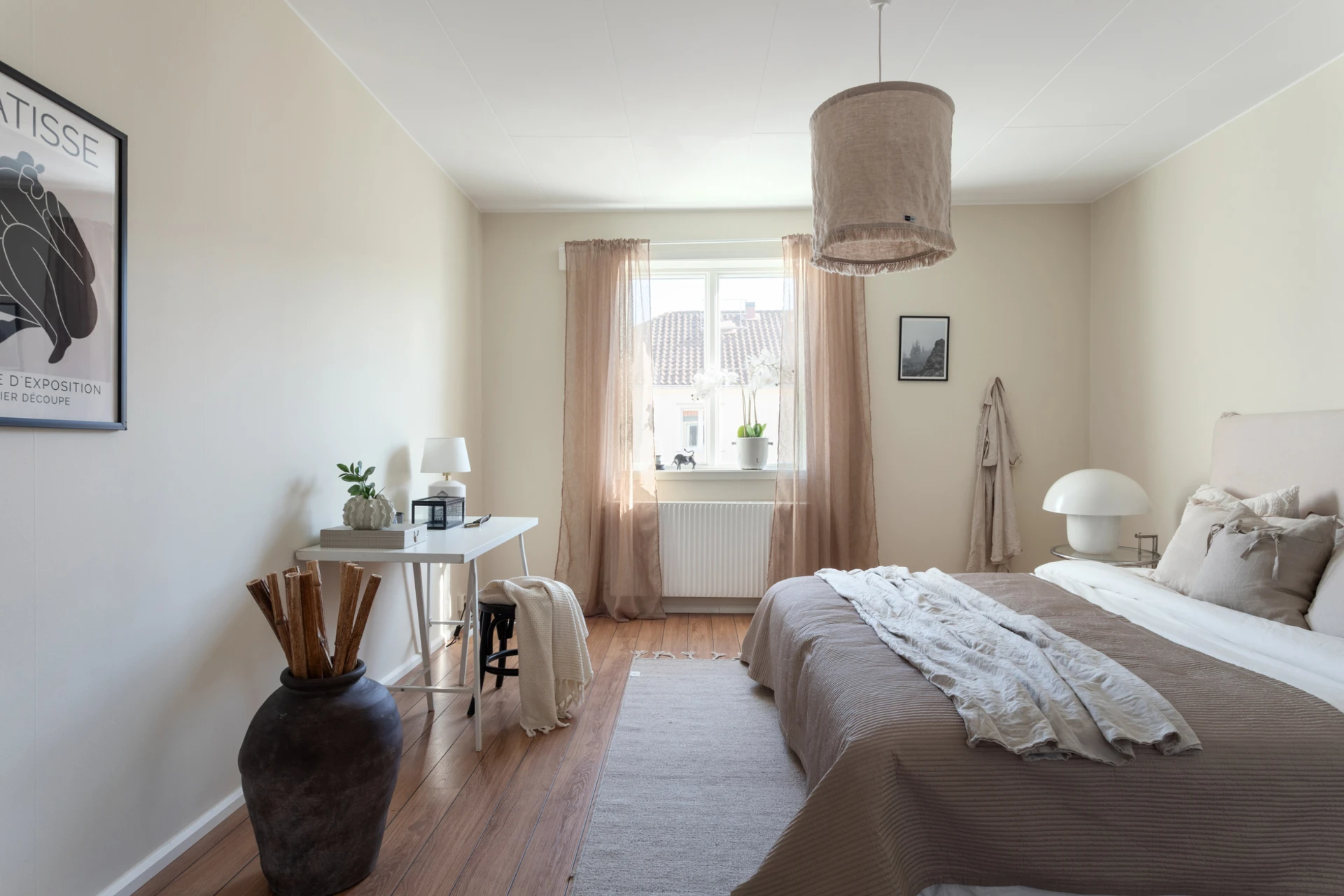 Laminatgolv och beige väggar. Här finns plats för dubbelsäng med tillhörande möblemang. Förvaring i två garderober.