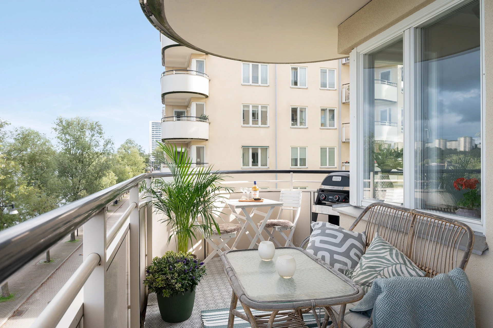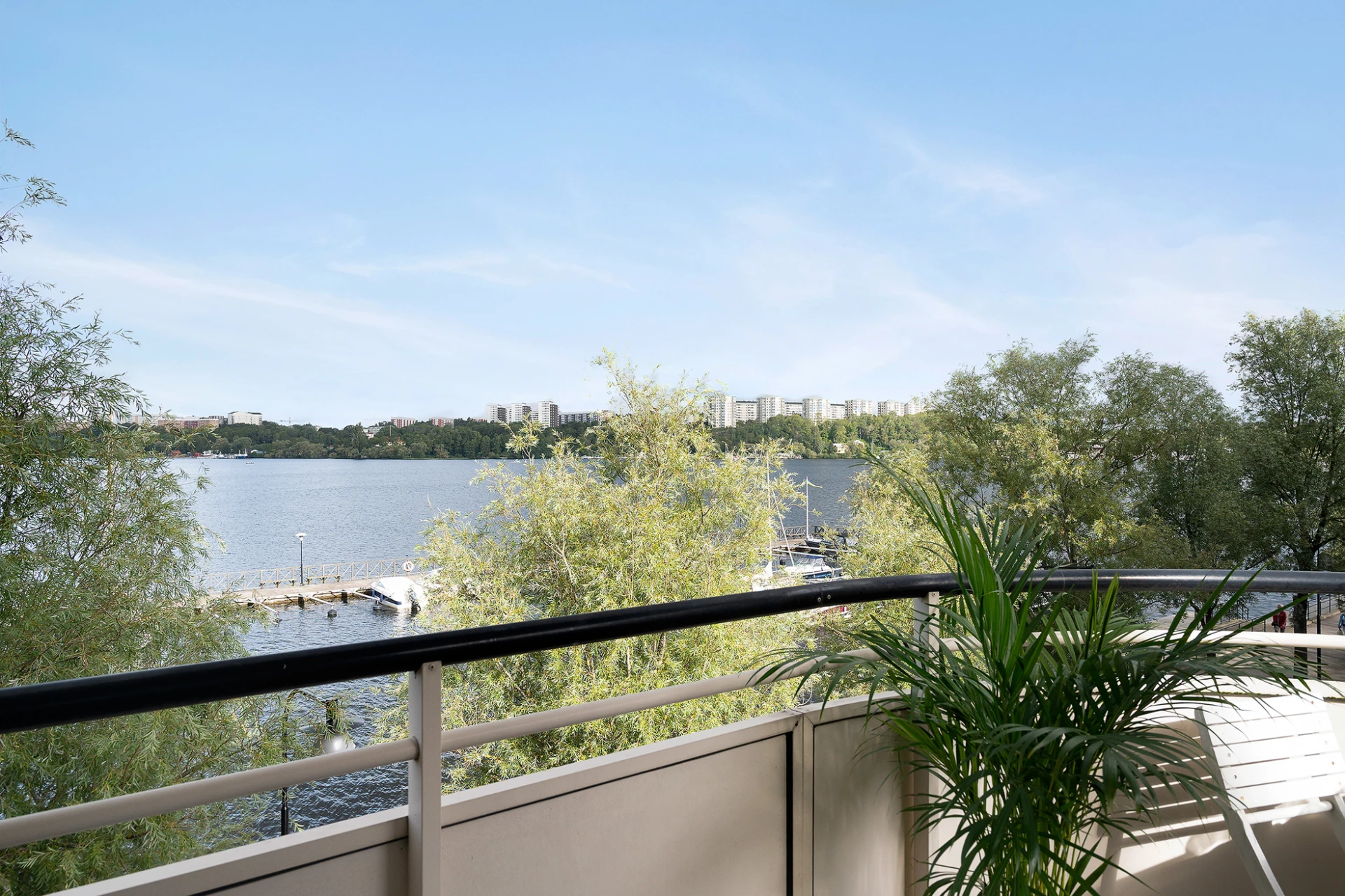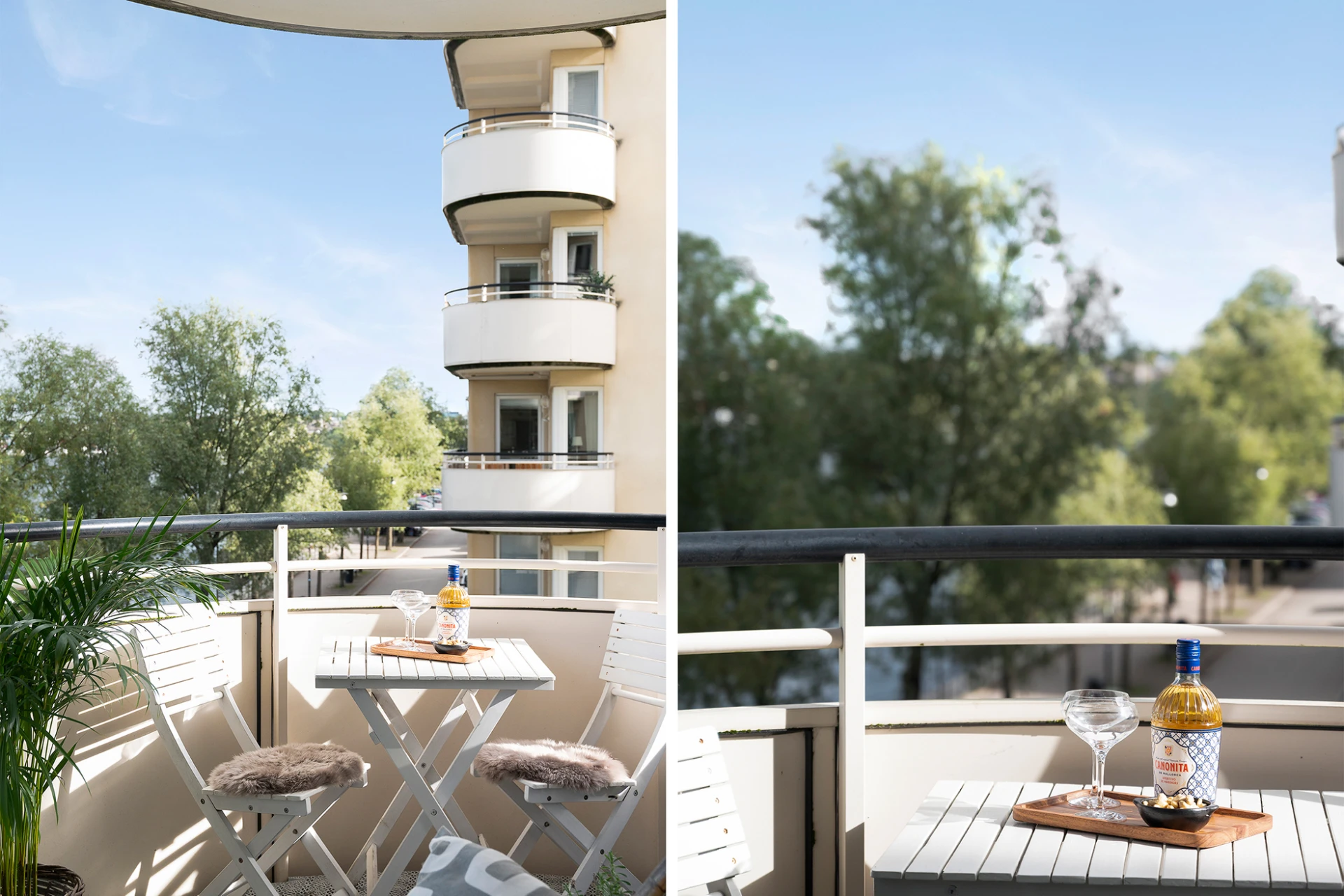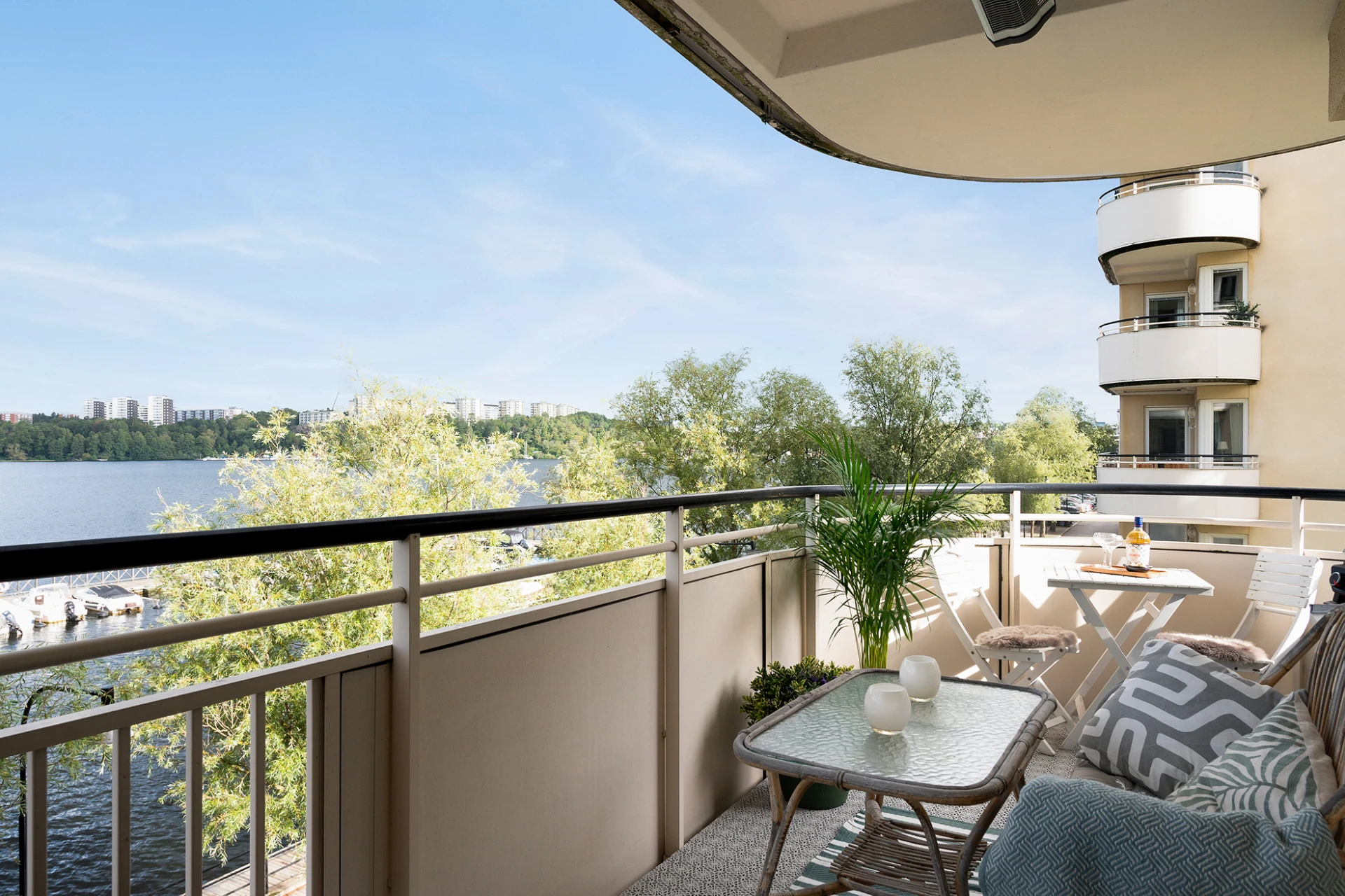 Här möts du av en underbar balkong med fri utsikt mot glittrande vatten - en plats där lugnet infinner sig direkt. Balkongen har sol från eftermiddagen och långt in på kvällen, vilket gör den perfekt för avkopplande stunder efter jobbet eller middagar i solnedgången.