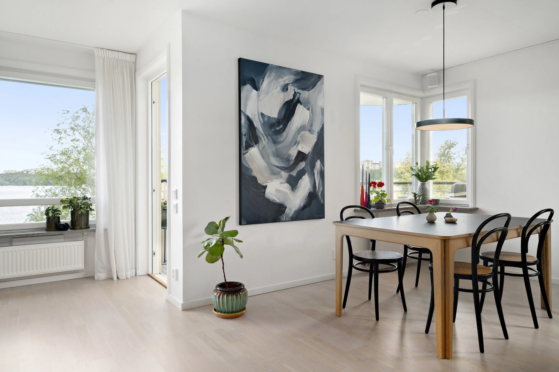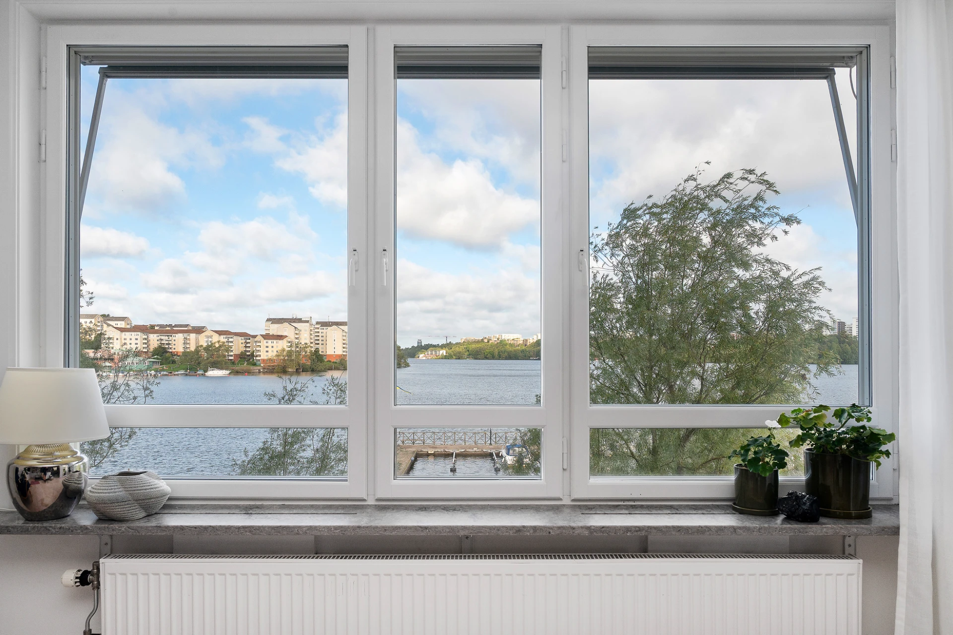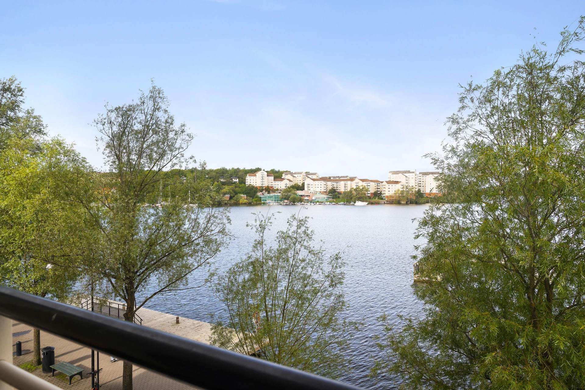 Här möts du av en underbar balkong med fri utsikt mot glittrande vatten - en plats där lugnet infinner sig direkt. Balkongen har sol från eftermiddagen och långt in på kvällen, vilket gör den perfekt för avkopplande stunder efter jobbet eller middagar i solnedgången.