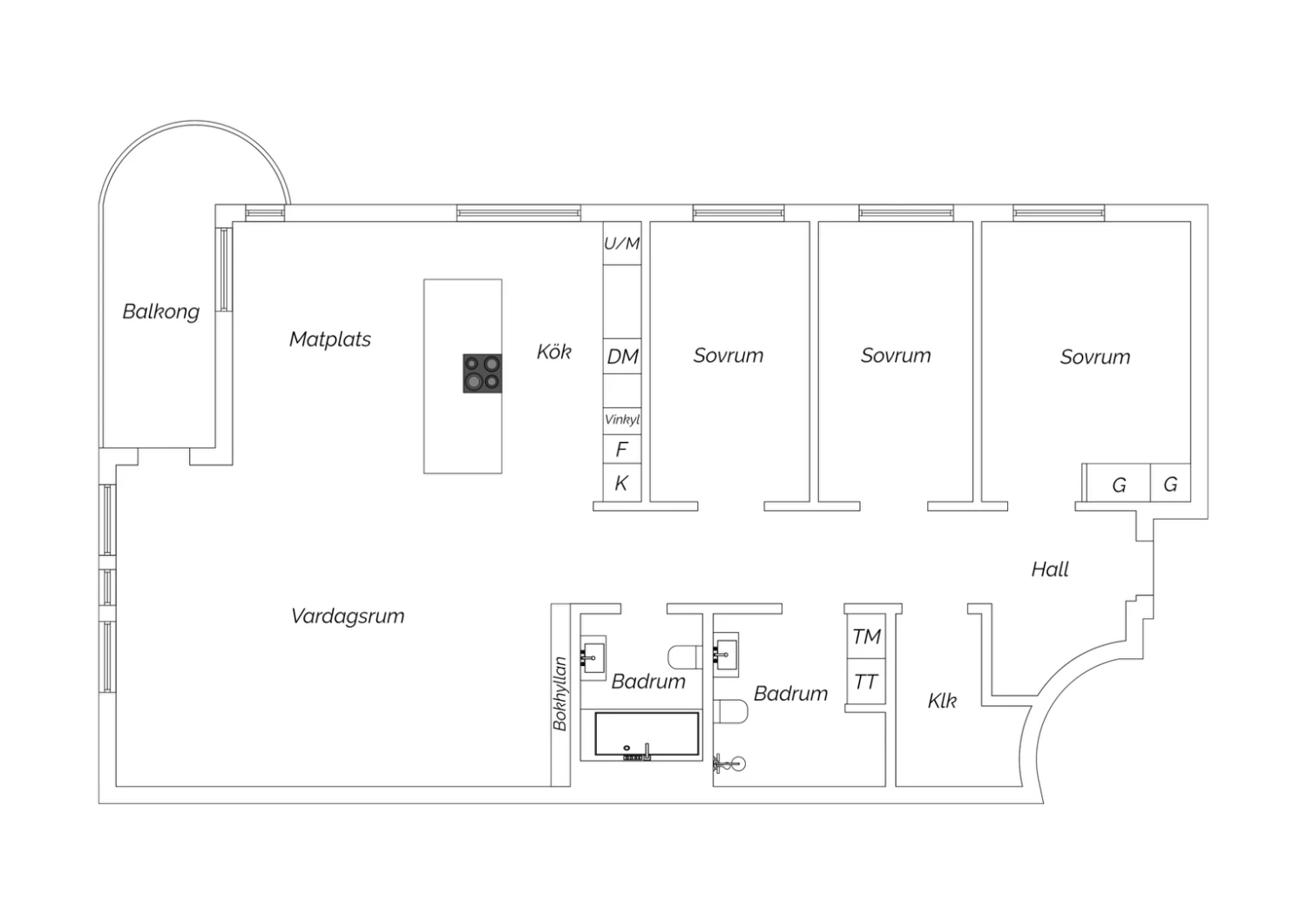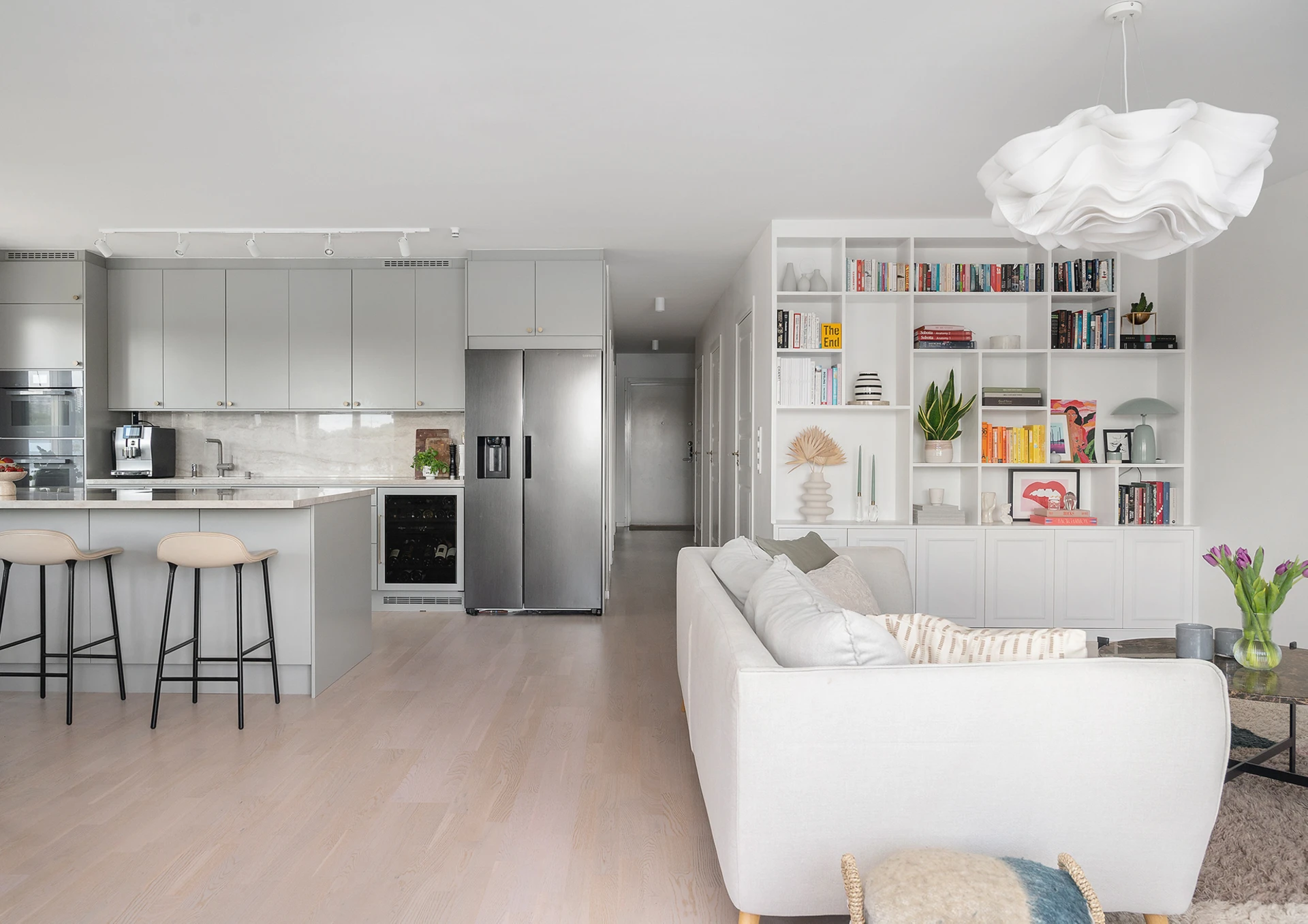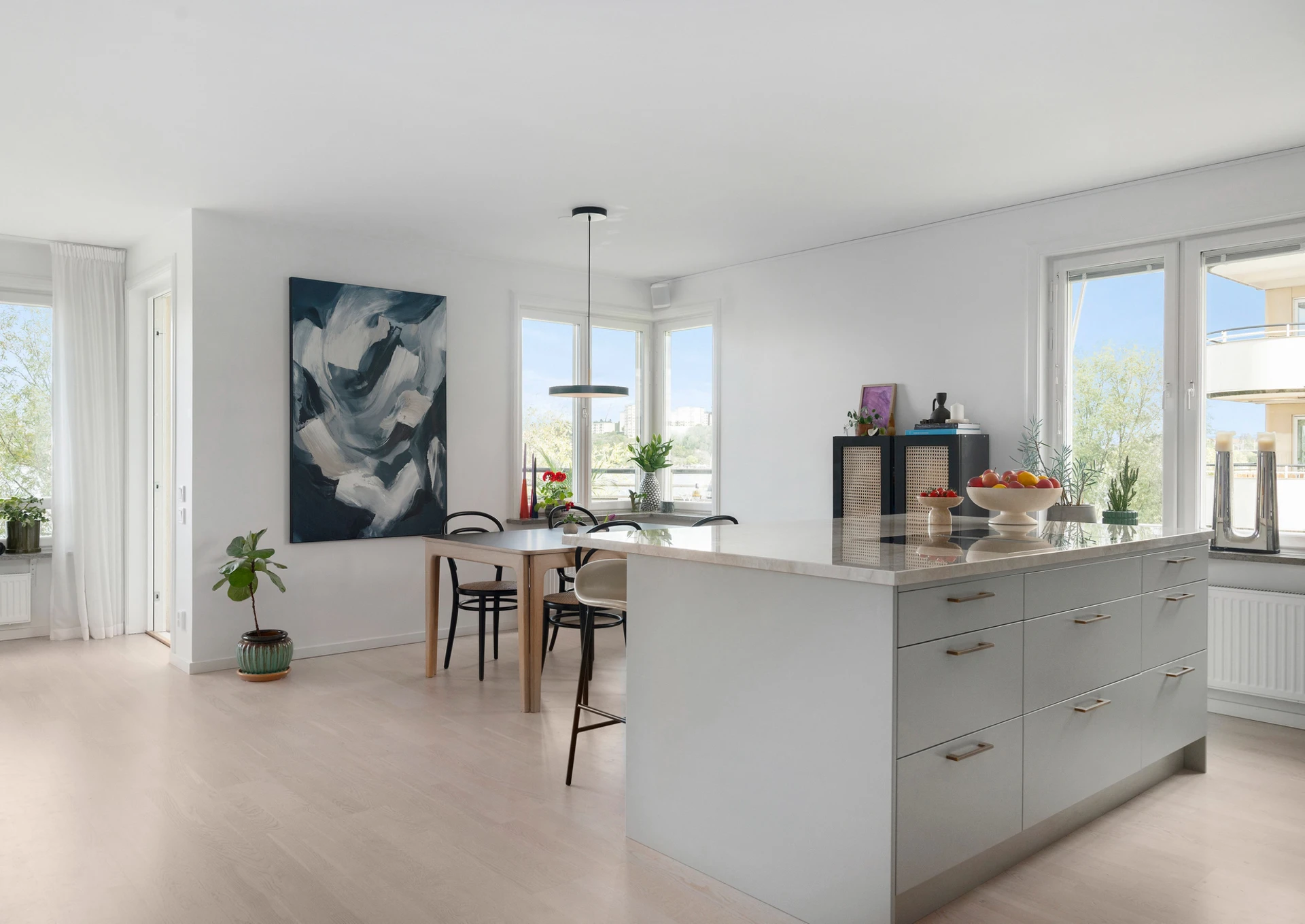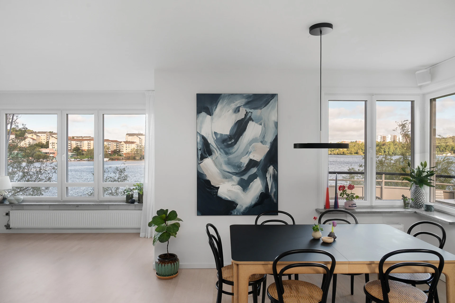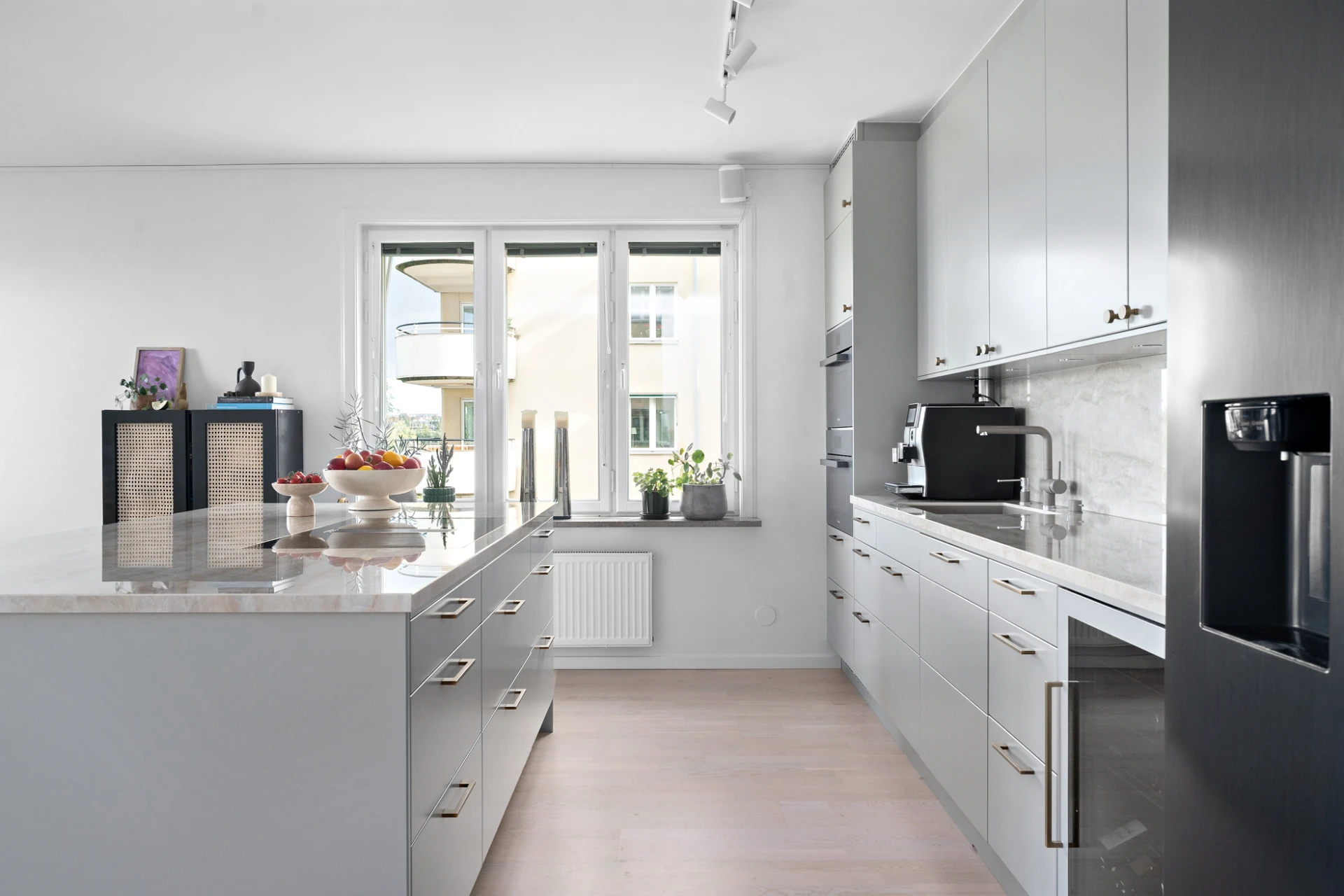 Här har du även en generös köksö med spishäll och integrerad köksfläkt på exklusiv stenskiva (Dekton) - perfekt för både matlagning och socialt umgänge. Här kan du laga mat medans du skådar båtarna som kör över det glittrande vattnet. Köket erbjuder generösa arbetsytor, gott om förvaring och genomtänkta lösningar som gör vardagen smidig. Här finns också en utvändig elektrisk markis (somfy).
