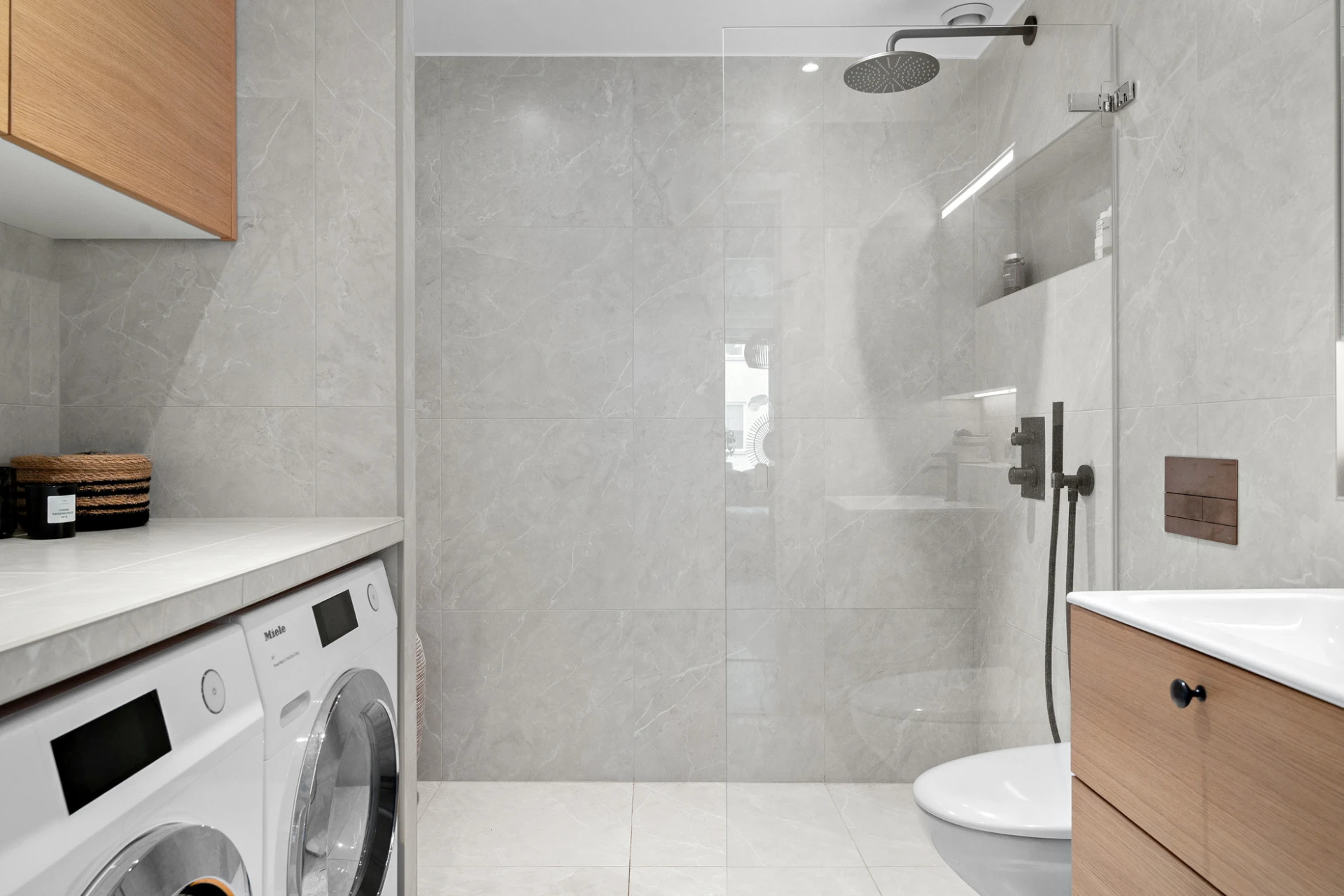 I badrummet finns även en separat tvättsektion med tvättmaskin och torktumlare från Miele, snyggt integrerade under en arbetsbänk med överhängande förvaringsskåp.