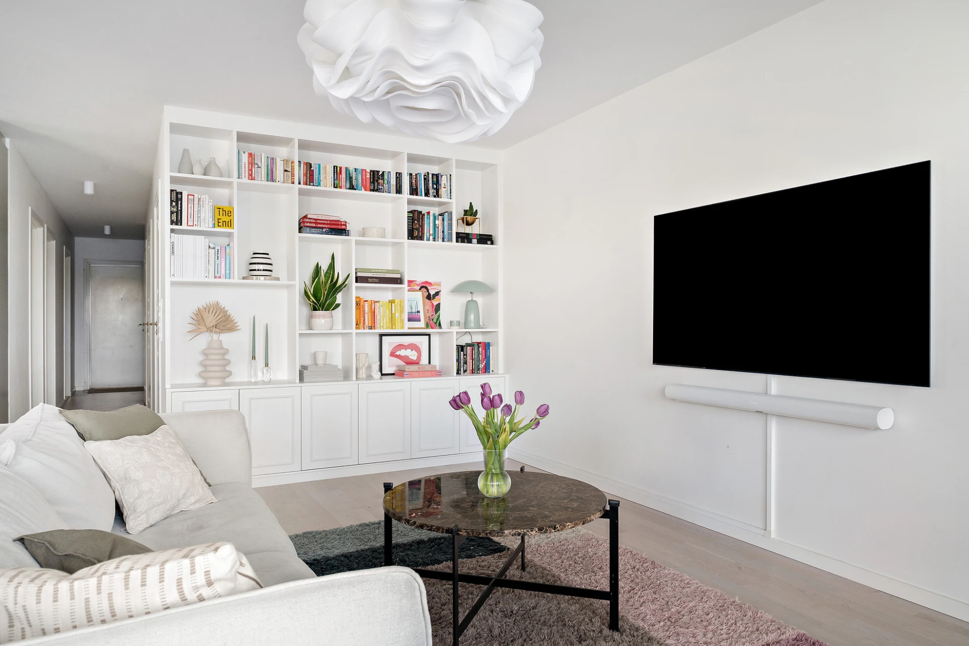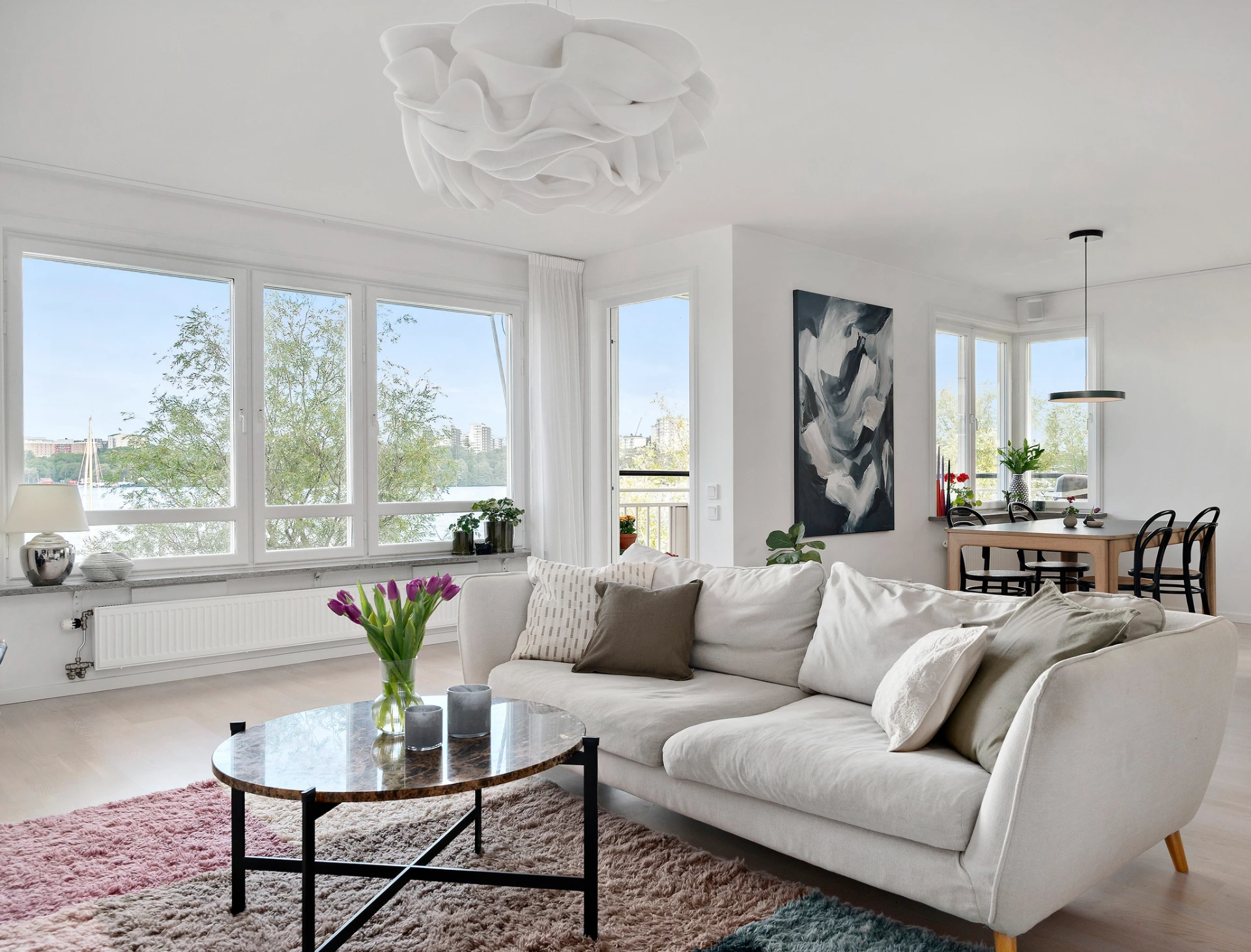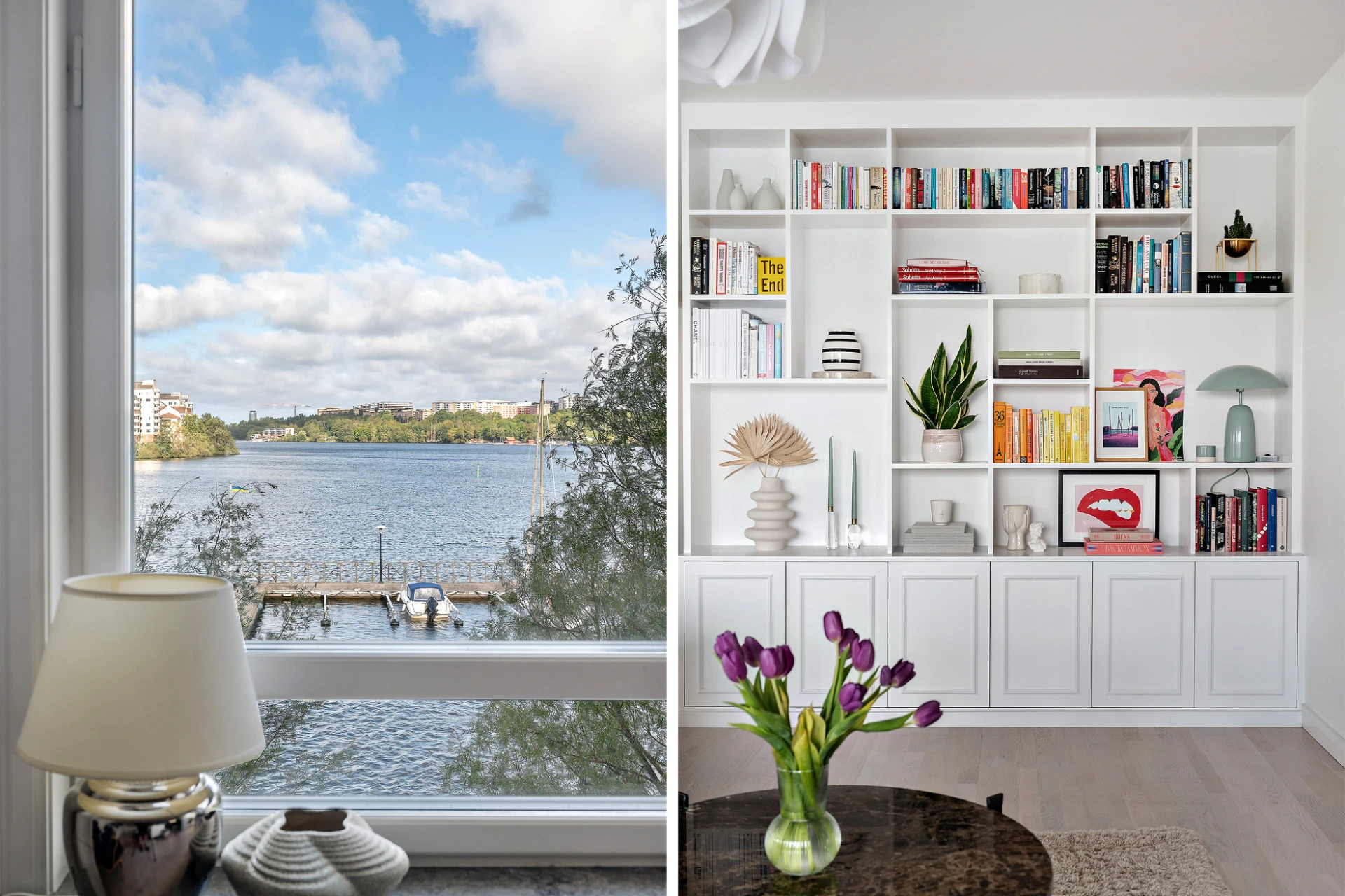Ett mycket stort och underbart vardagsrum med öppen planlösning och generöst ljusinsläpp från generösa fönsterpartier med utsikt över glittrande vatten! På fönstren finns elektrisk markis. Den inbyggda bokhyllan erbjuder förvaringsmöjligheter för prydnader. Här finns gott om plats för både umgänge, avkoppling och lek - perfekt för hela familjen!