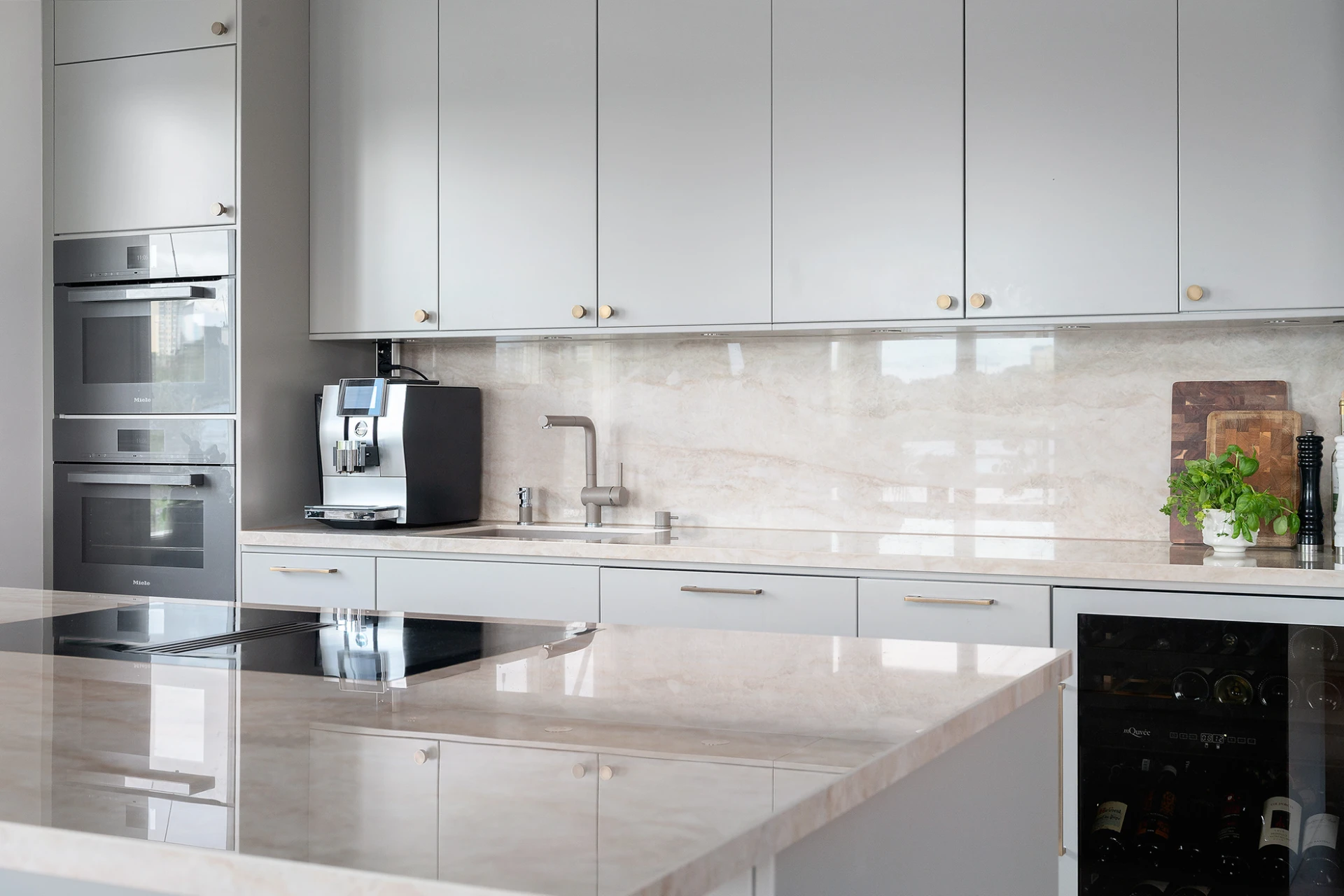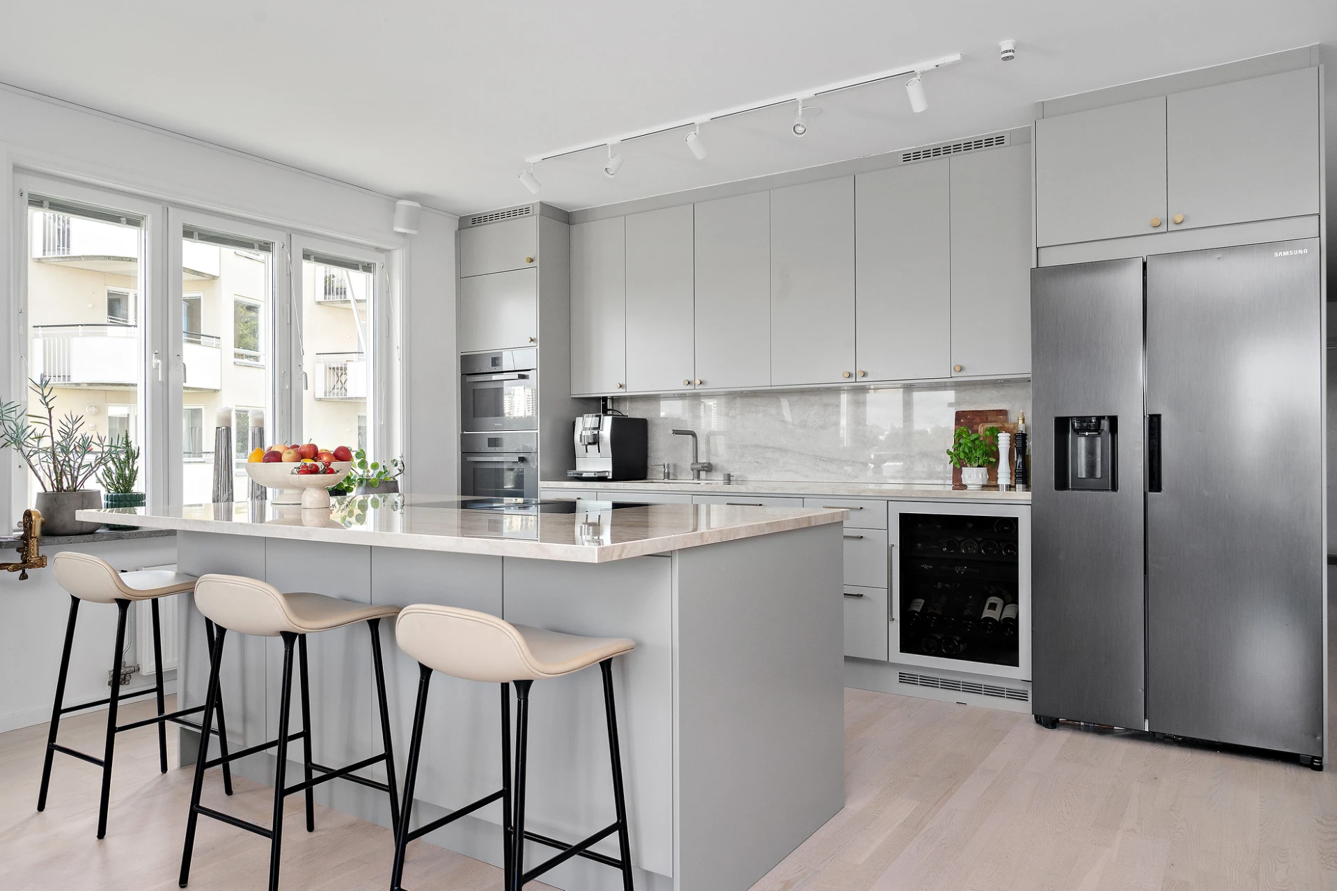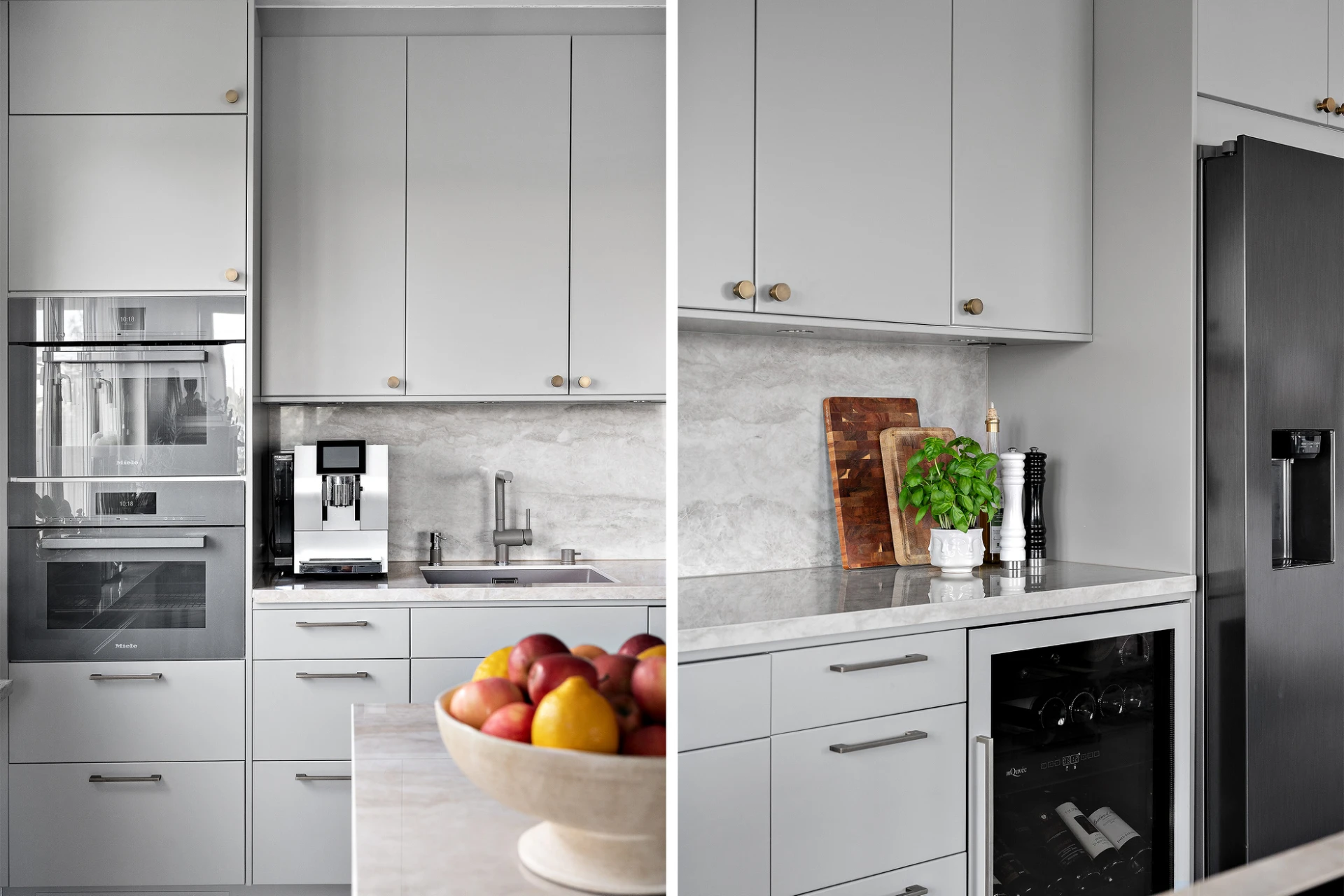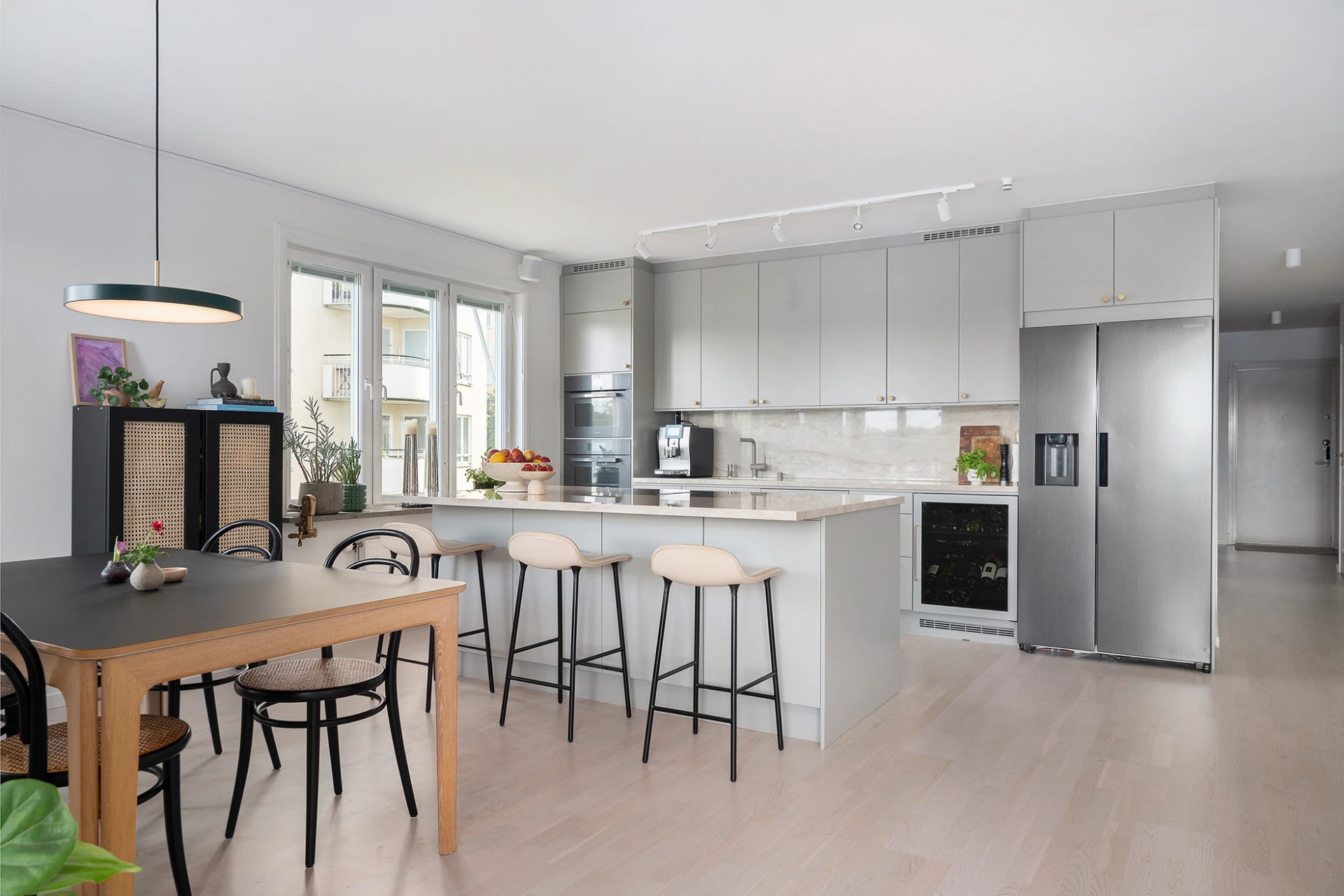 Det moderna och påkostade köket från Ballingslöv är hemmets naturliga samlingspunkt. Här möts design och funktion i en harmonisk helhet med gråsläta skåpluckor, moderna vitvaror såsom side-by-side kyl/frys med inbyggd ismaskin (Samsung), vinkyl, en kombinerad ugn/micro och en kombinerad ångugn (Miele).