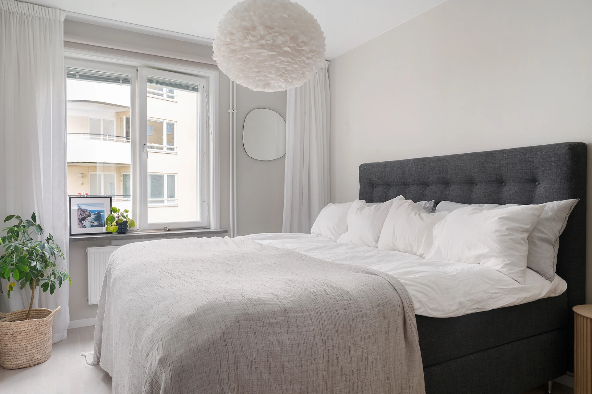 Det här sovrummet bjuder på en lugn och harmonisk atmosfär med ljusa väggar, vitlaserat trägolv och naturligt ljusinsläpp som skapar en inbjudande känsla. Det stora fönstret ger rummet ett fint ljusflöde, och har elektrisk mörkläggande gardin för nätterna (somfy). Här finns goda förvaringsmöjligheter i en praktisk garderobslösning.