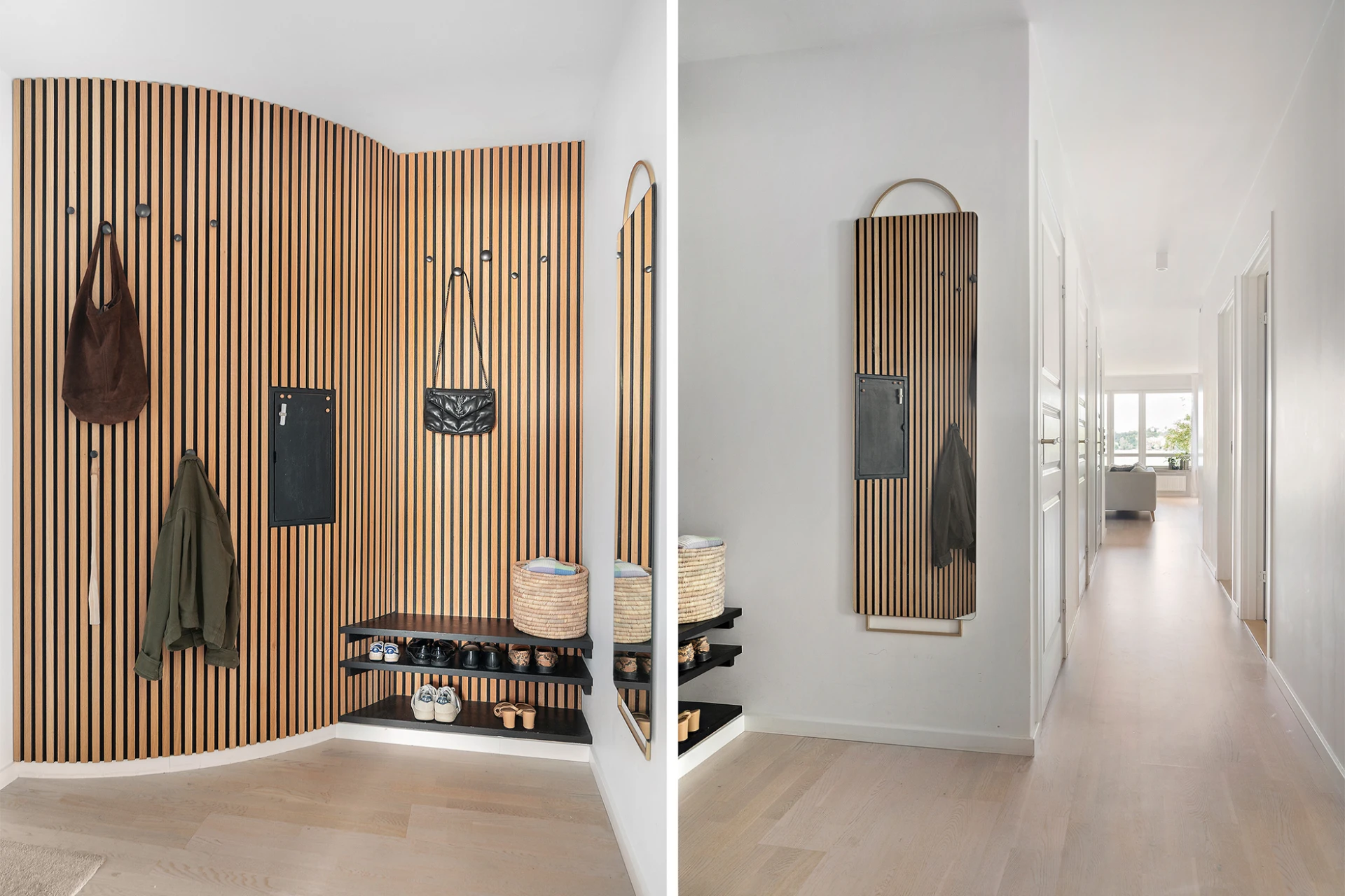 Redan i hallen möts du av stilren design och smarta lösningar. Väggarna är klädda i dekorativ träpanel med vertikala ribbor som skapar en exklusiv och inbjudande känsla. Här finns en platsbyggd sittbänk med förvaring för skor, samt krokar för jackor och väskor - både praktiskt och snyggt.