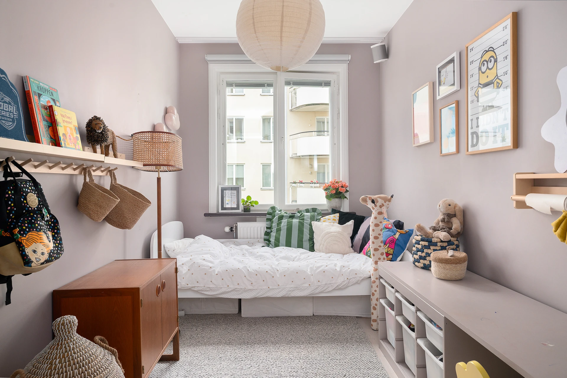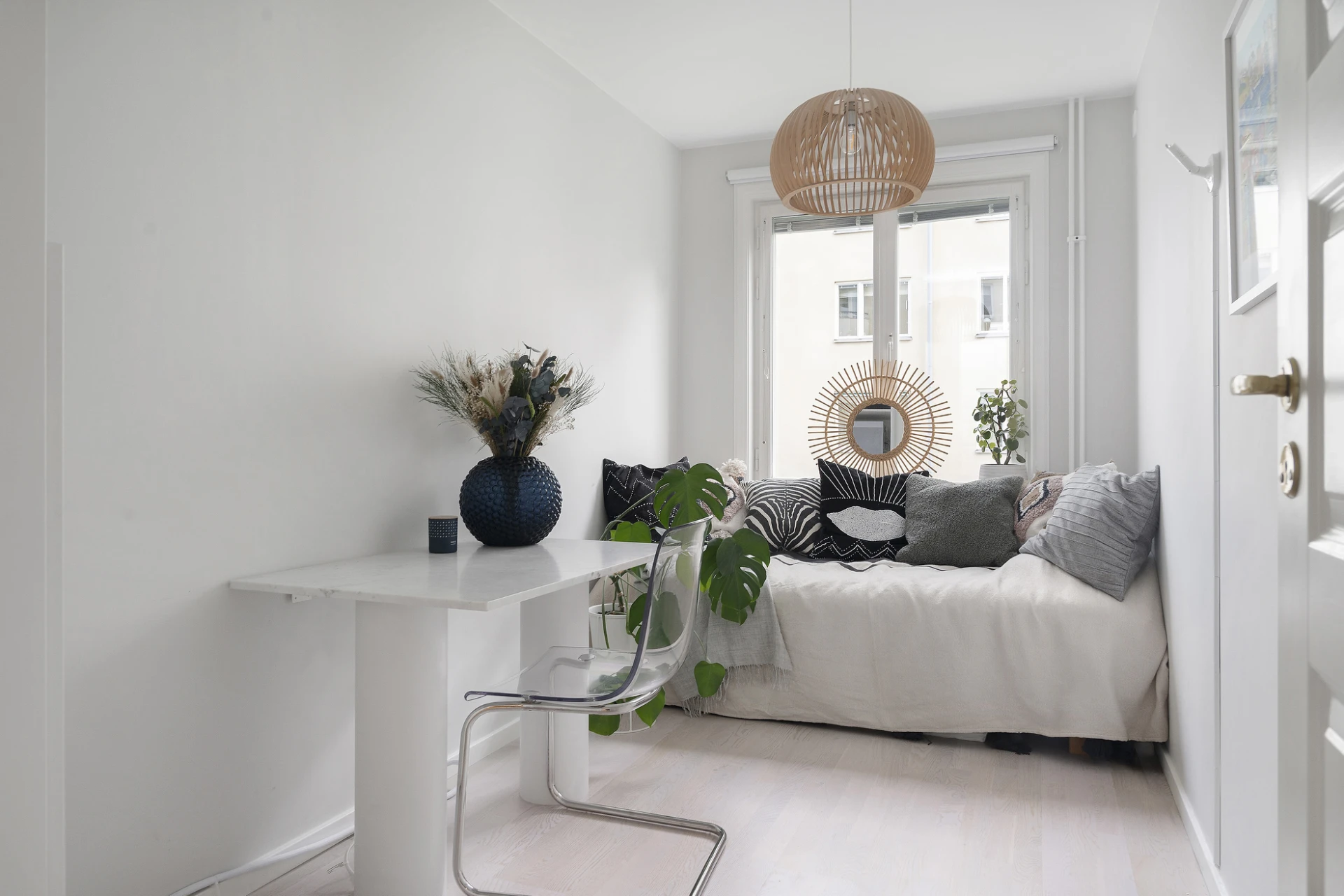 Detta ljusa och trivsamma sovrum har en harmonisk känsla med vitlaserat trägolv, ljusa väggar och ett stort fönster som släpper in generöst med dagsljus. Även här hittar du elektrisk mörkläggande gardin för nätterna (somfy). Rummet är enkelt möblerat med plats för både säng och skrivbord eller läshörna, vilket gör det perfekt som barnrum, gästrum eller hemmakontor.