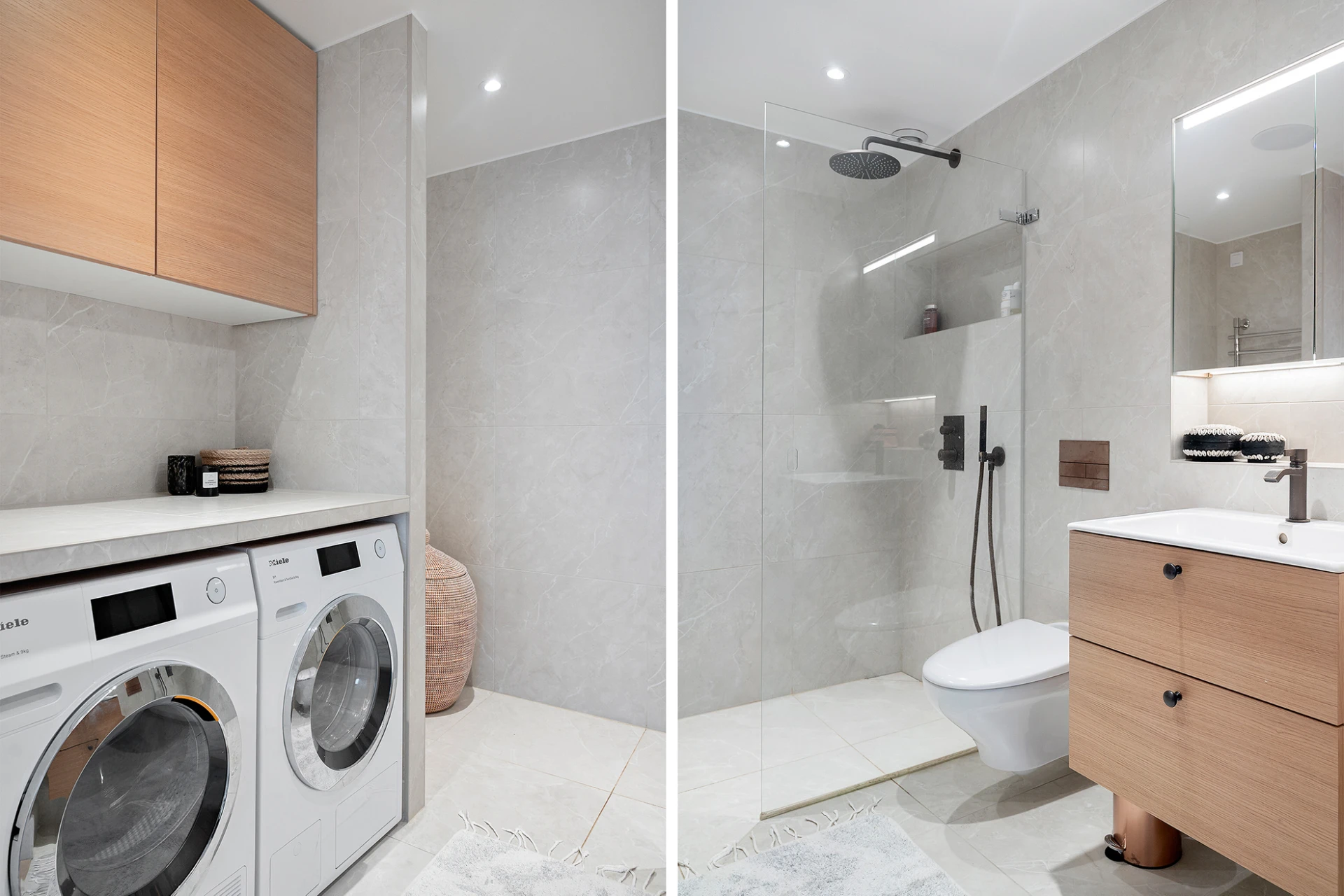 Ett stilfullt och rymligt badrum som förenklar vardagen och förhöjer helhetsintrycket av bostaden.