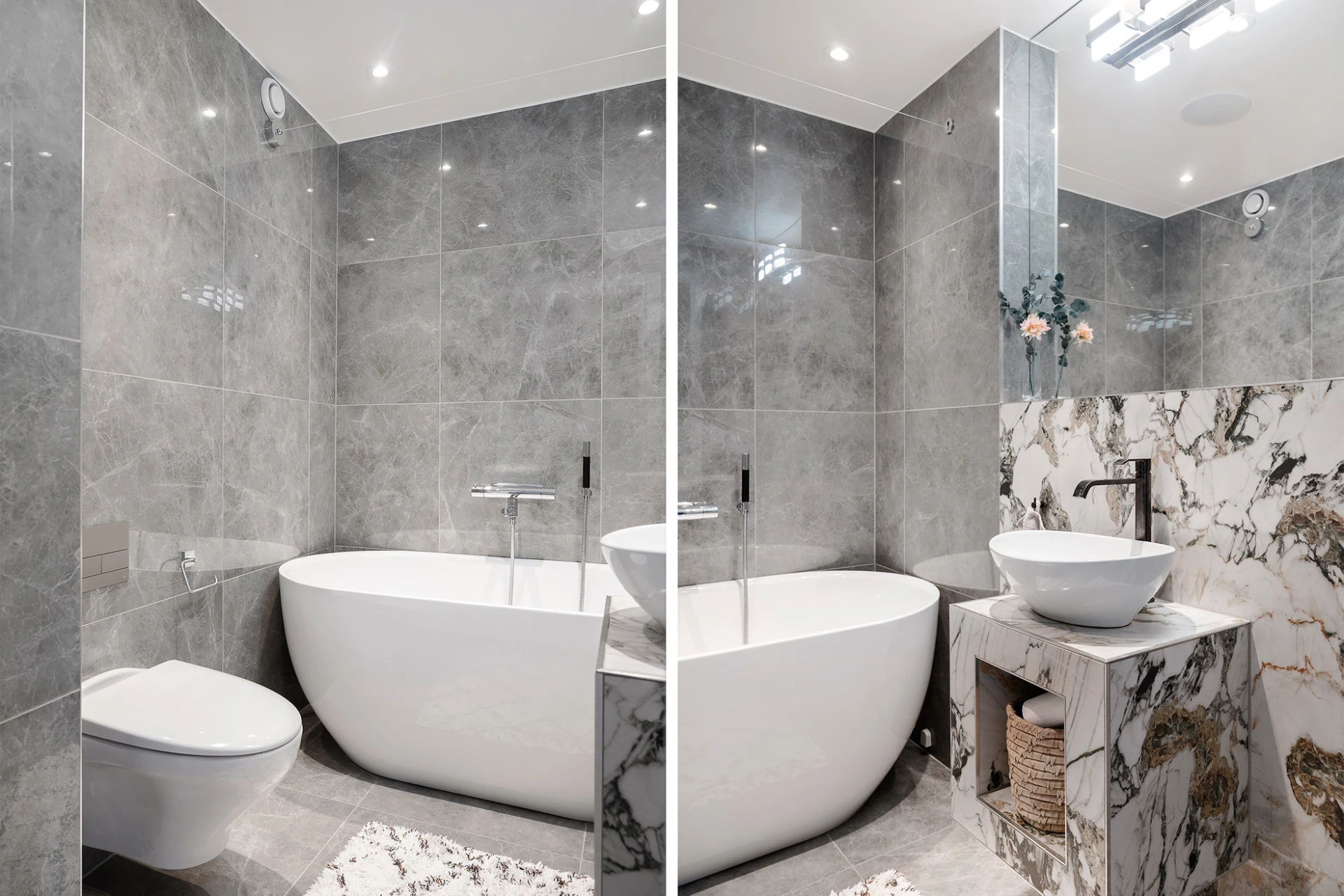 Unikt för denna lägenheten är det andra badrummet, där de flesta liknande lägenheter endast har en gästtoalett. Ett modernt fullstort badrum med bekväm golvvärme och inbyggd tak-högtalare för en mer exklusiv känsla. Grå marmorinspirerade väggar, fristående badkar och elegant svart armatur skapar en lyxig spakänsla. Det fristående handfatet på kommoden ger ett stilrent intryck, och infällda spotlights bidrar till en varm och avkopplande atmosfär.