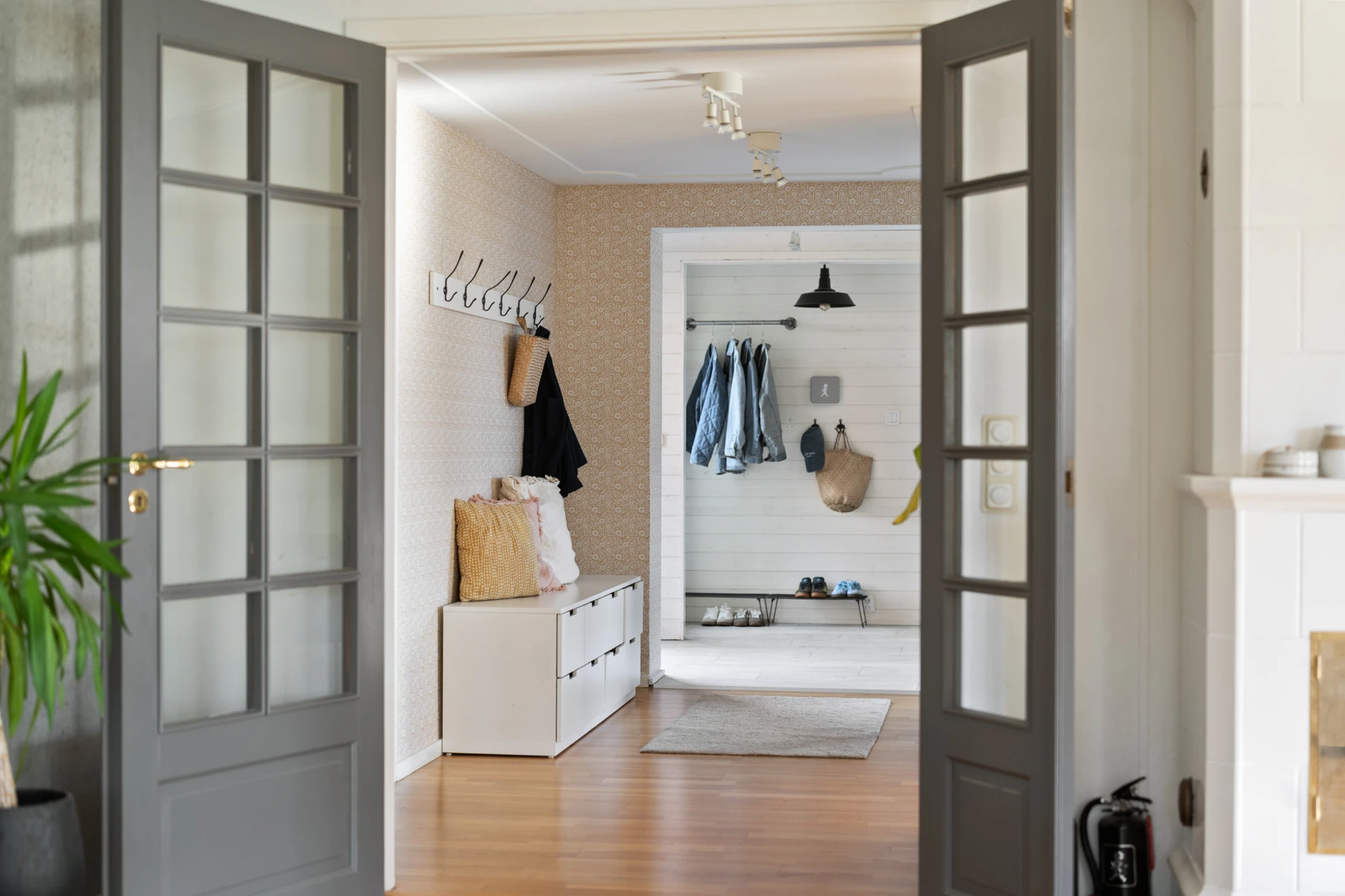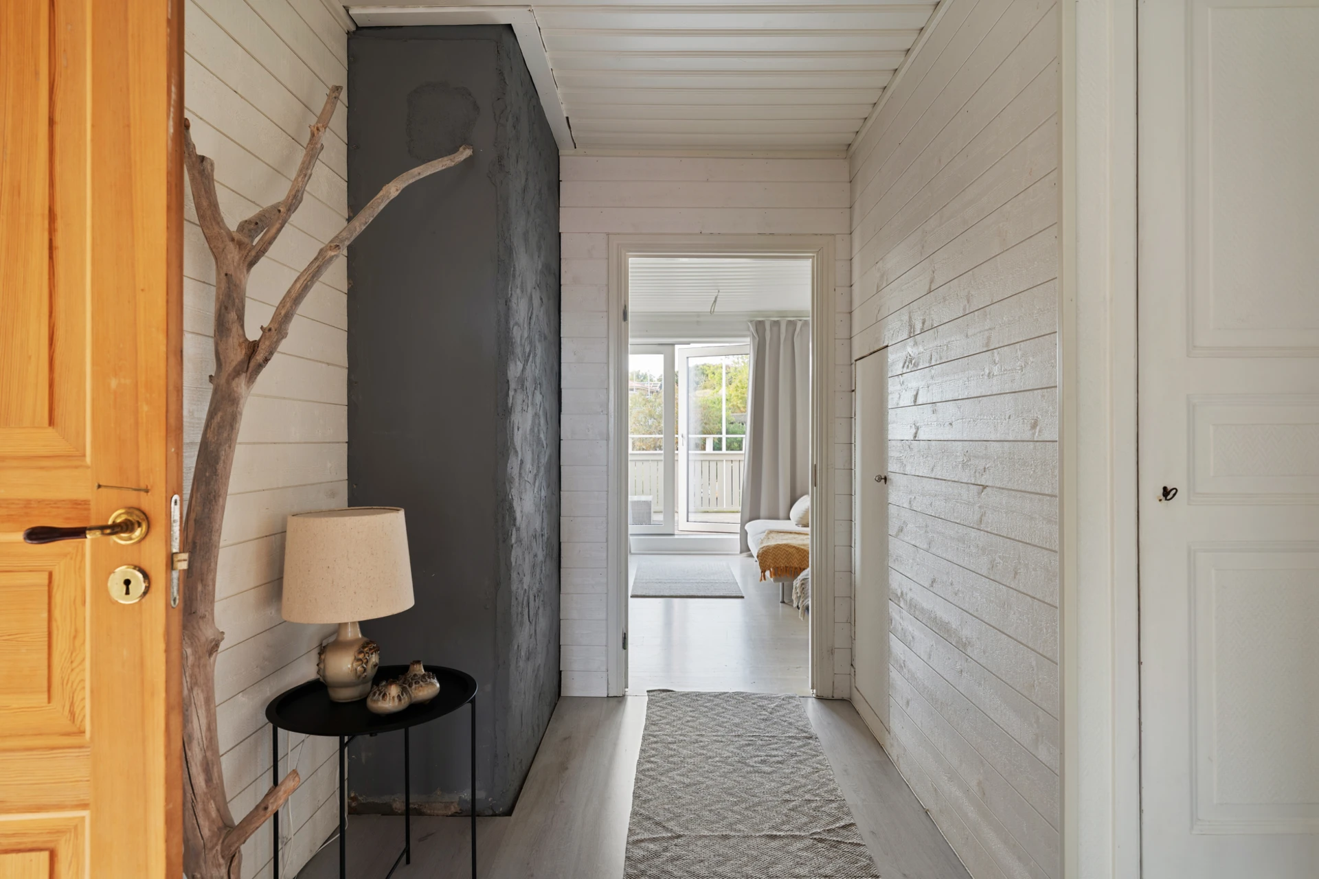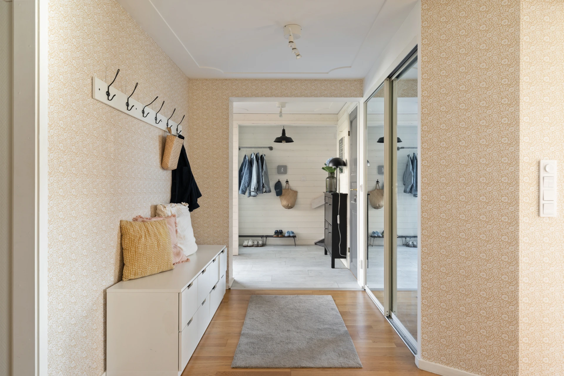 Laminatgolv med golvvärme och vit träpanel. Här finns plats för avhängning av ytterkläder samt förvaring i skjutdörrsgarderober.