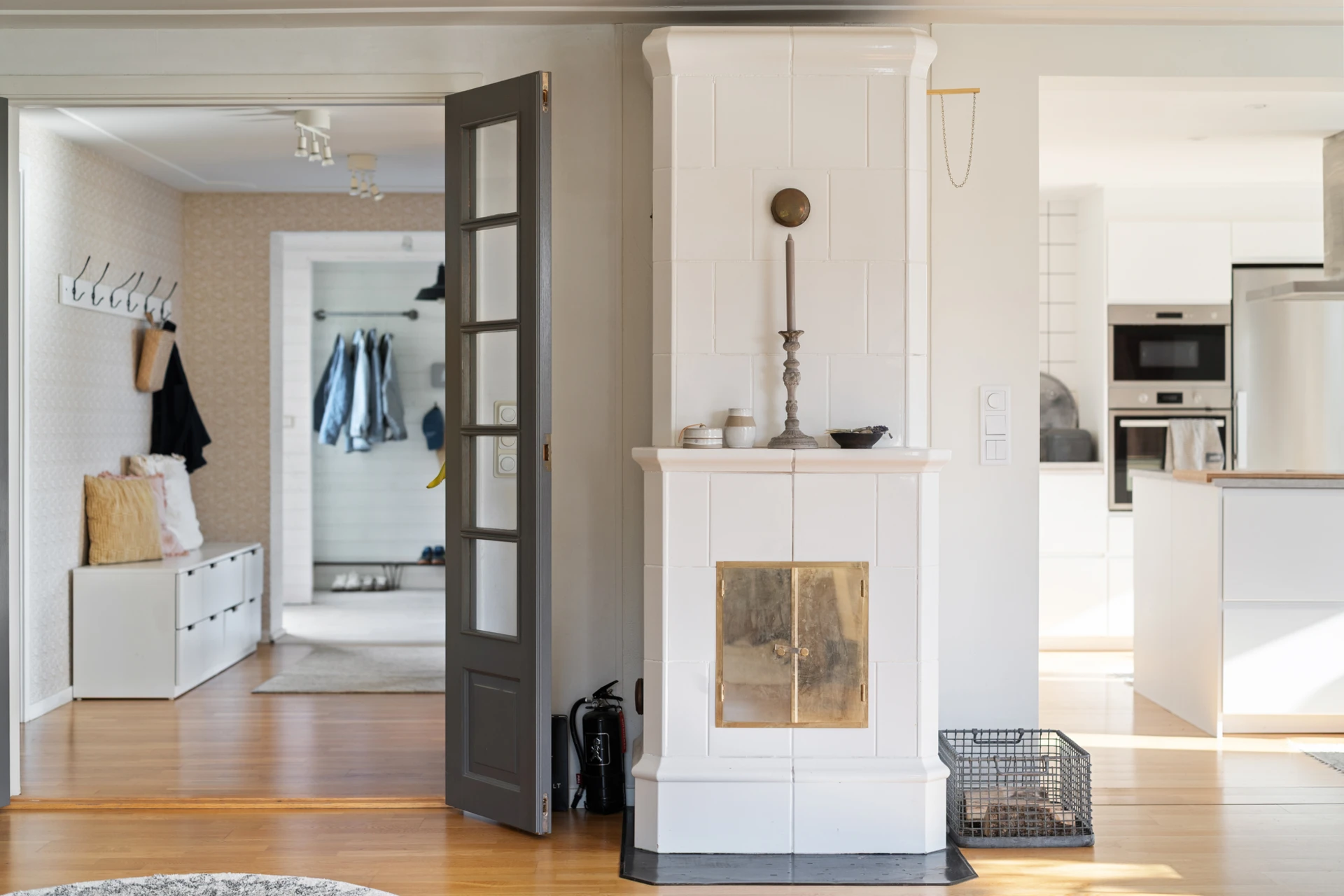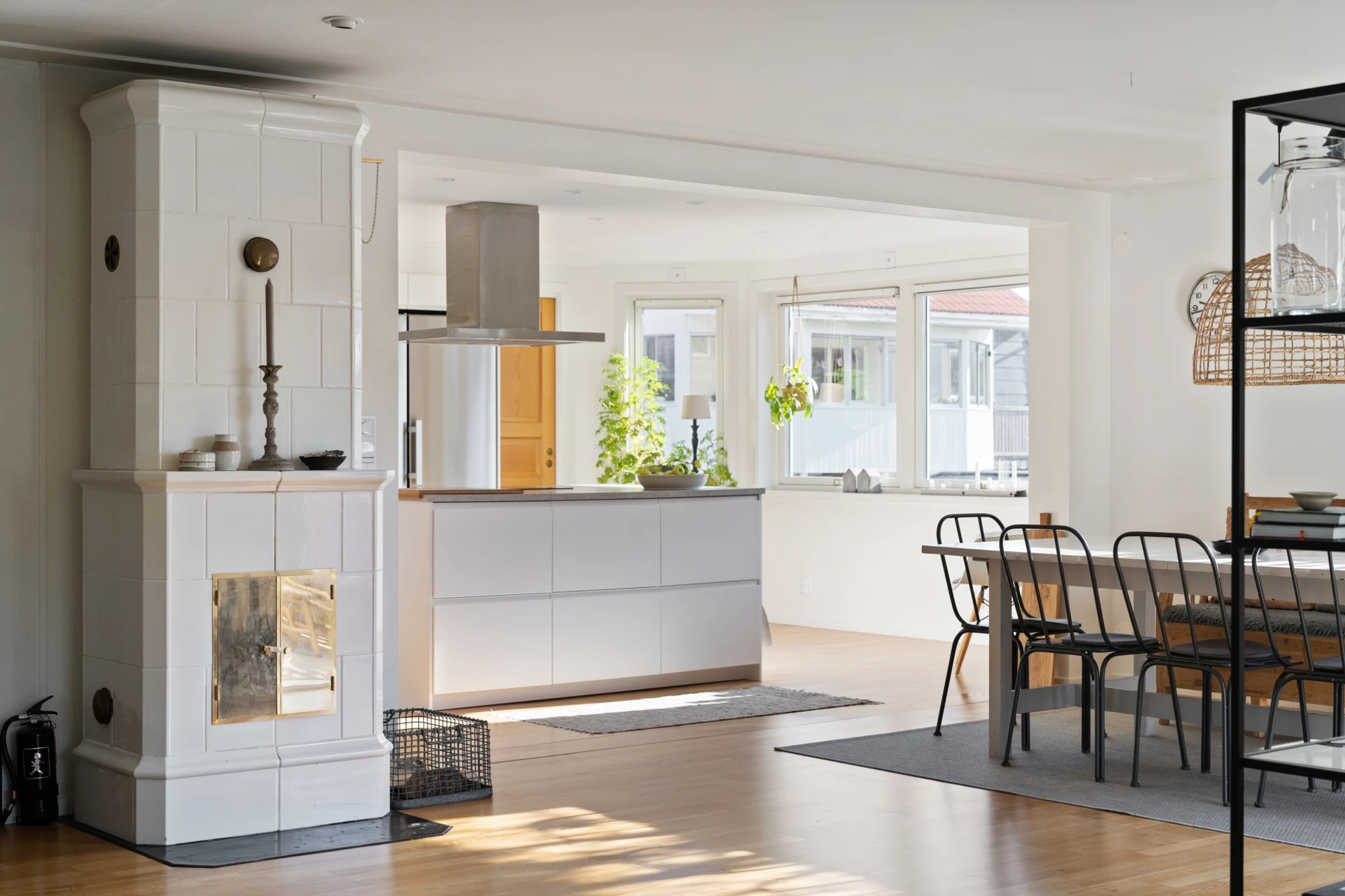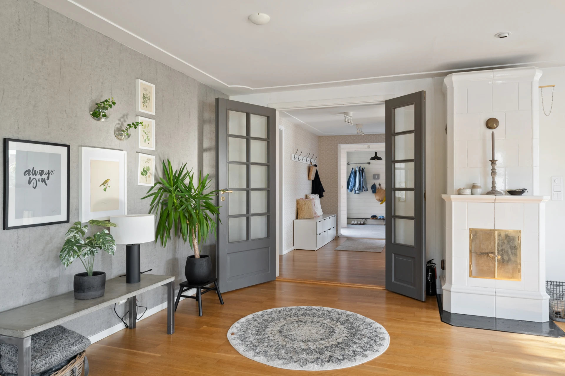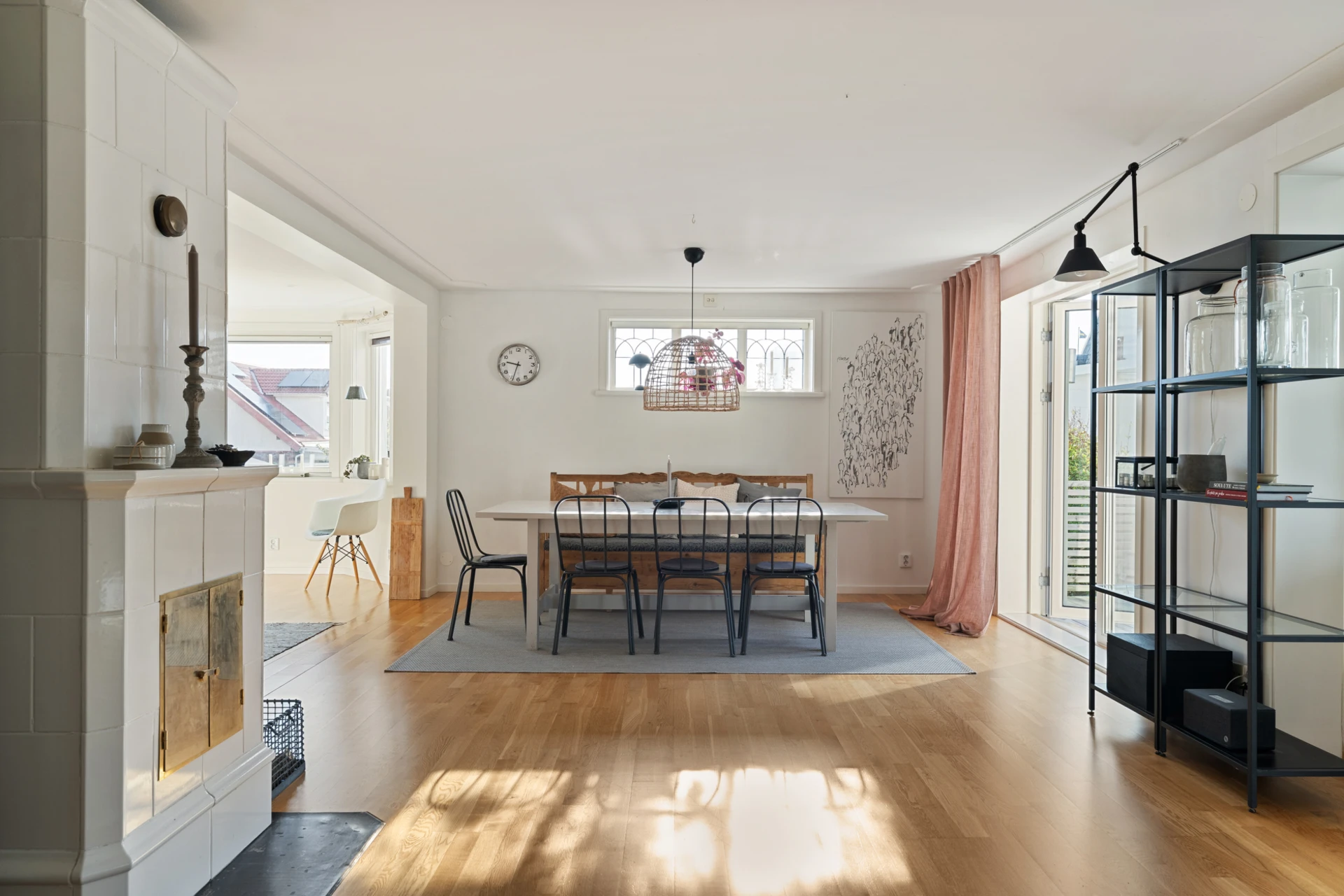 Parkettgolv med golvvärme och vitmålade väggar. Här finns utrymme för soffgrupp med tillhörande möblemang. Vacker kakelugn pryder rummet.