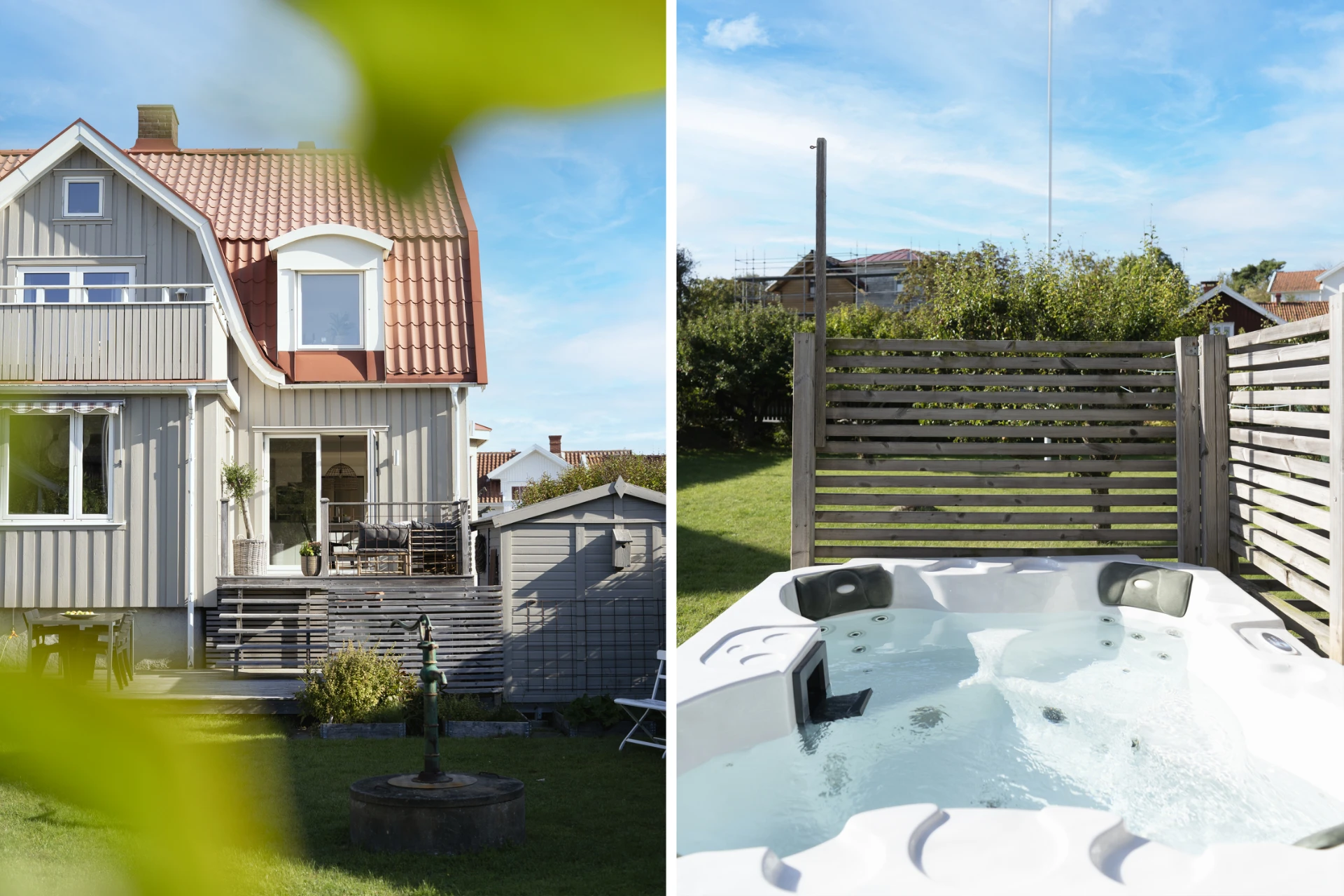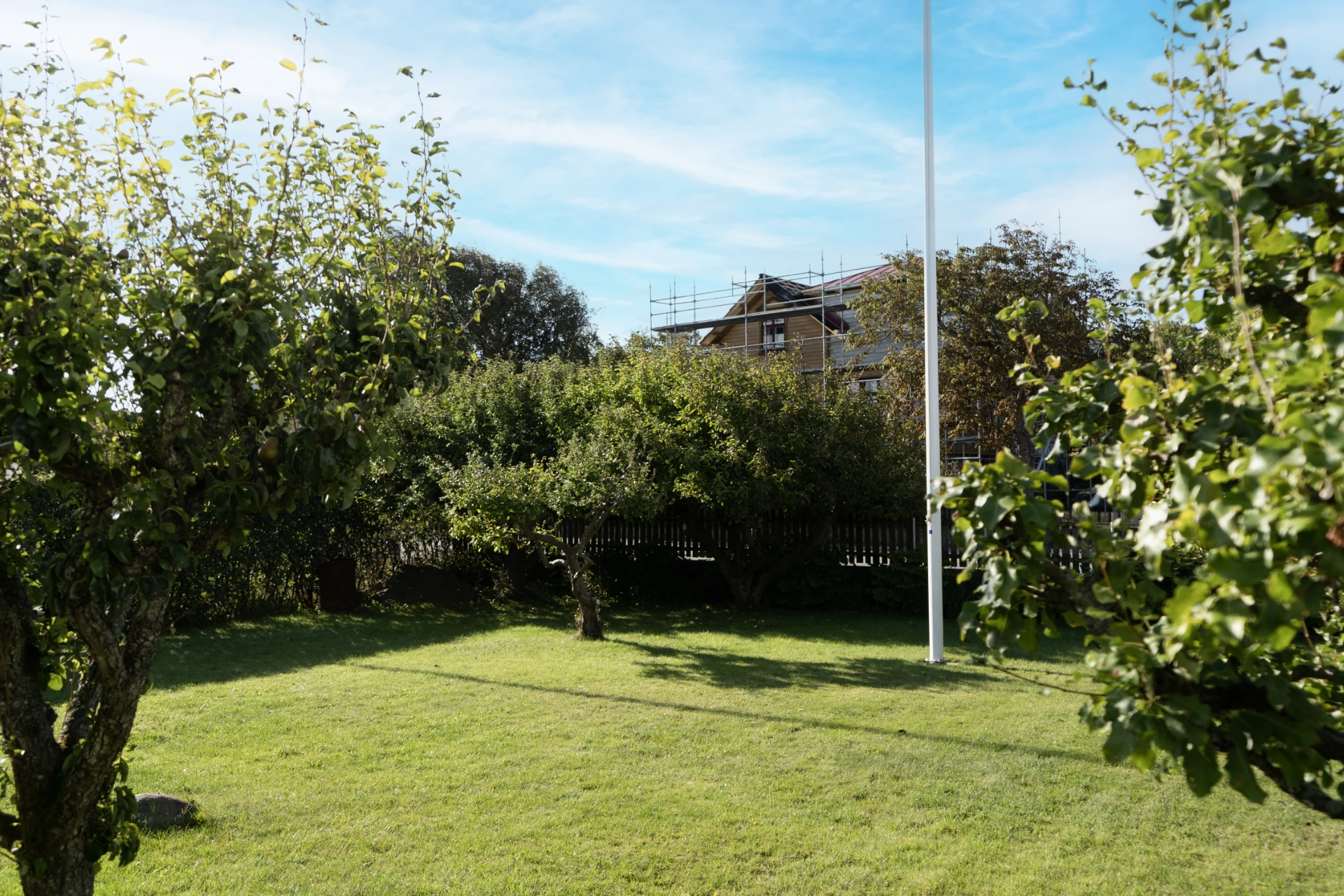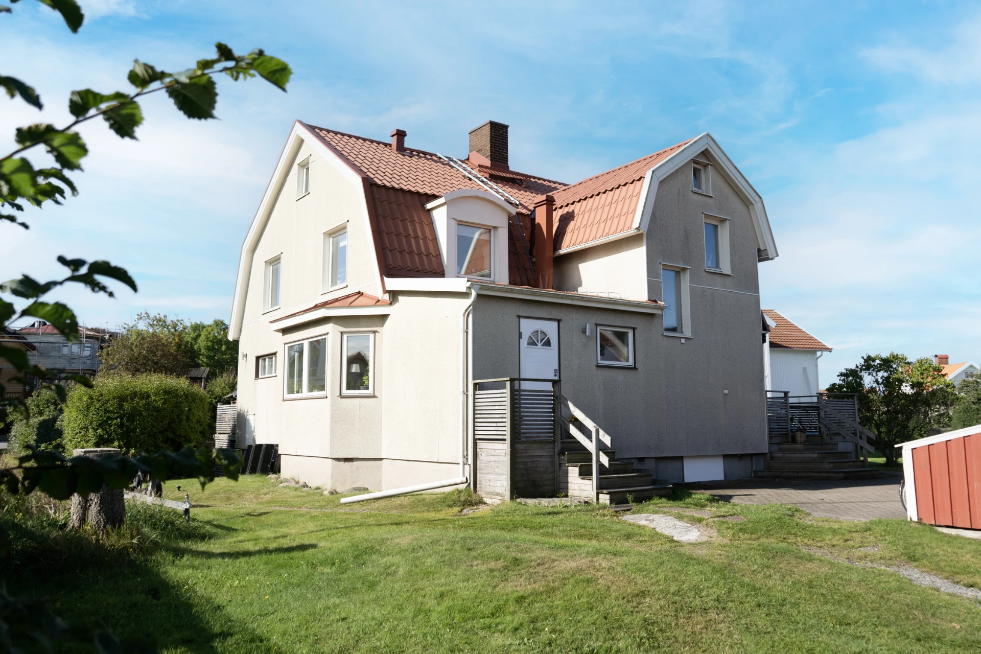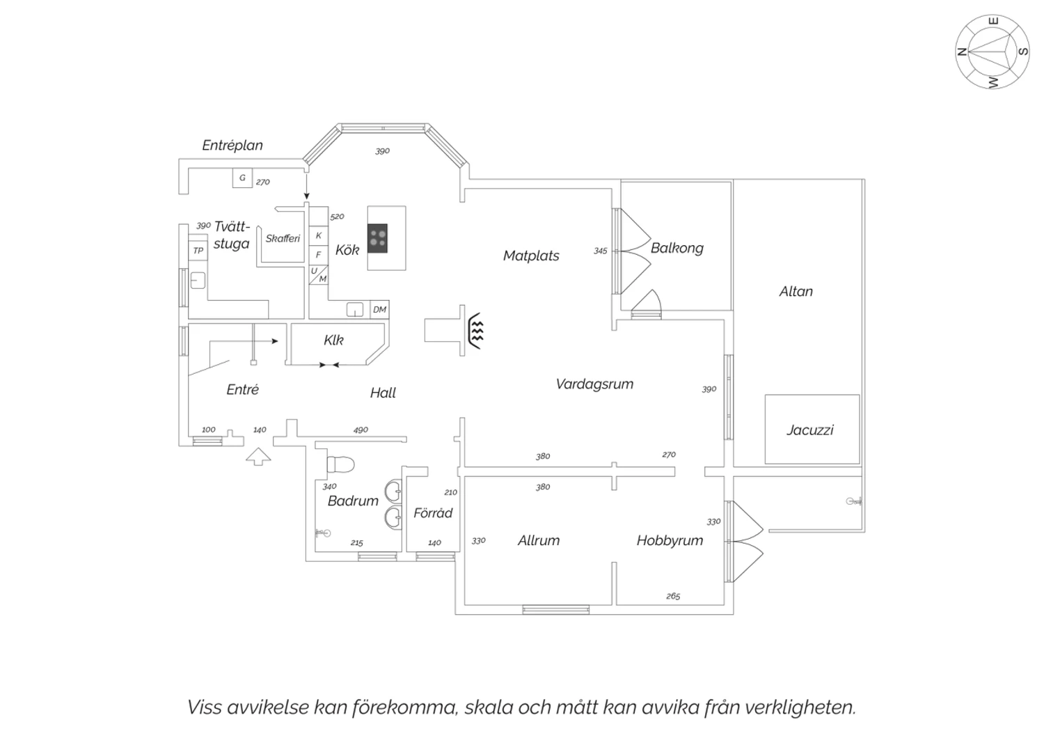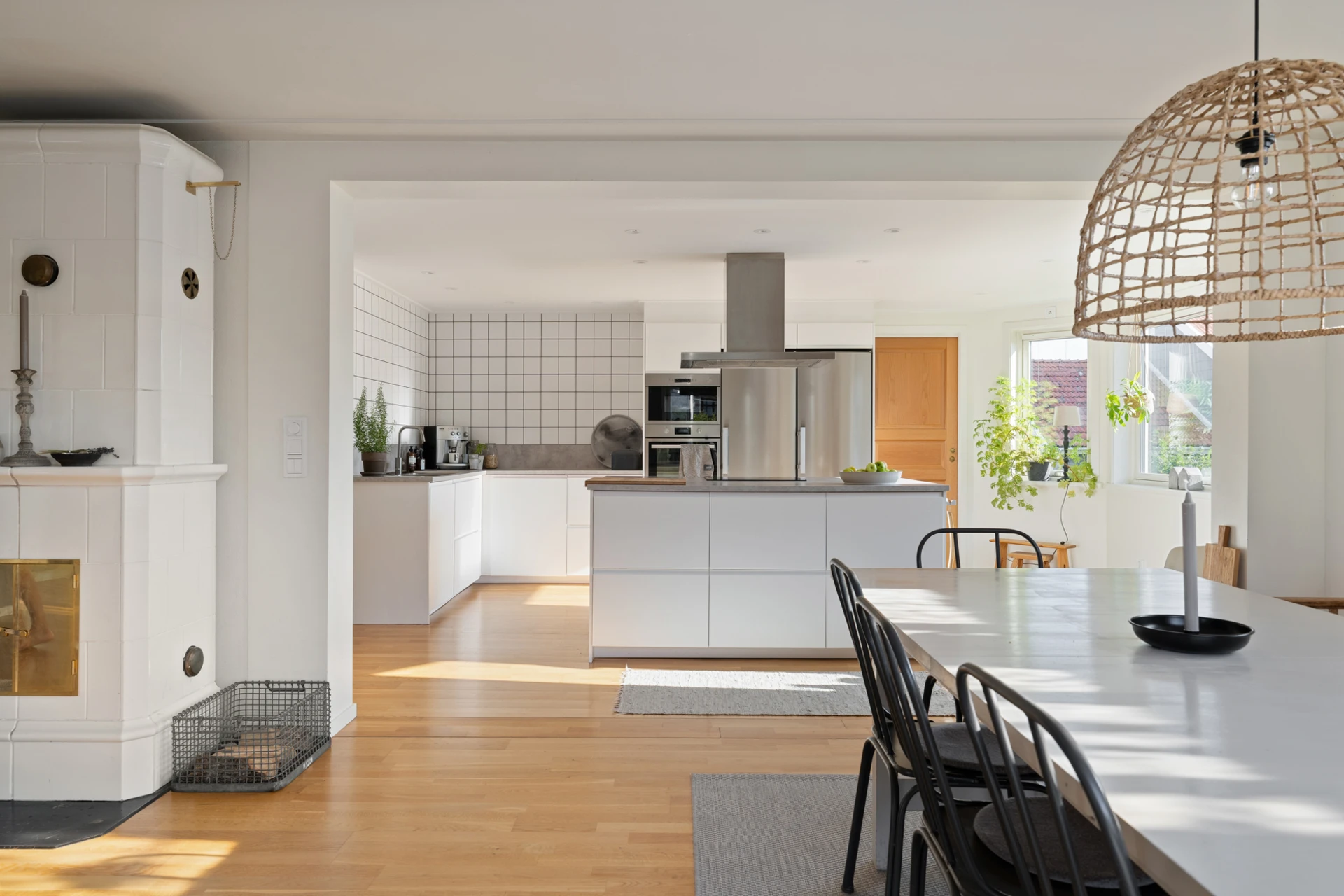Parkettgolv med golvvärme och vitmålade väggar. Här finns utrymme för soffgrupp med tillhörande möblemang. Vacker kakelugn pryder rummet.