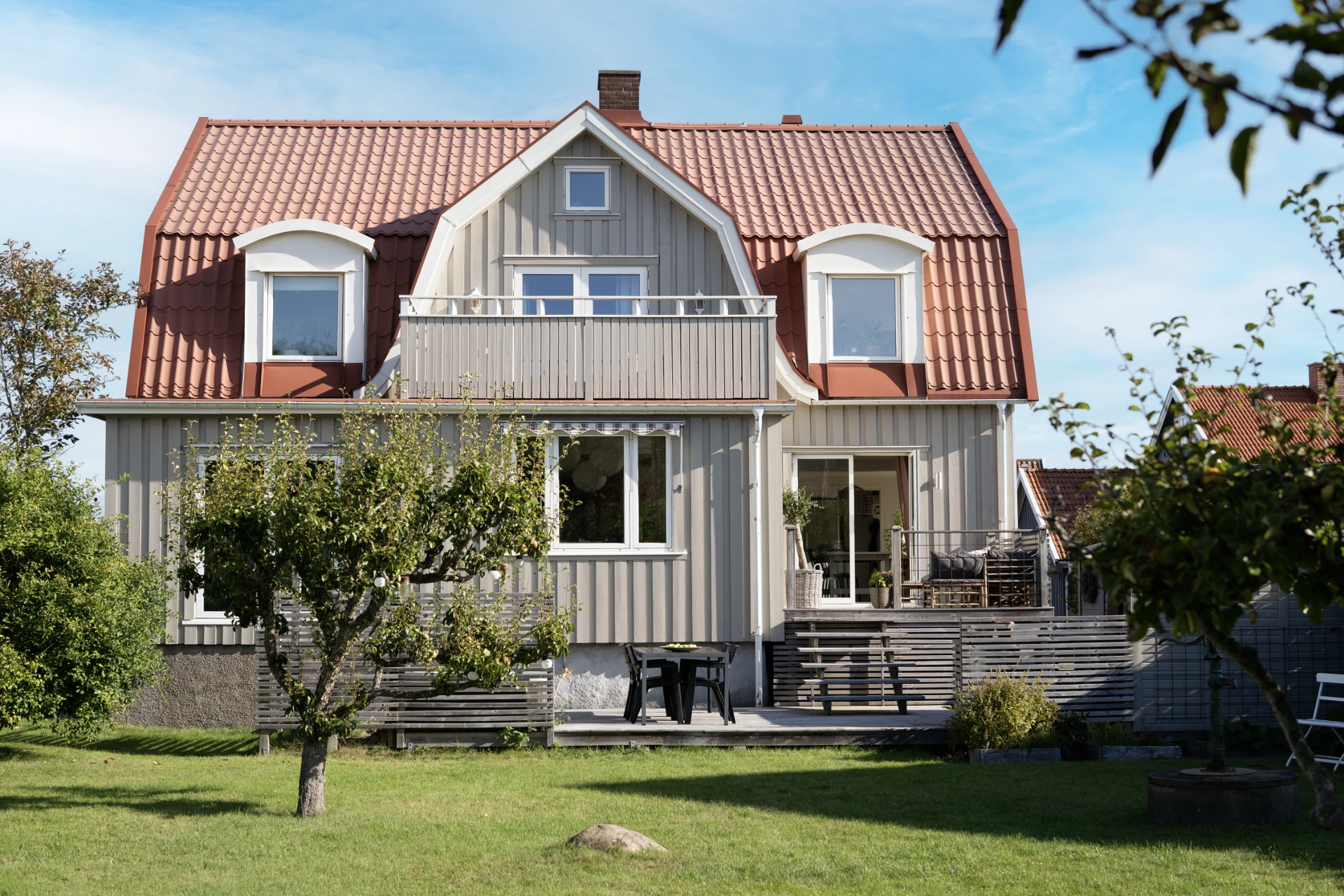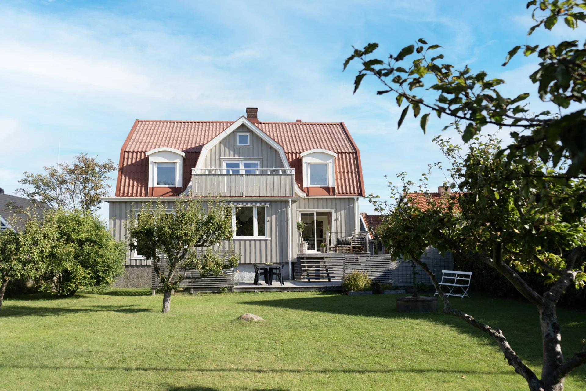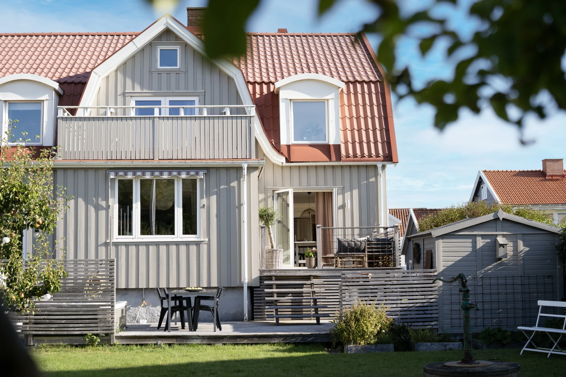 Plankgolv och vitmålade väggar med en grå fondvägg. Här finns plats för säng med tillhörande möblemang.