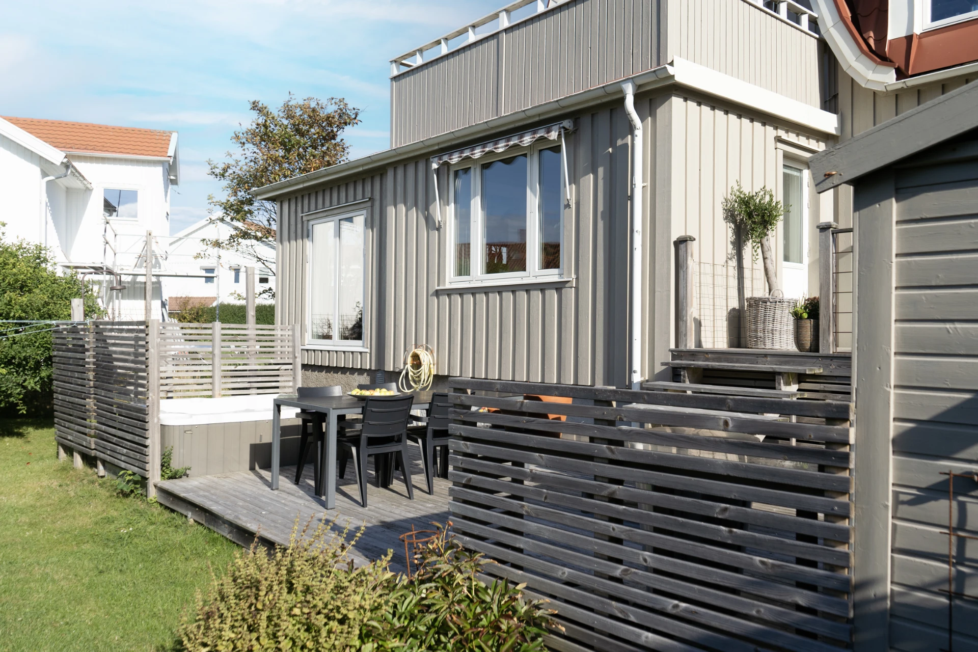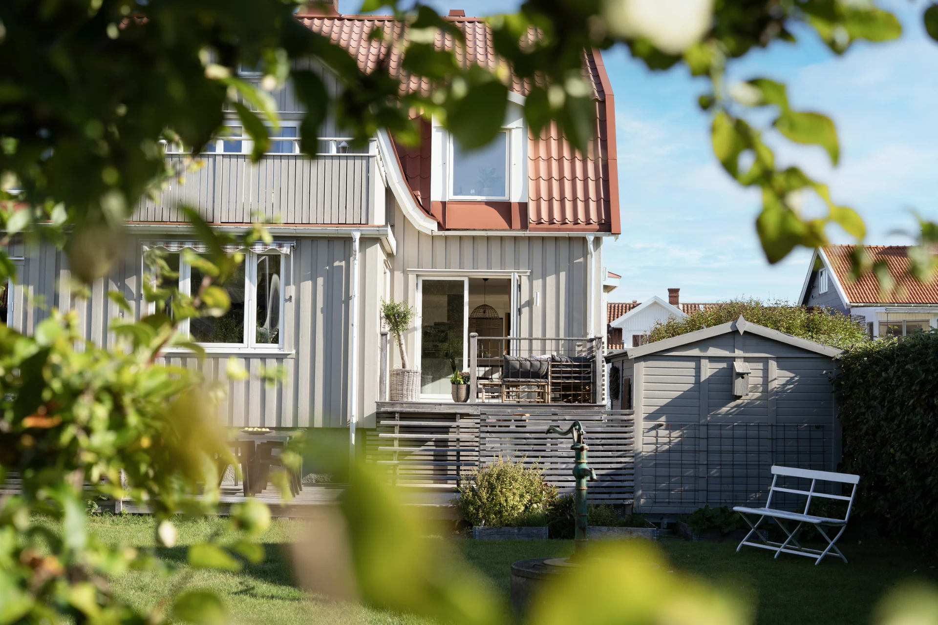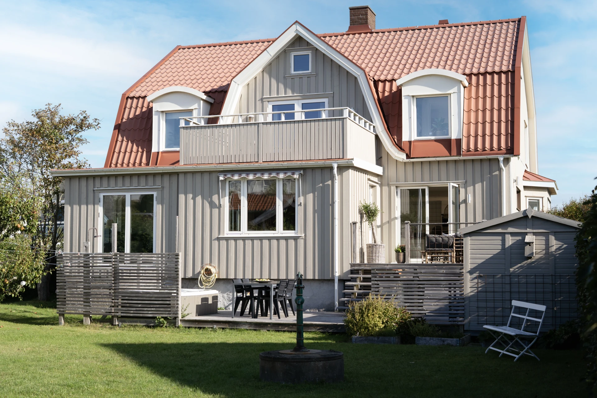 Plankgolv och vitmålade väggar med en grå fondvägg. Här finns plats för säng med tillhörande möblemang.