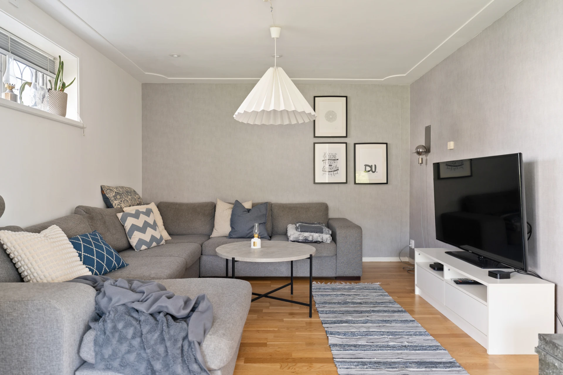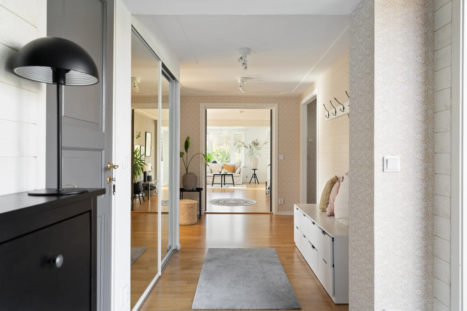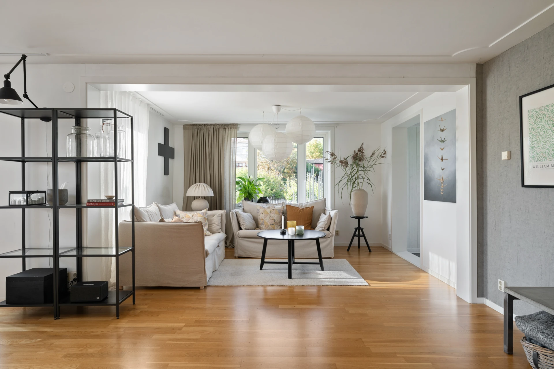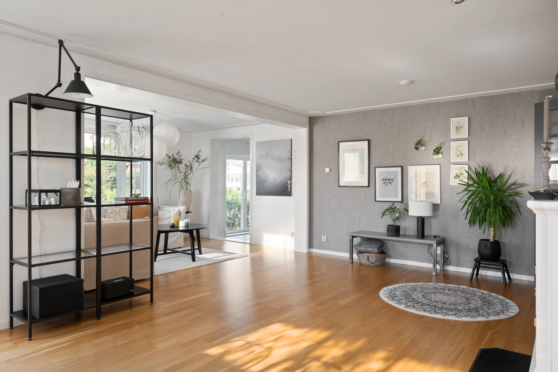 Parkettgolv med golvvärme och vitmålade väggar med en tapetserad fondvägg. Här finns utrymme för soffgrupp eller annat önskvärt möblemang.