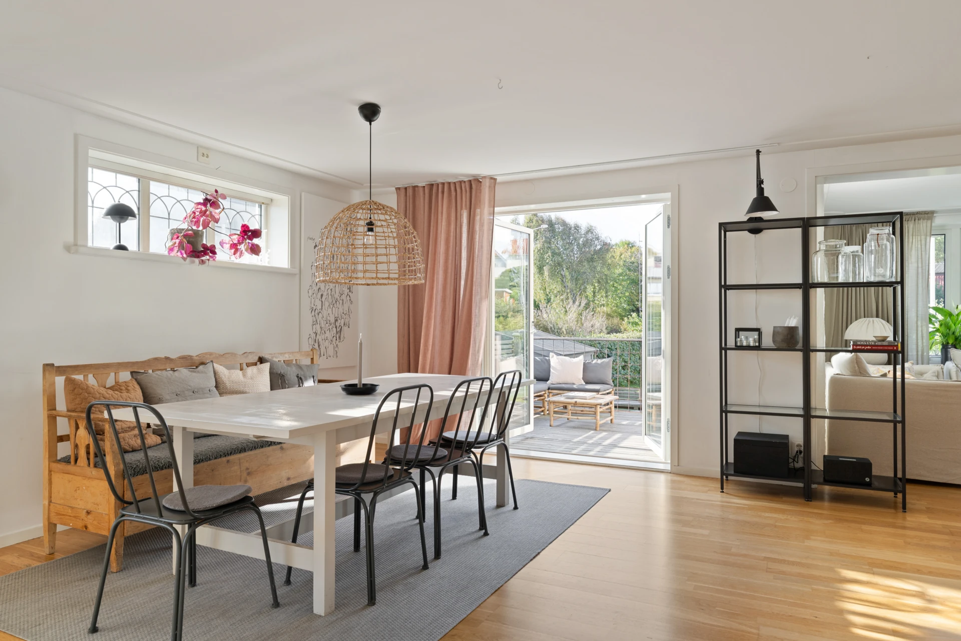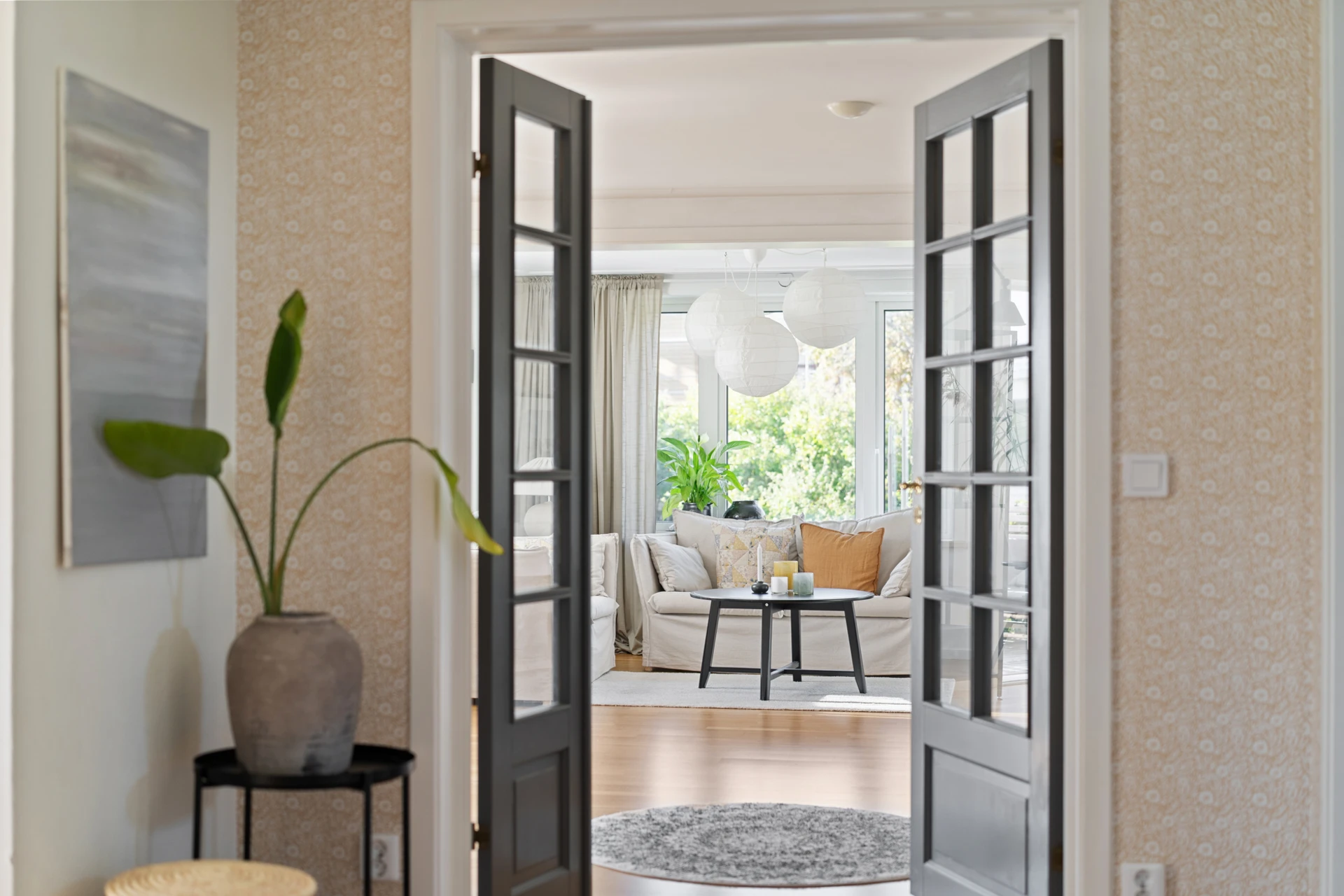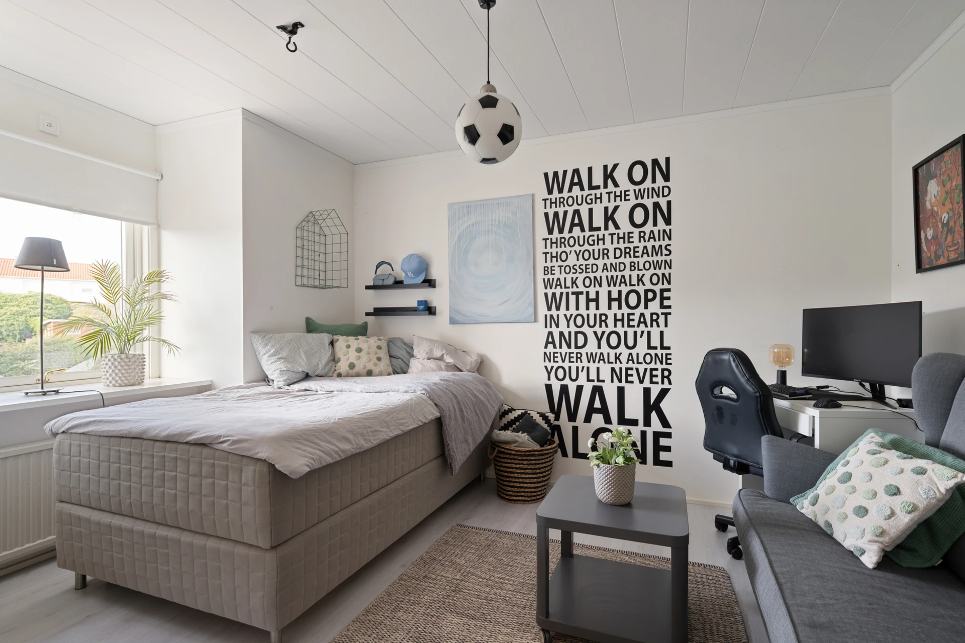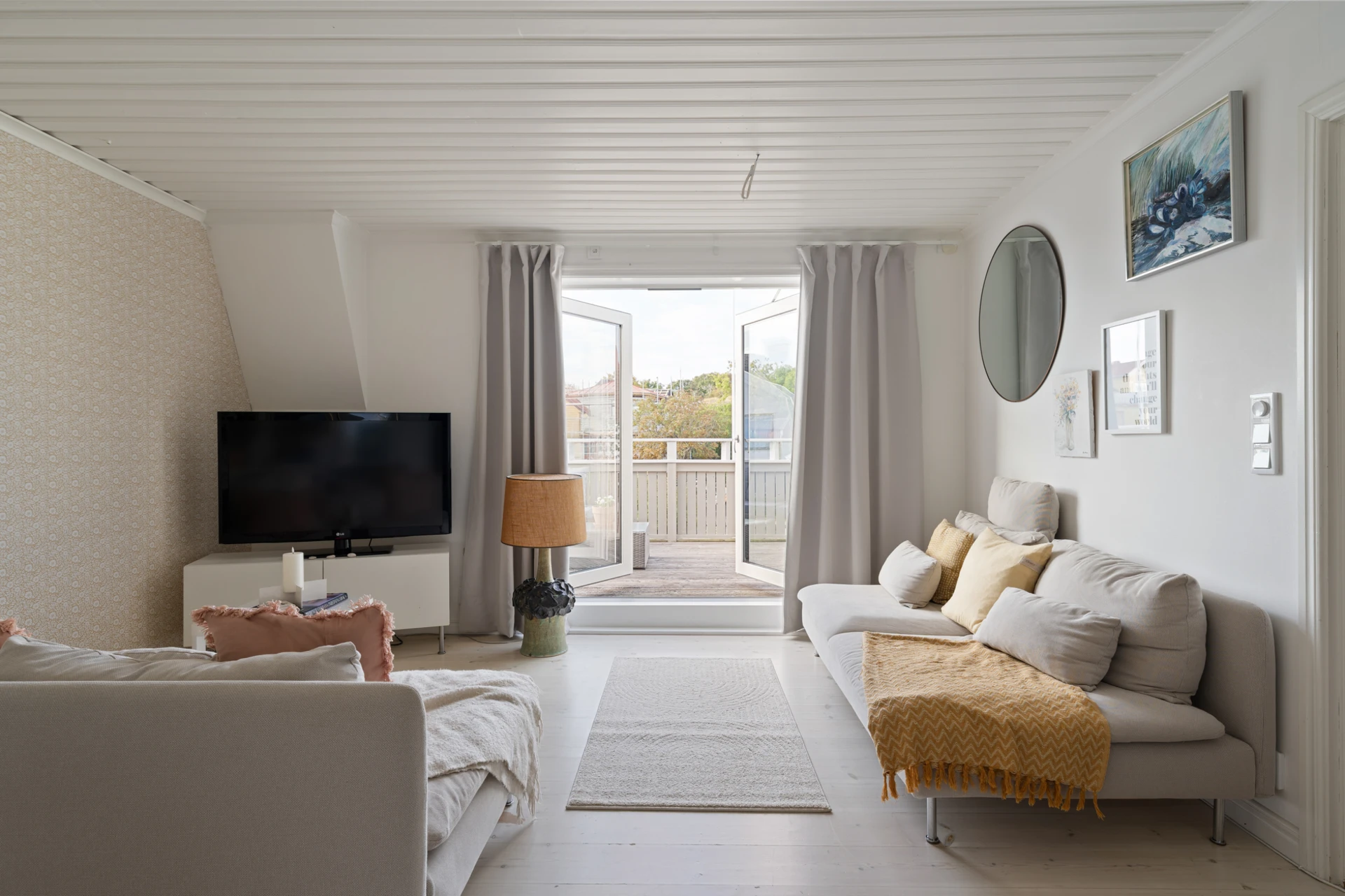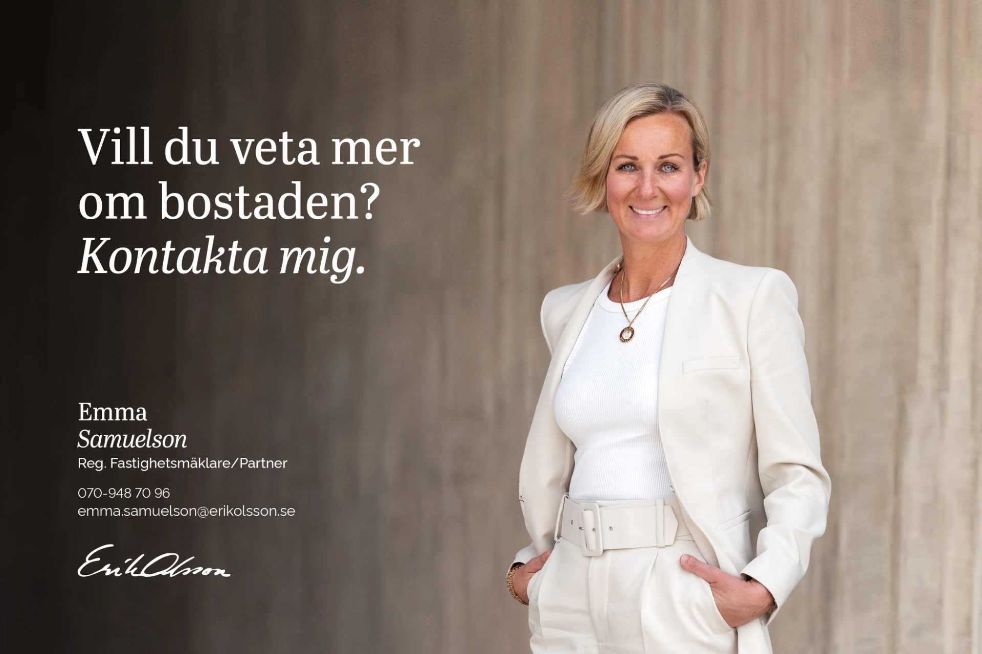 Parkettgolv med golvvärme och vitmålade väggar med en tapetserad fondvägg. Här finns utrymme för soffgrupp eller annat önskvärt möblemang.