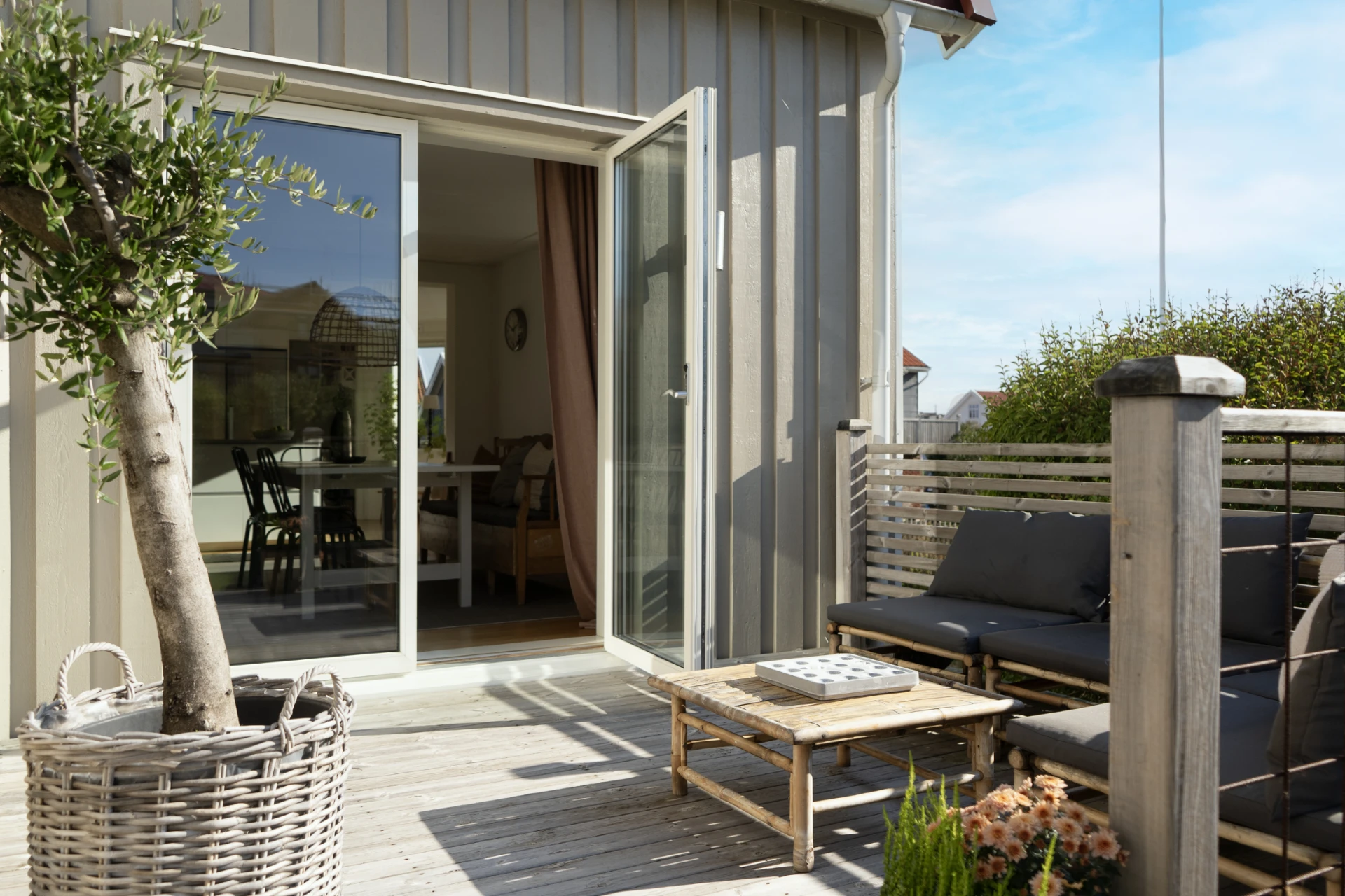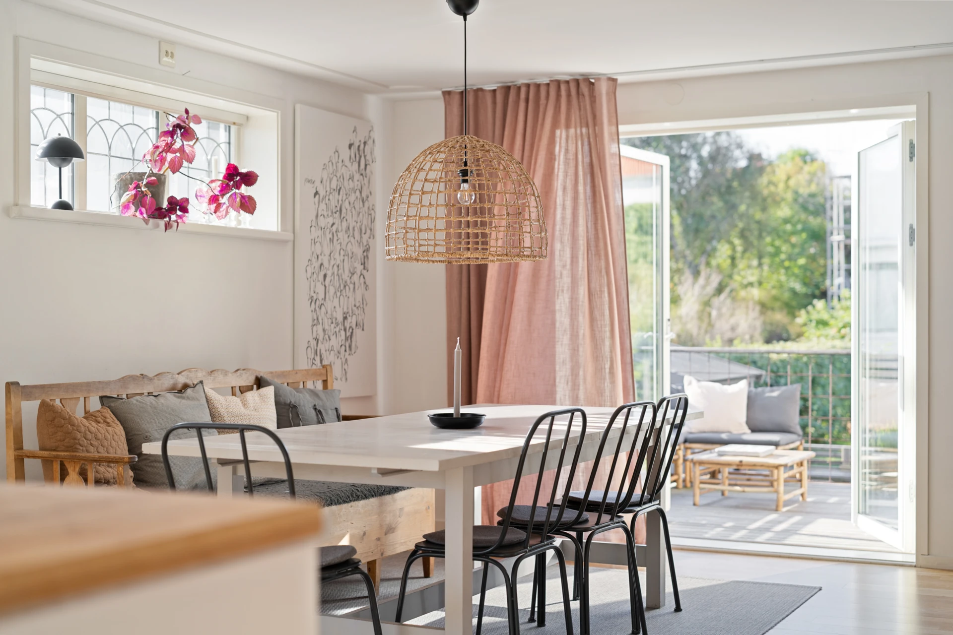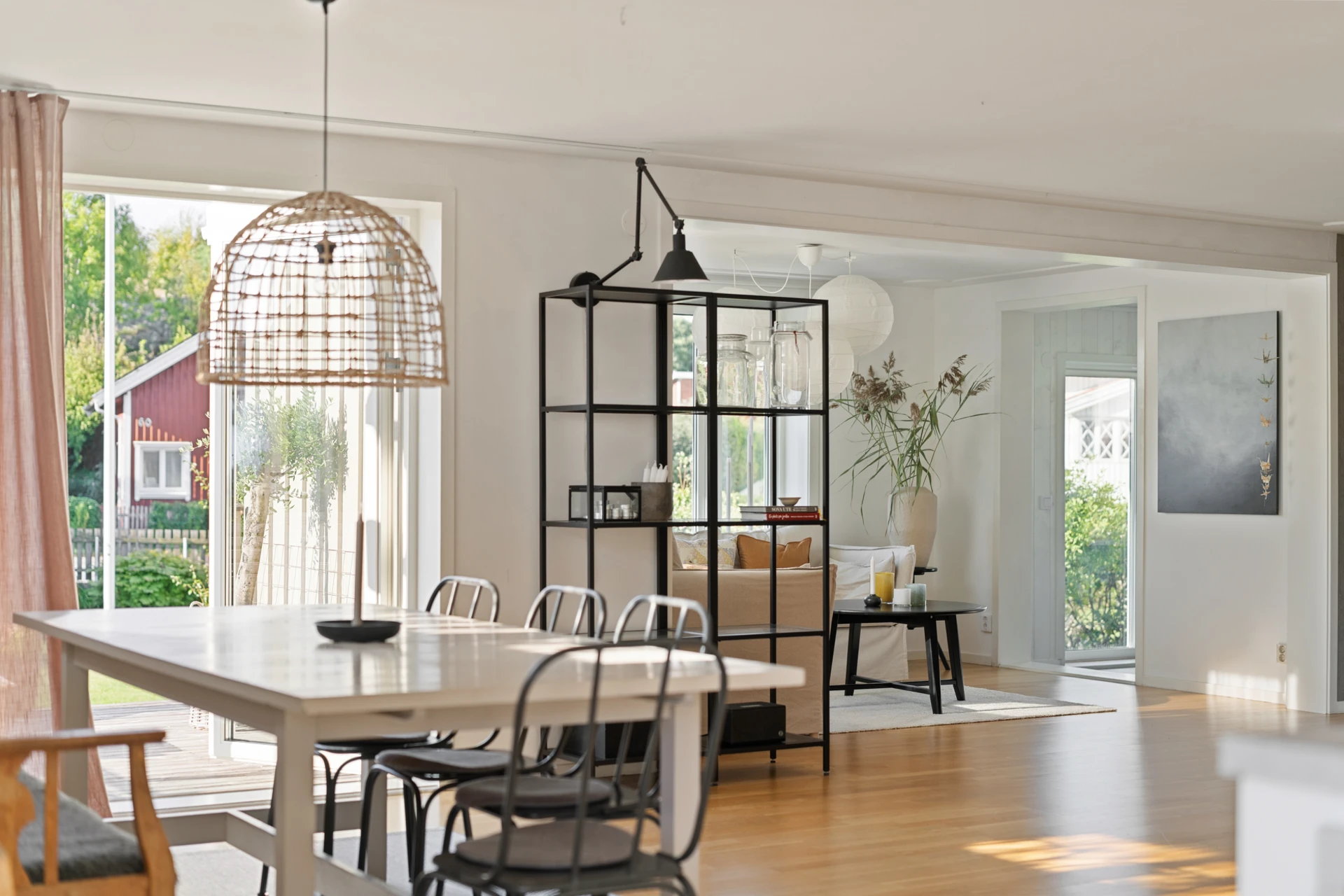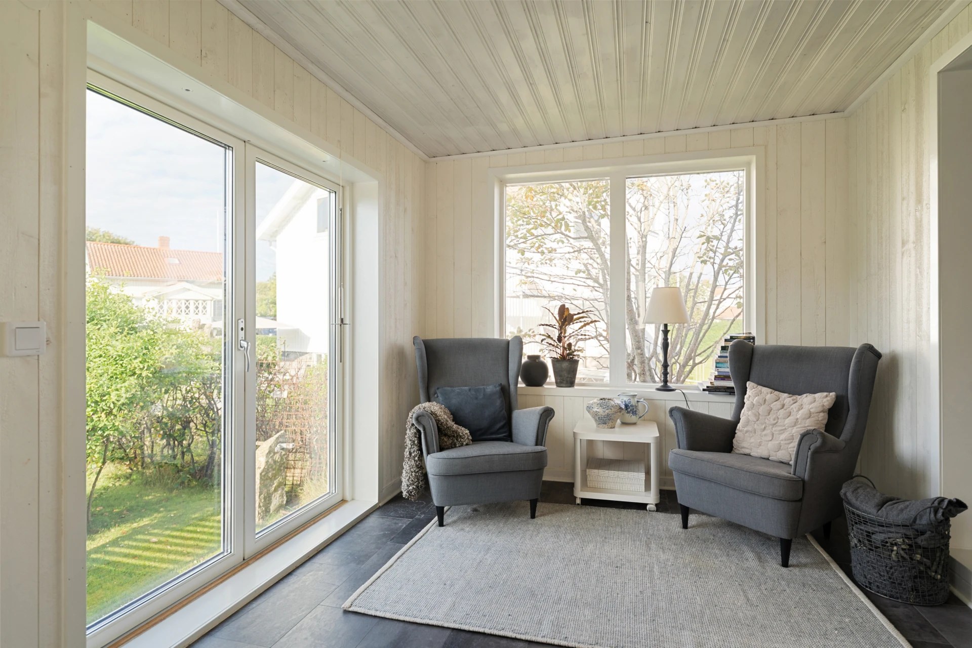 Parkettgolv med golvvärme och vitmålade väggar med en tapetserad fondvägg. Här finns utrymme för soffgrupp eller annat önskvärt möblemang.