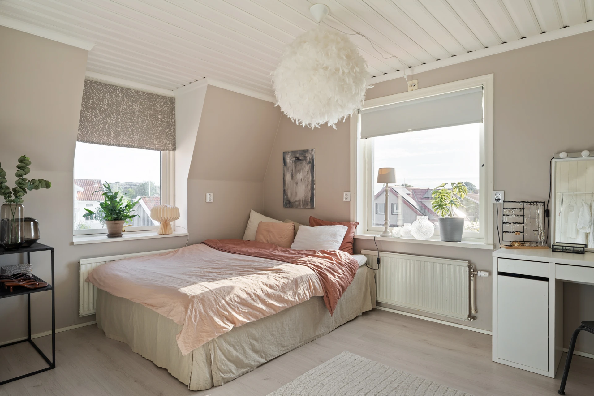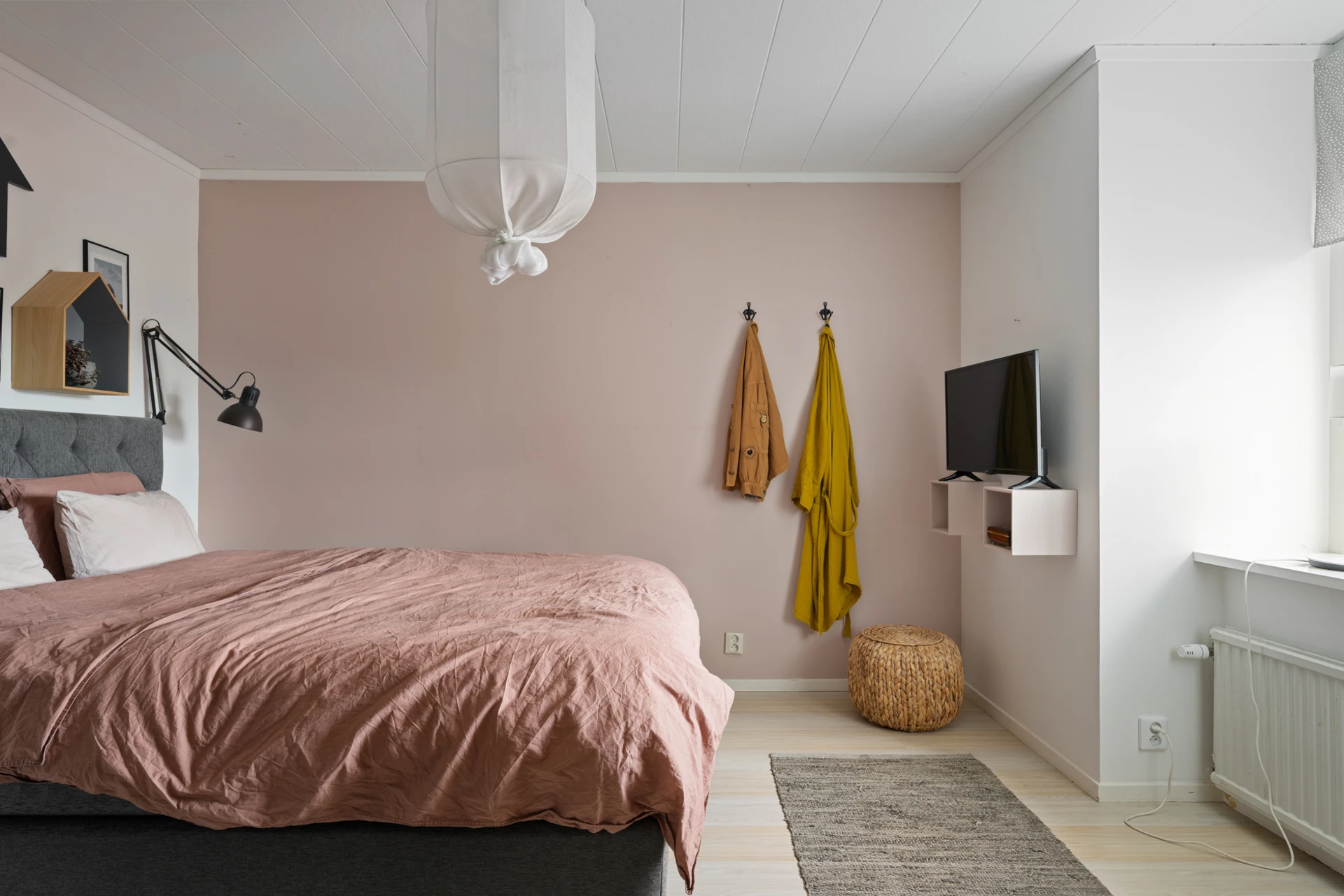 Laminatgolv och vitmålade väggar med en rosa fondvägg. Här finns plats för dubbelsäng med tillhörande sängbord. Förvaring i fem garderober.