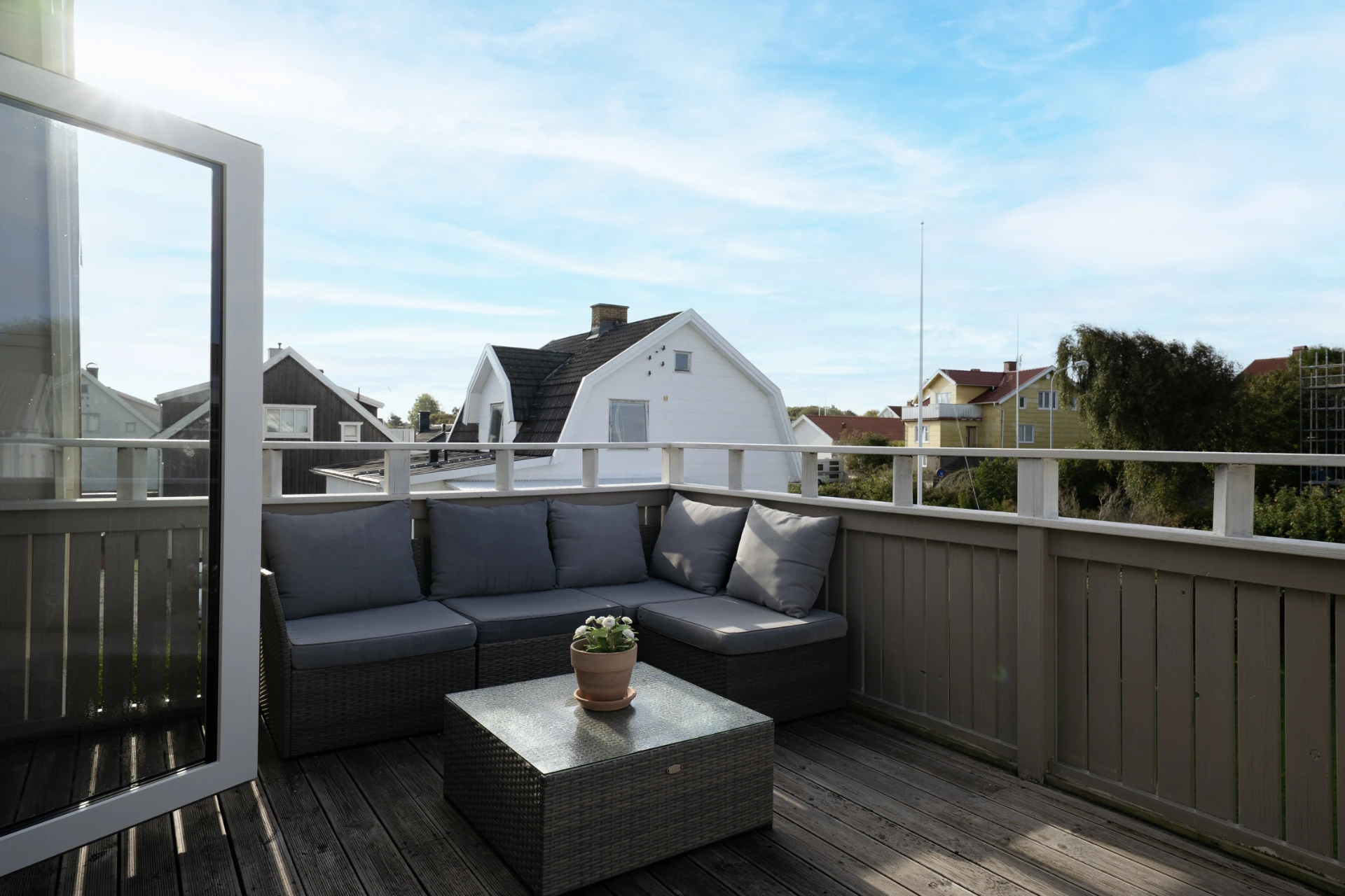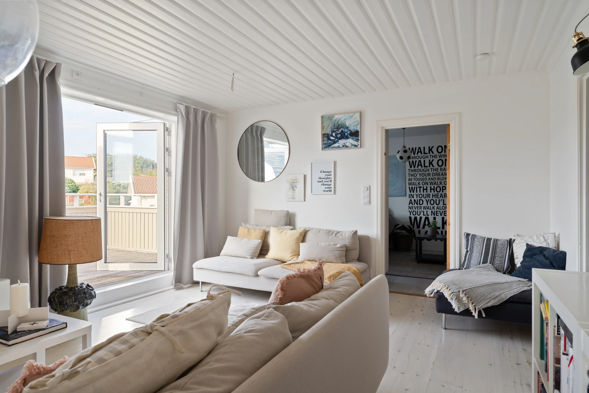 Parkettgolv och vitmålade väggar med en fondvägg i gulblommigt mönster. Här finns utrymme för soffgrupp eller annat önskvärt möblemang. Utgång till balkong.