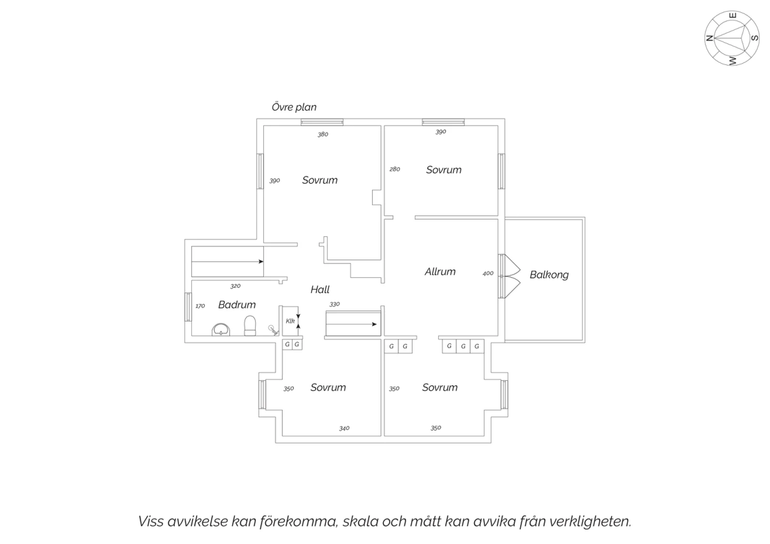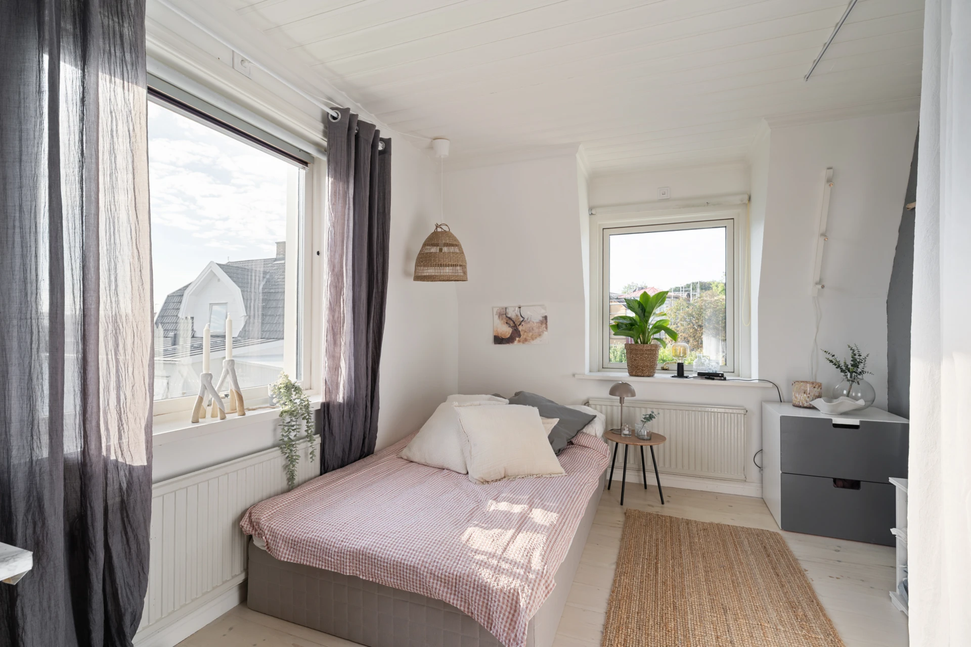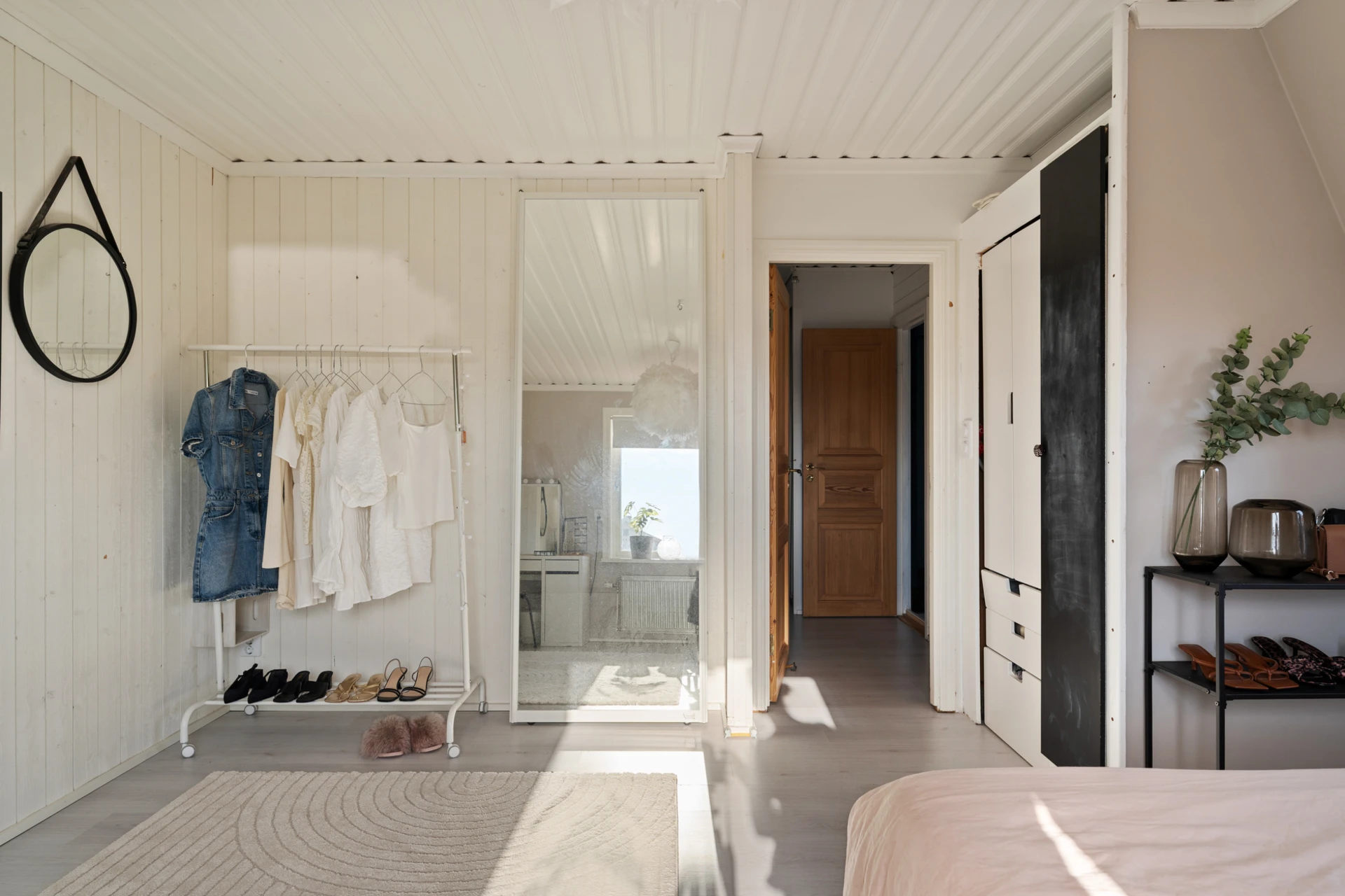 Laminatgolv och vitmålade väggar. Här finns plats för säng med tillhörande möblemang. Förvaring i fyra garderober.
