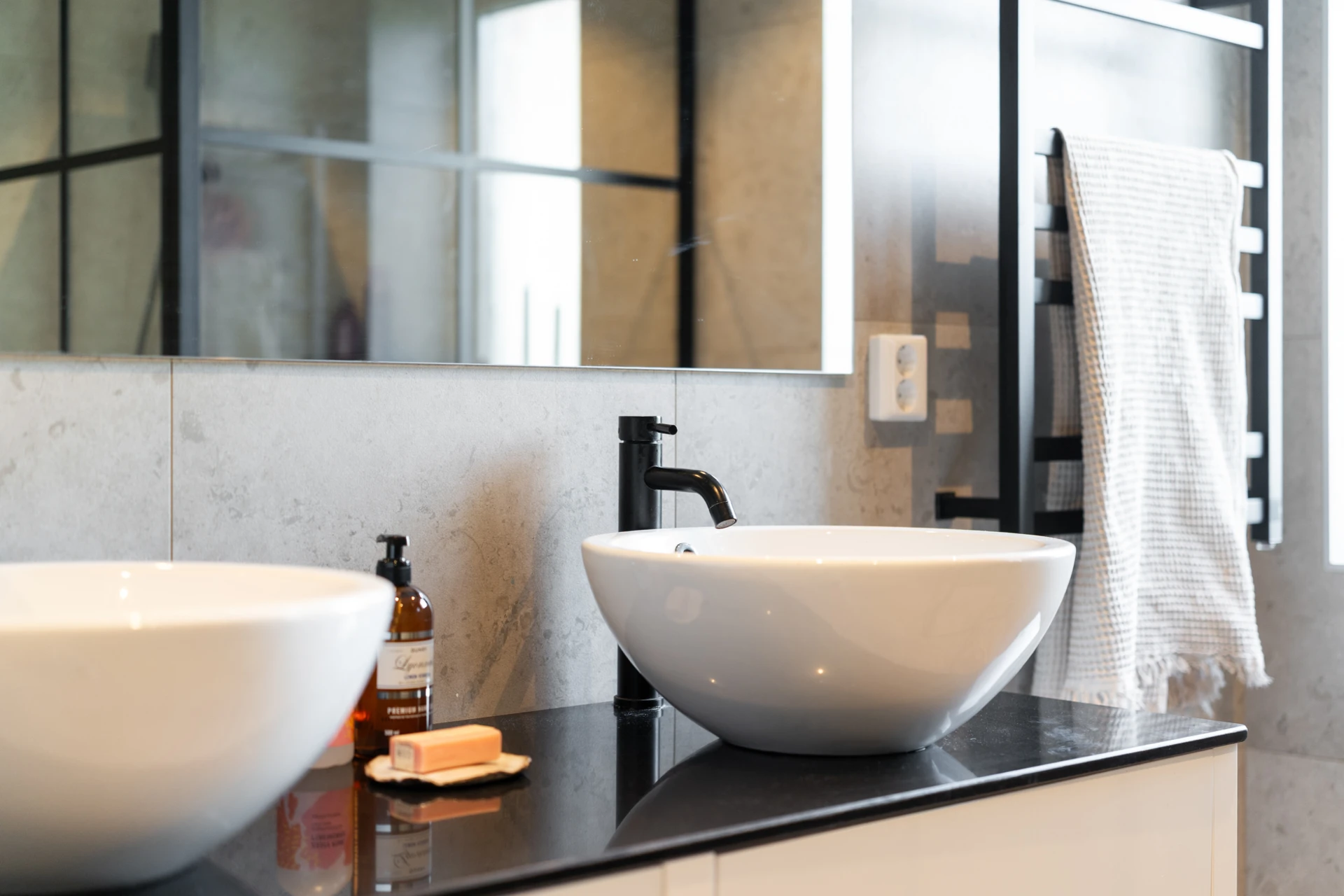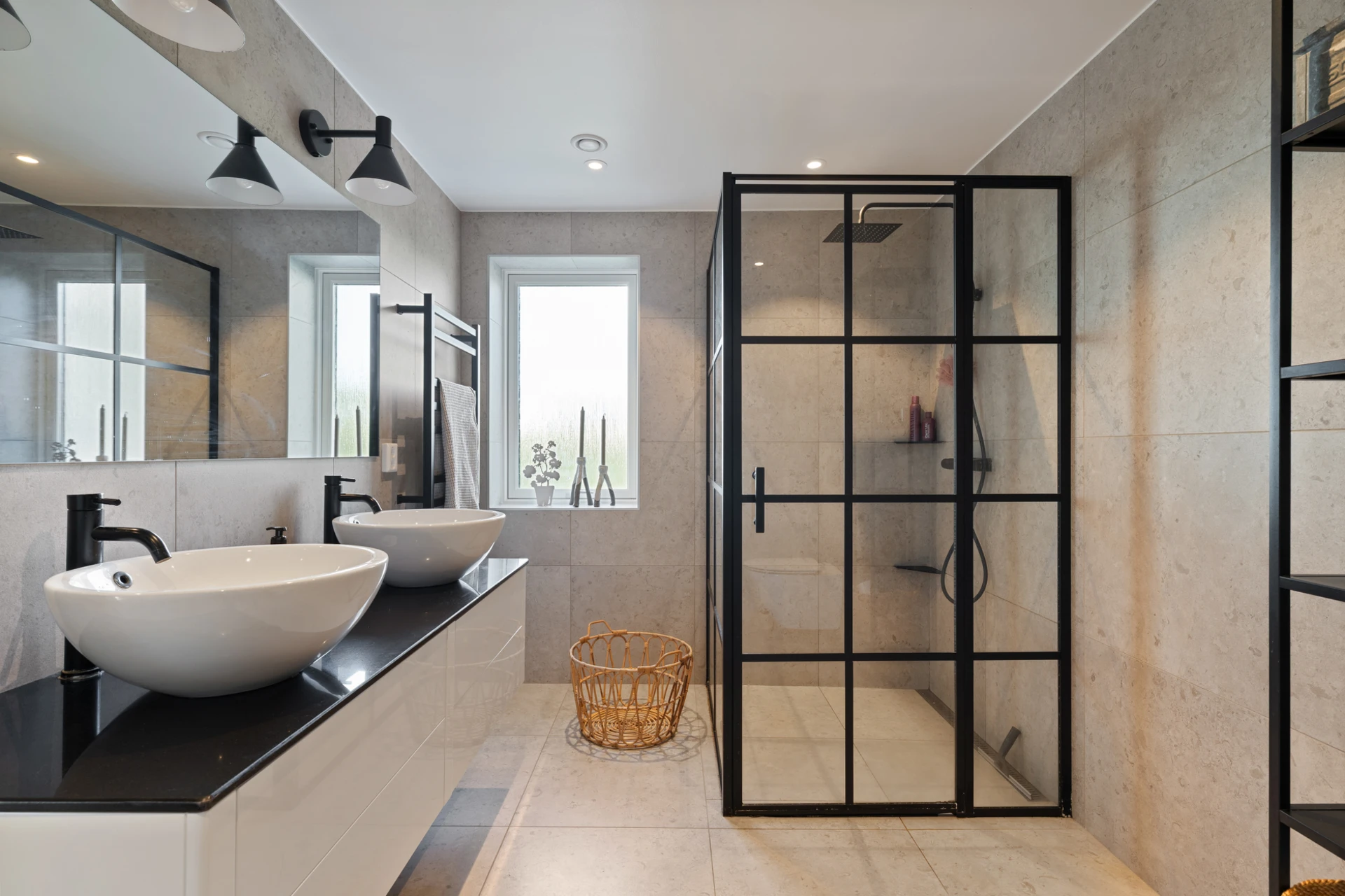 Klinkergolv med golvvärme och kaklade väggar i beige. Badrummet är inrett med vägghängd WC, dubbla handfat med kommod, spegel samt handdukstork. I taket sitter spotlights med dimmer.